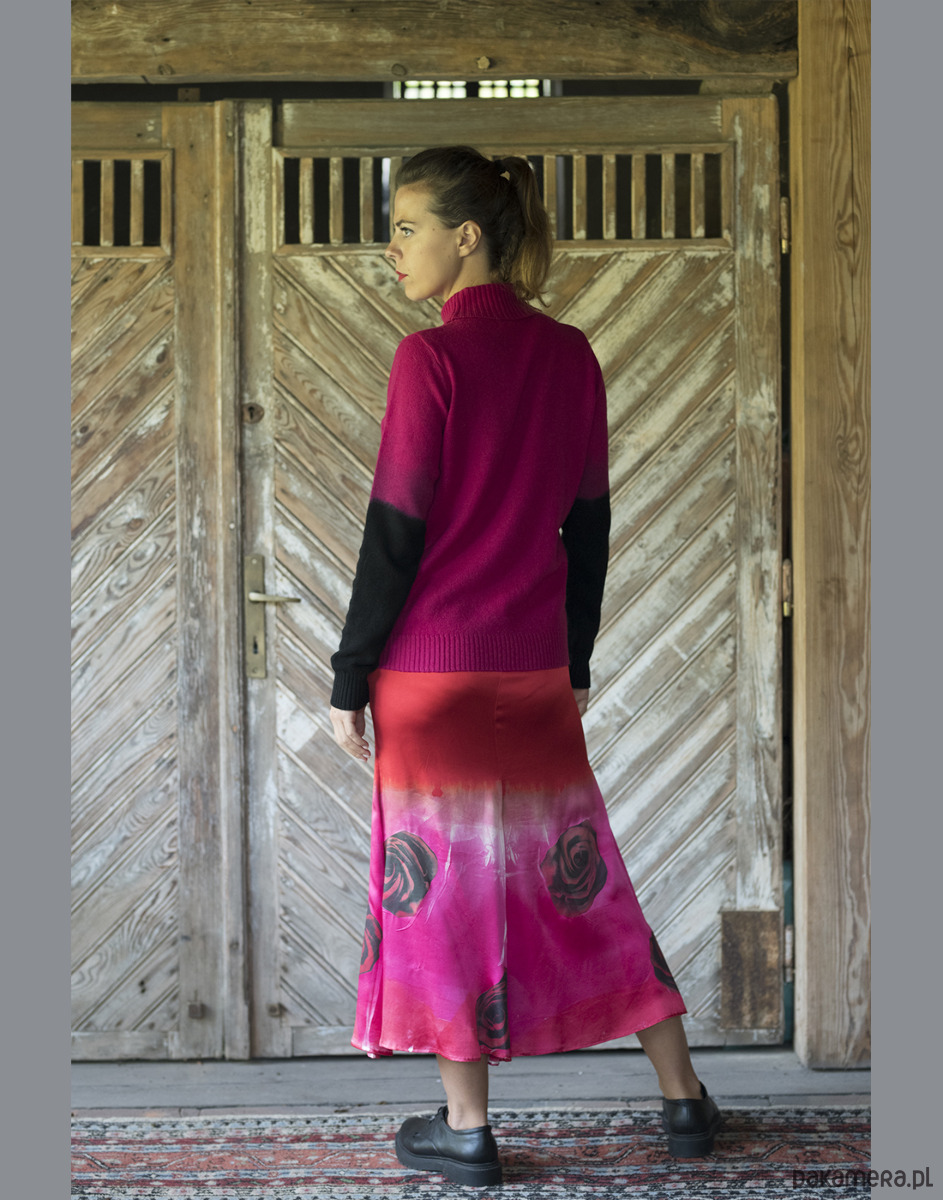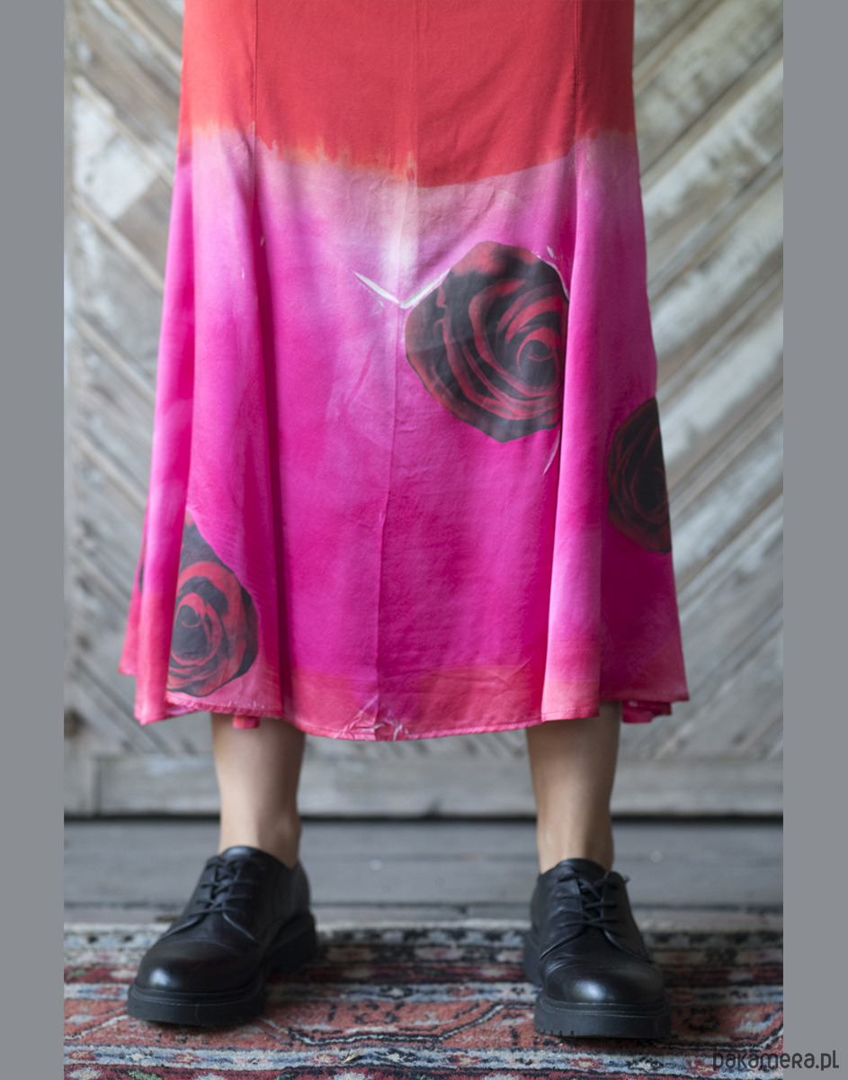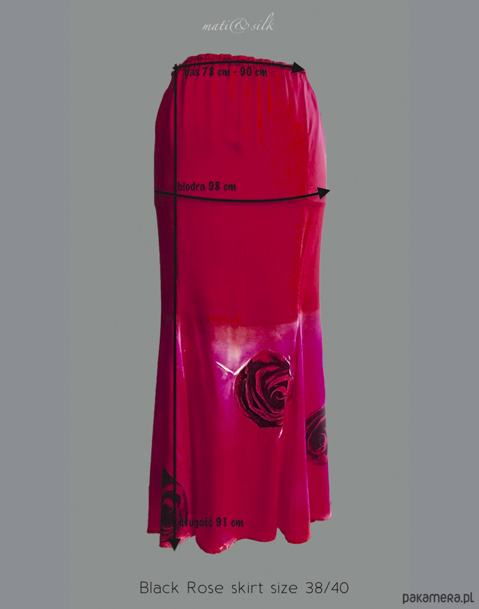 Jedwabna Spódnica maxi CZARNA RÓŻA ( Black Rose skirt ). Uszyta z atłasu jedwabnego ( 100% Silk ) Spódnica w kolorach amarantowej fuksji i czerwieni, drukowana w róże ( kolory niesamowite - tylko atłas jedwabny dzięki połyskowi daje się tak ufarbować ). Pasek w delikatną gumkę. Szyta z 4 klinów - dół rozkloszowany. Wymiary : długość całkowita 91 cm, pas w gumkę 78-88 cm, biodra max 98 cm. Spódnica nie naciąga się. Modelka ma rozmiar 36 .Top do niej wystawie wkrótce : ) Projekt i wykonanie Matylda Leśnikowska