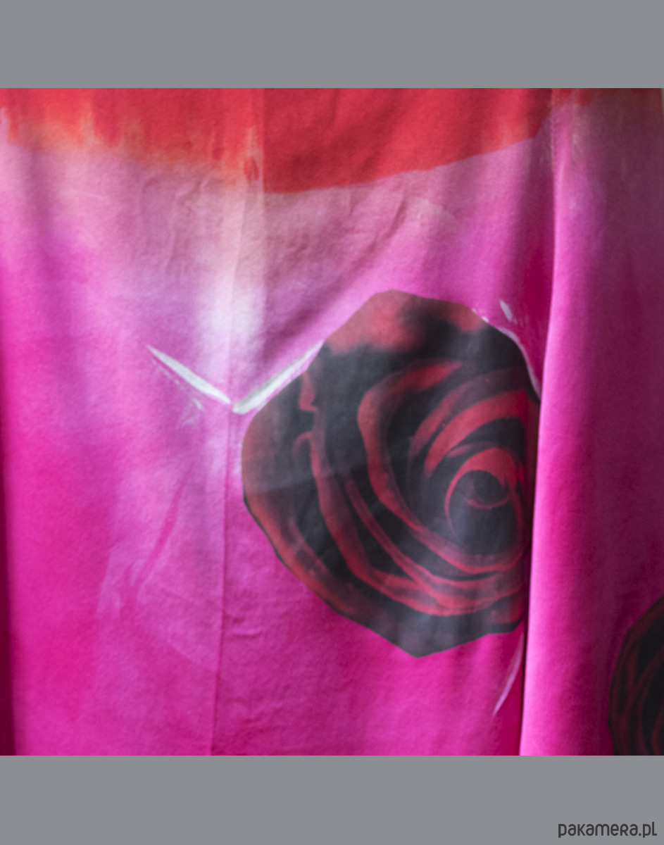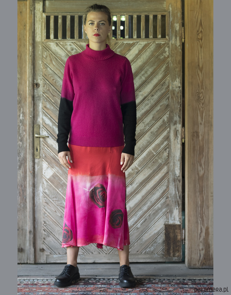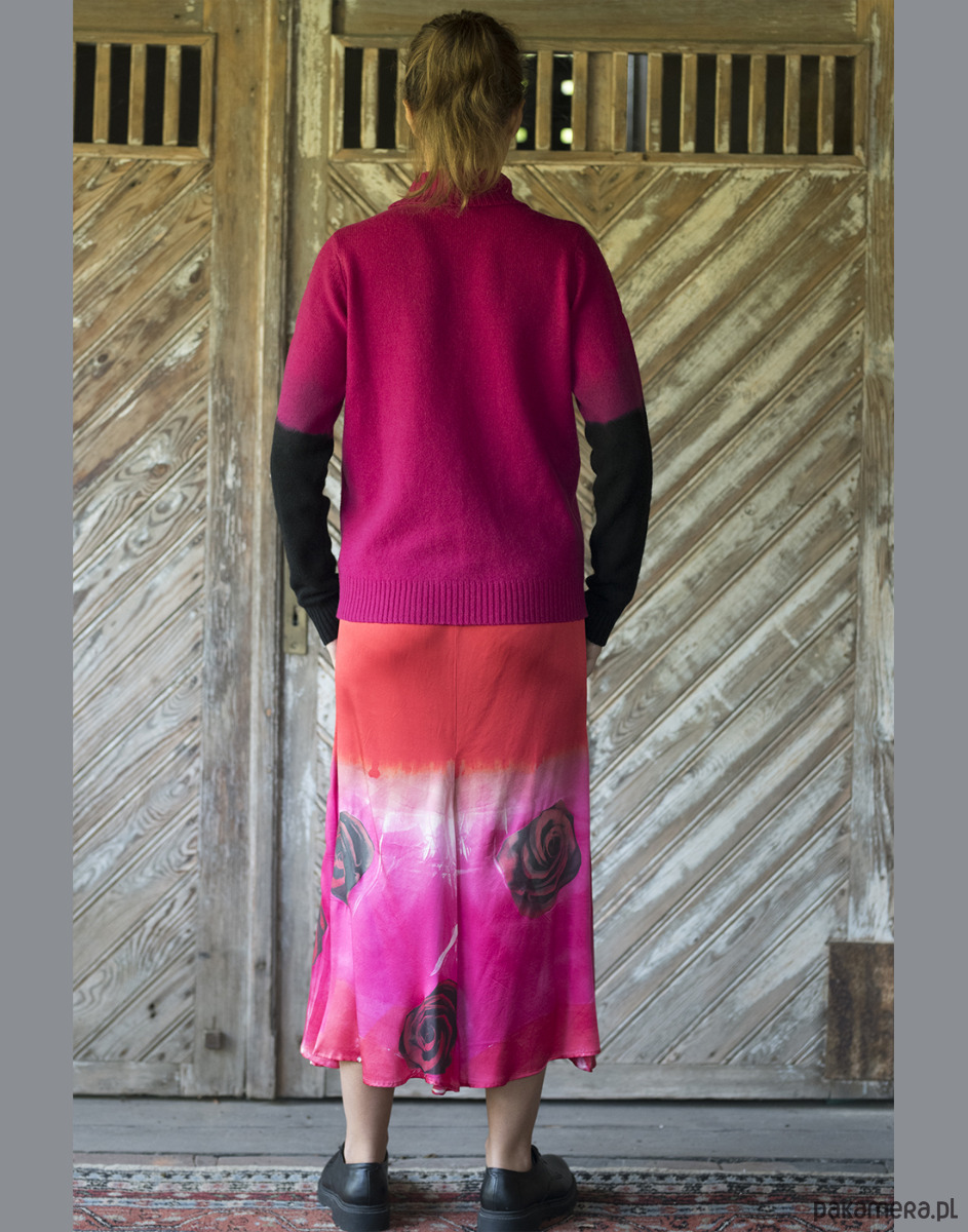 Jedwabna Spódnica maxi CZARNA RÓŻA ( Black Rose skirt ). Uszyta z atłasu jedwabnego ( 100% Silk ) Spódnica w kolorach amarantowej fuksji i czerwieni, drukowana w róże ( kolory niesamowite - tylko atłas jedwabny dzięki połyskowi daje się tak ufarbować ). Pasek w delikatną gumkę. Szyta z 4 klinów - dół rozkloszowany. Wymiary : długość całkowita 91 cm, pas w gumkę 78-88 cm, biodra max 98 cm. Spódnica nie naciąga się. Modelka ma rozmiar 36 .Top do niej wystawie wkrótce : ) Projekt i wykonanie Matylda Leśnikowska