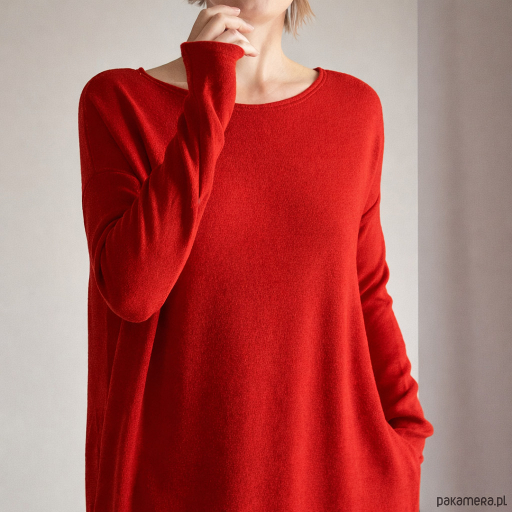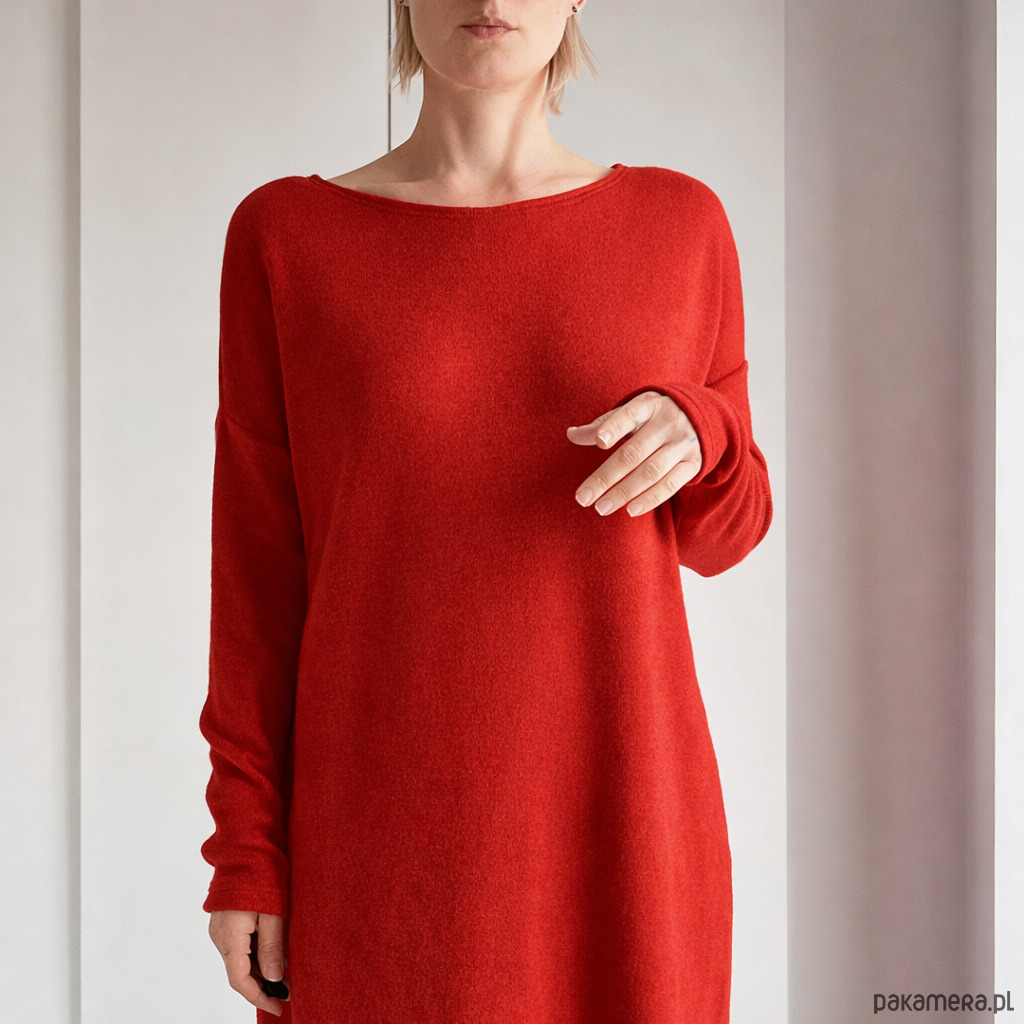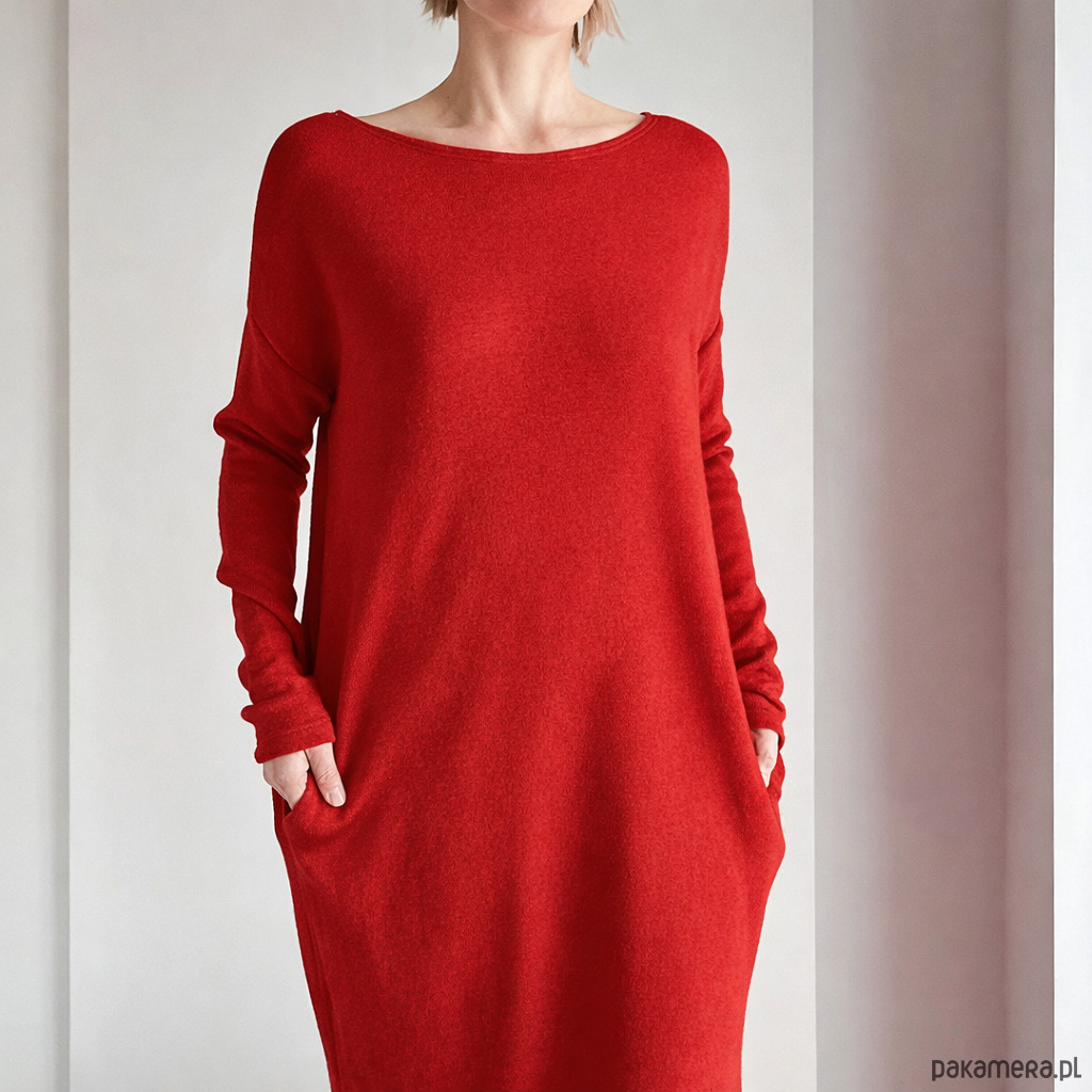 Czerwona sukienka o prostym, otulającym kroju w stylu oversize – swobodna, a jednocześnie subtelnie podkreślająca sylwetkę.