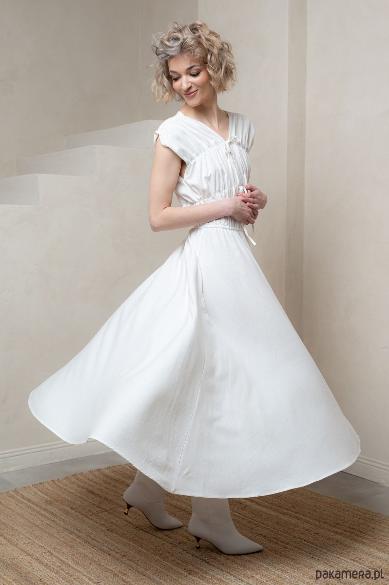 Długa sukienka z marszczeniem biała, WHITE LIDIA