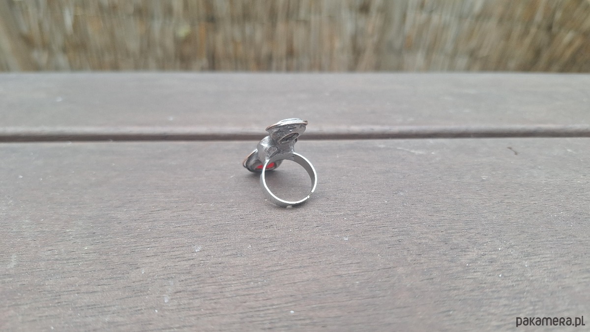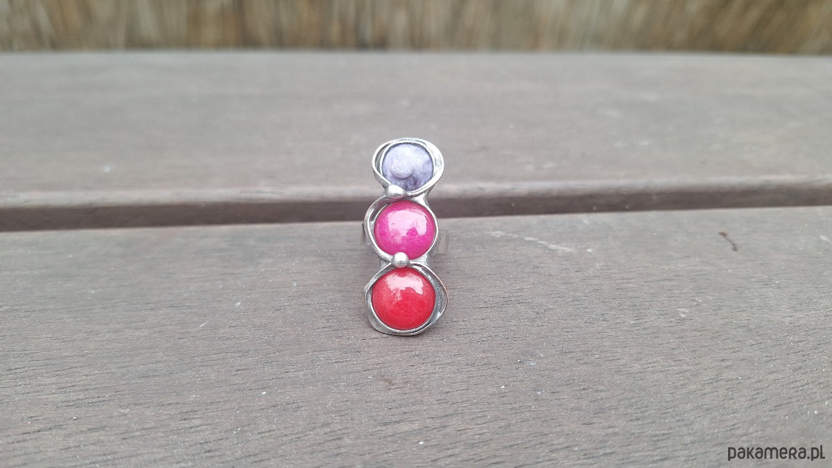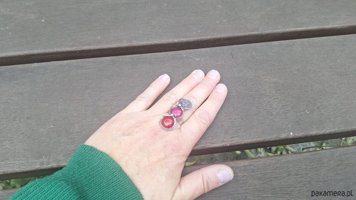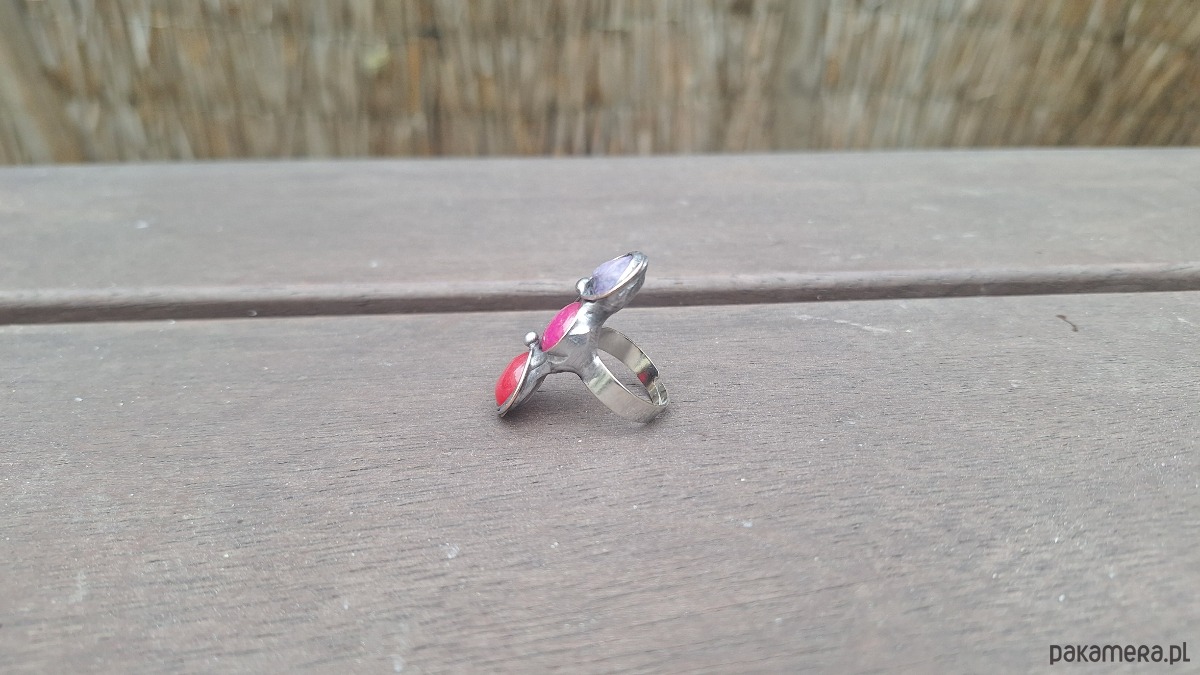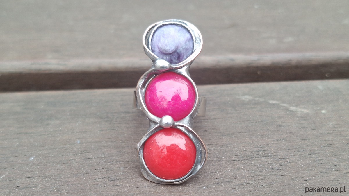 Pierścionek wykonany z miedzi, cyny, czaroitu i jadeitu. Wymiary ok. 3.5 na 1.2 cm. Regulowany. Nie jest ciężki.