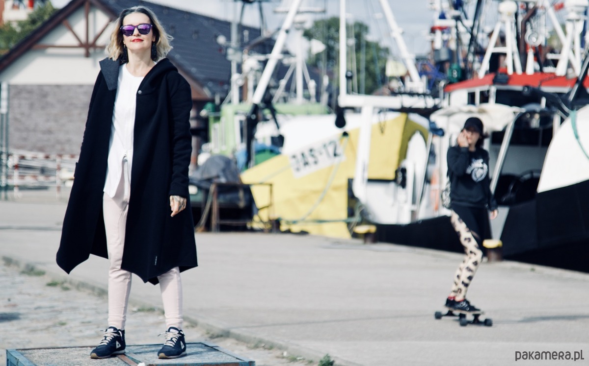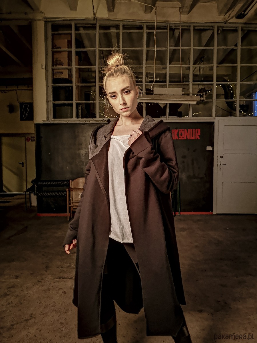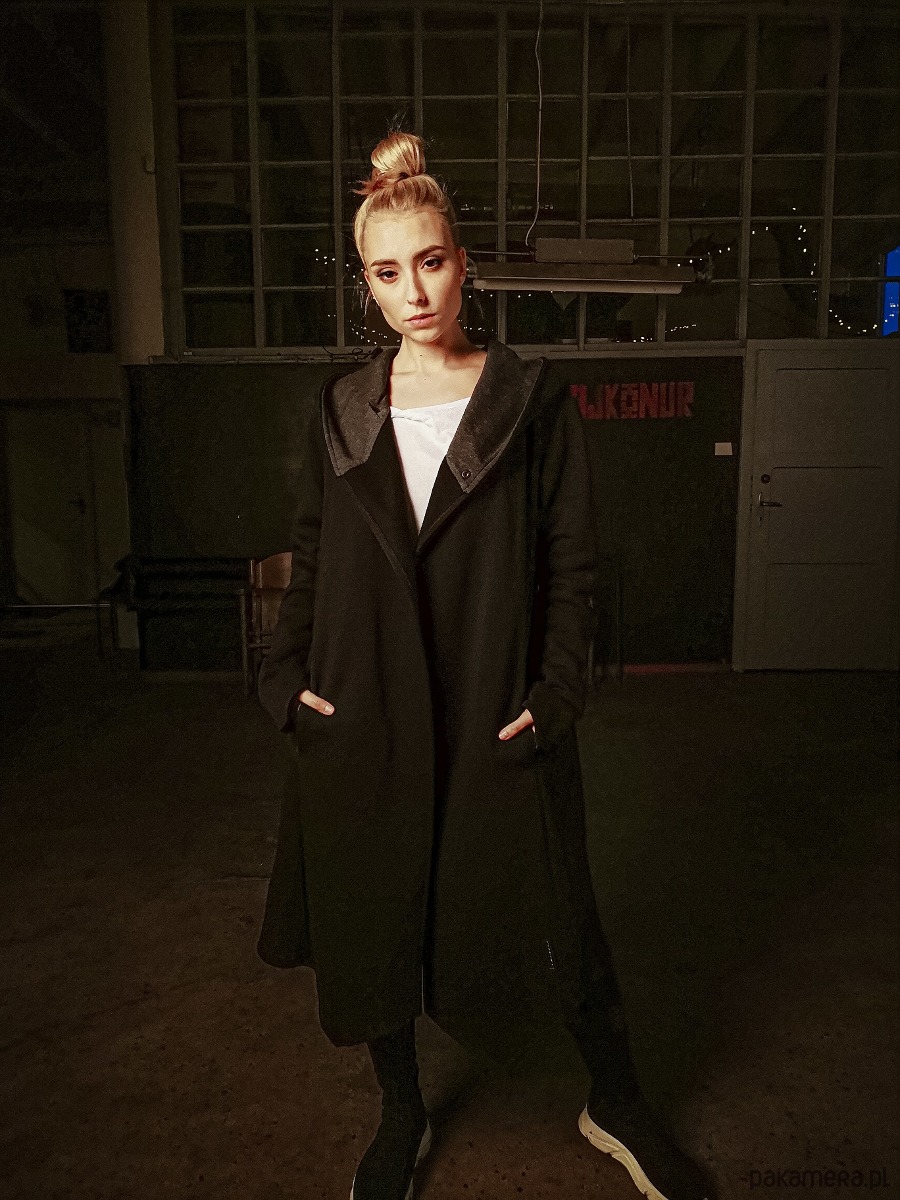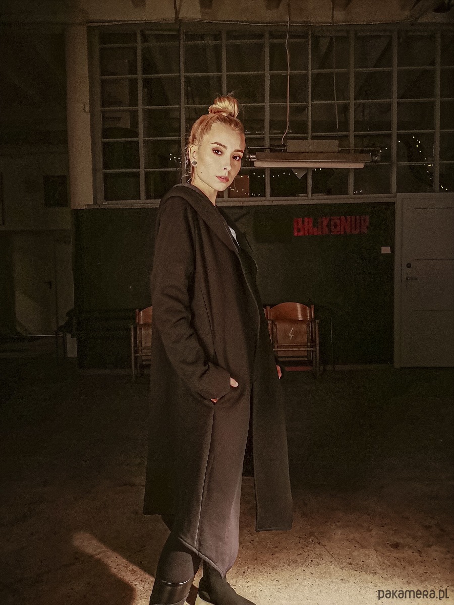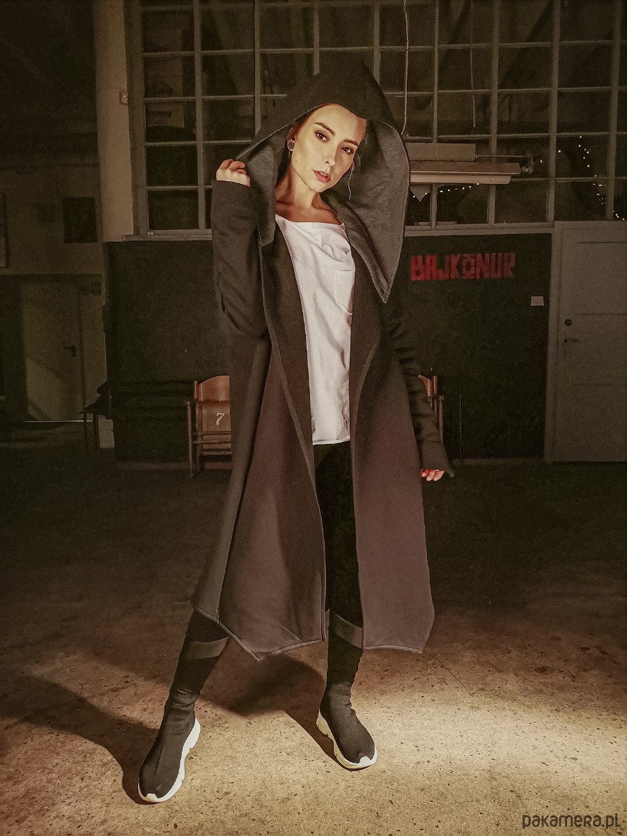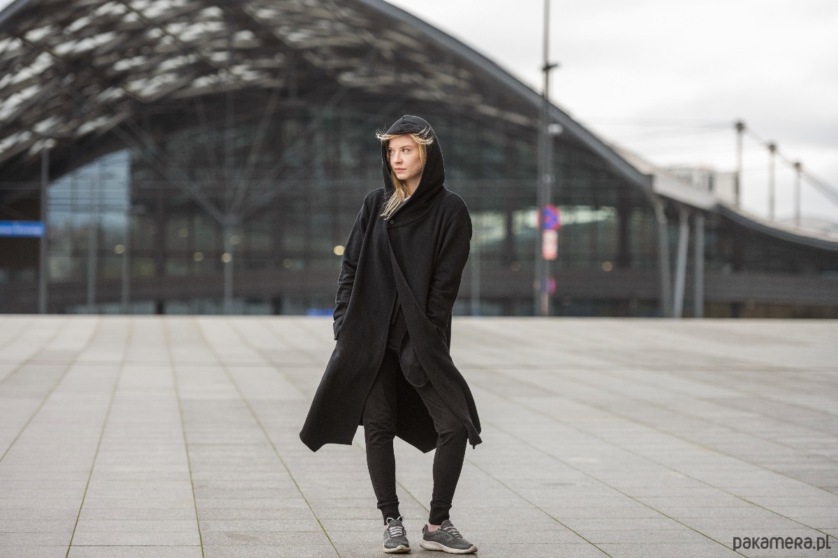 Model ma oversizową formę. Zapinany na jedną napę. Forma szeroka - przypominająca pelerynę. Dół bluzy jest asymetryczny. Kaptur wewnątrz ma kolor grafitowy co bardzo delikatnie przełamuje czarny charakter ubrania ;)