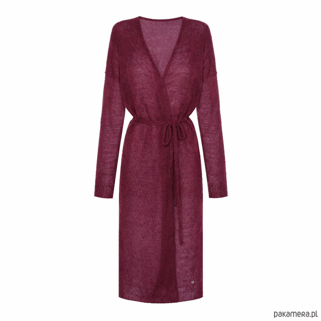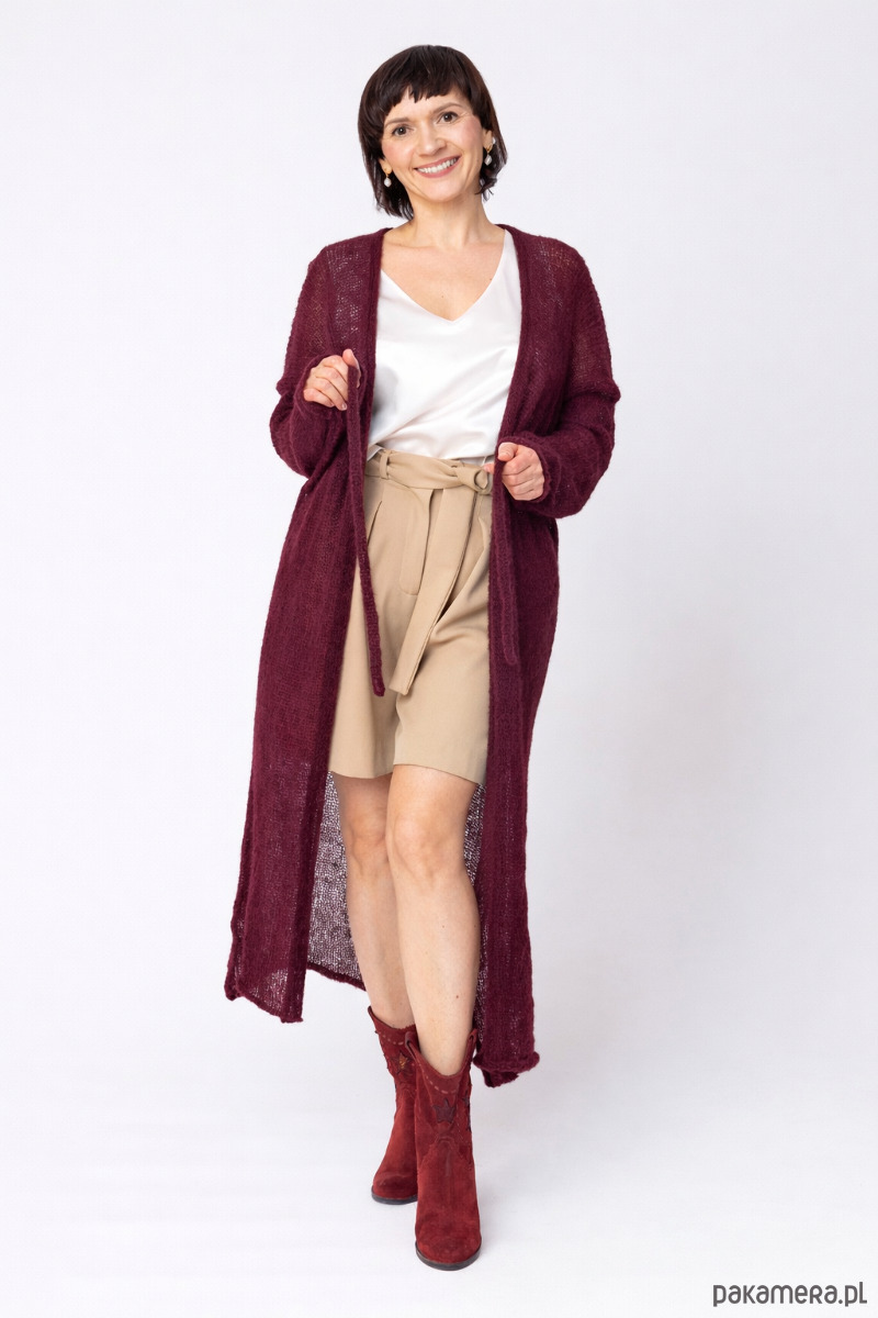 Długi kardigan wełniany z paskiem - Bakłażanowy