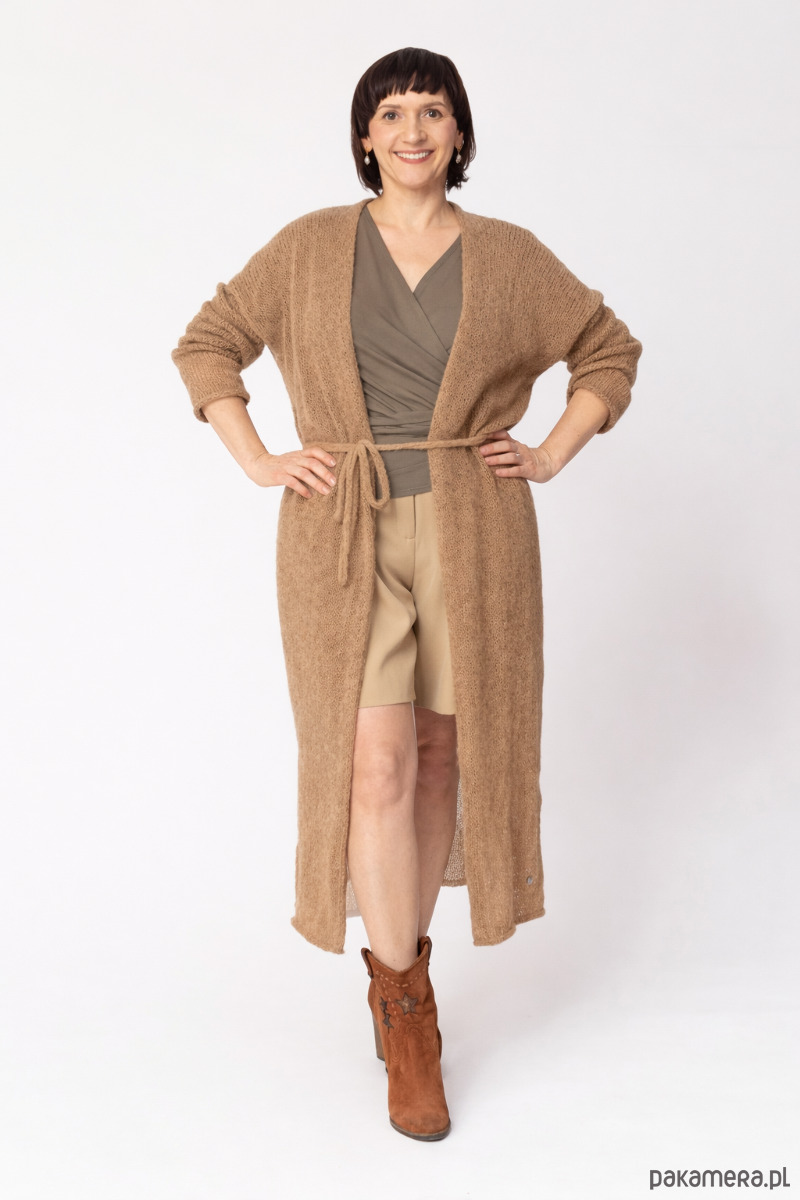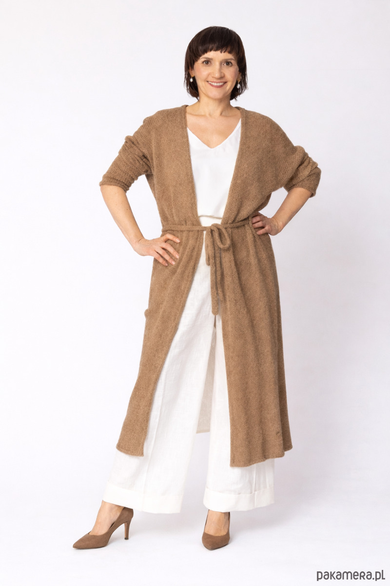 Szukasz idealnego okrycia na chłodniejsze dni? Nasz długi kardigan damski z paskiem to połączenie elegancji i niesamowitej miękkości. Ten wełniany sweter damski sięga do połowy łydki, dzięki czemu optycznie wydłuża sylwetkę, nadając jej lekkości.