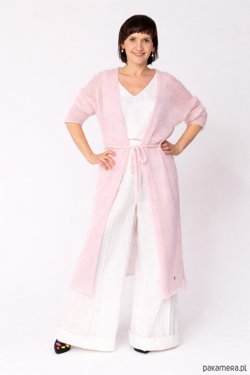 Długi kardigan wełniany z paskiem - Jasny różowy