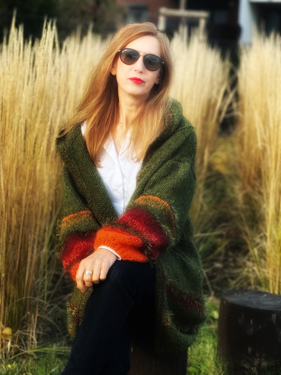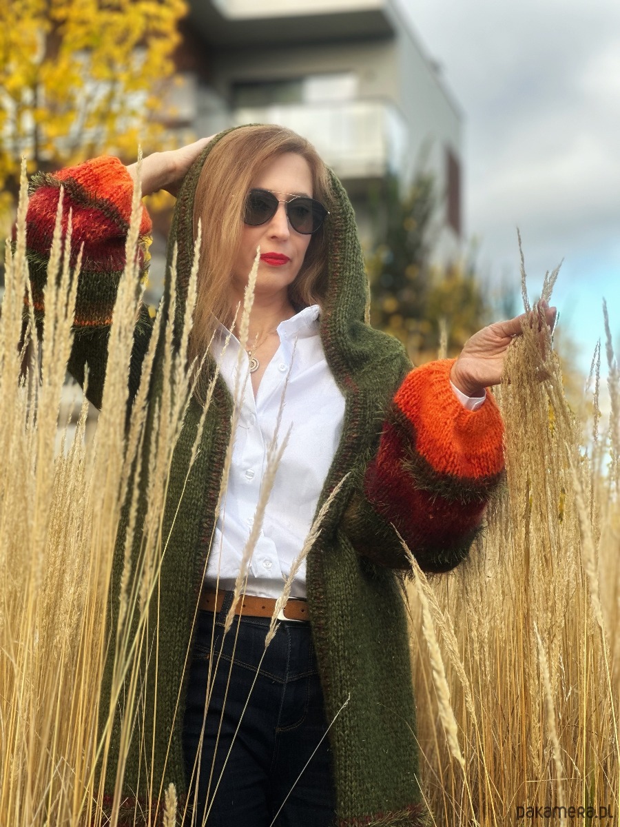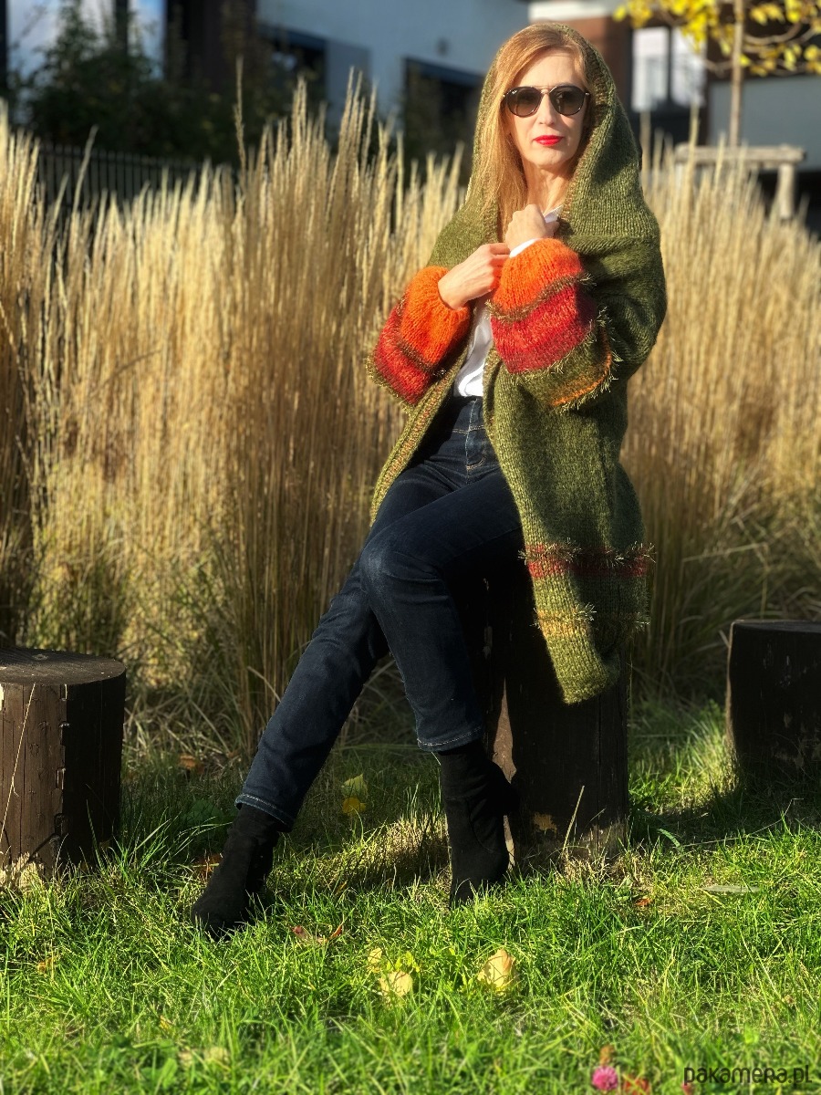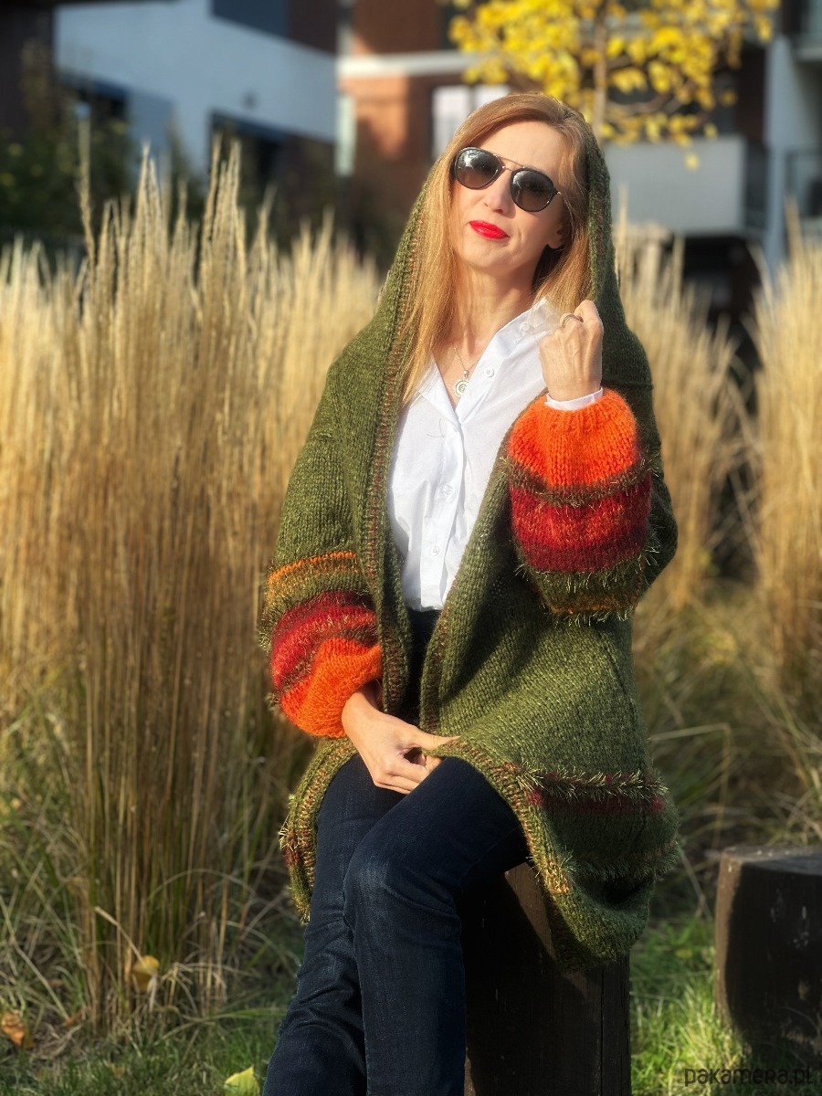 Ręcznie robiony długi kardigan z kapturem – khaki, pomarańcz, burgund 🍂