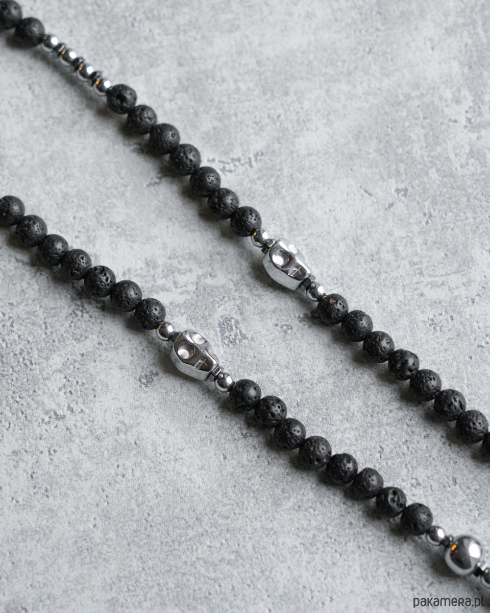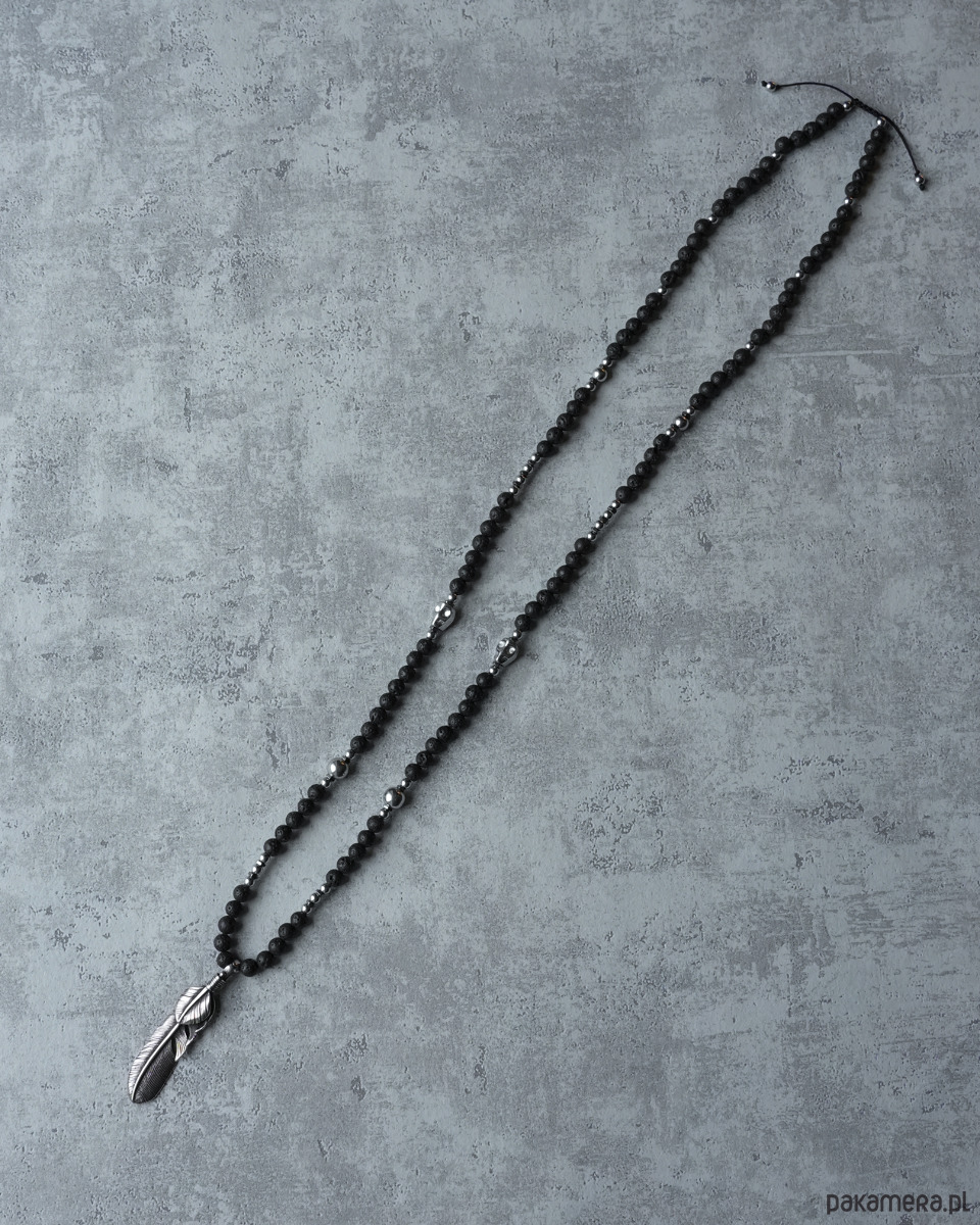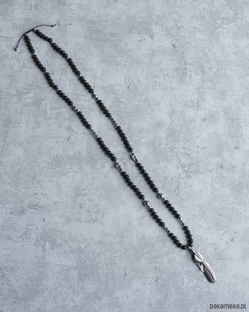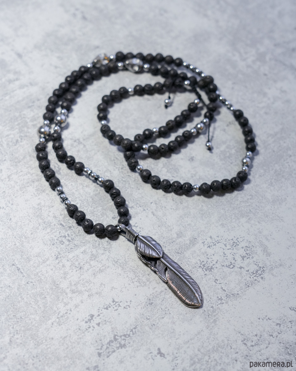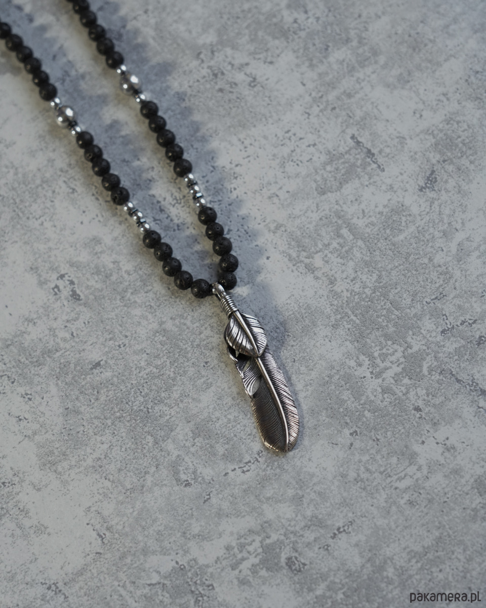 Unikatowy, długi męski naszyjnik z surowej LAWY WULKANICZNEJ oraz srebrnego i grafitowego HEMATYTU. Masywna zawieszka w kształcie pióra wykonana jest ze stali szlachetnej. Ozdobne czaszki umiejscowione w połowie naszyjnika wykonane są z hematytu.