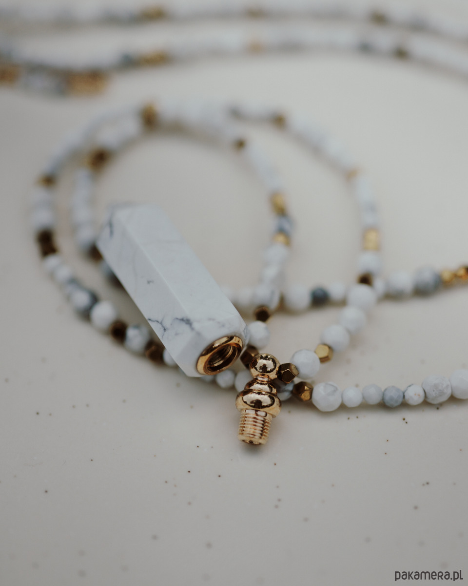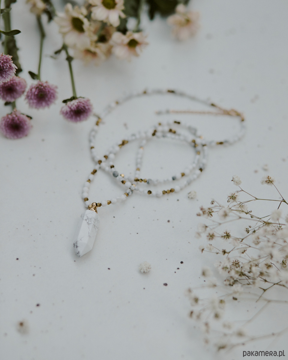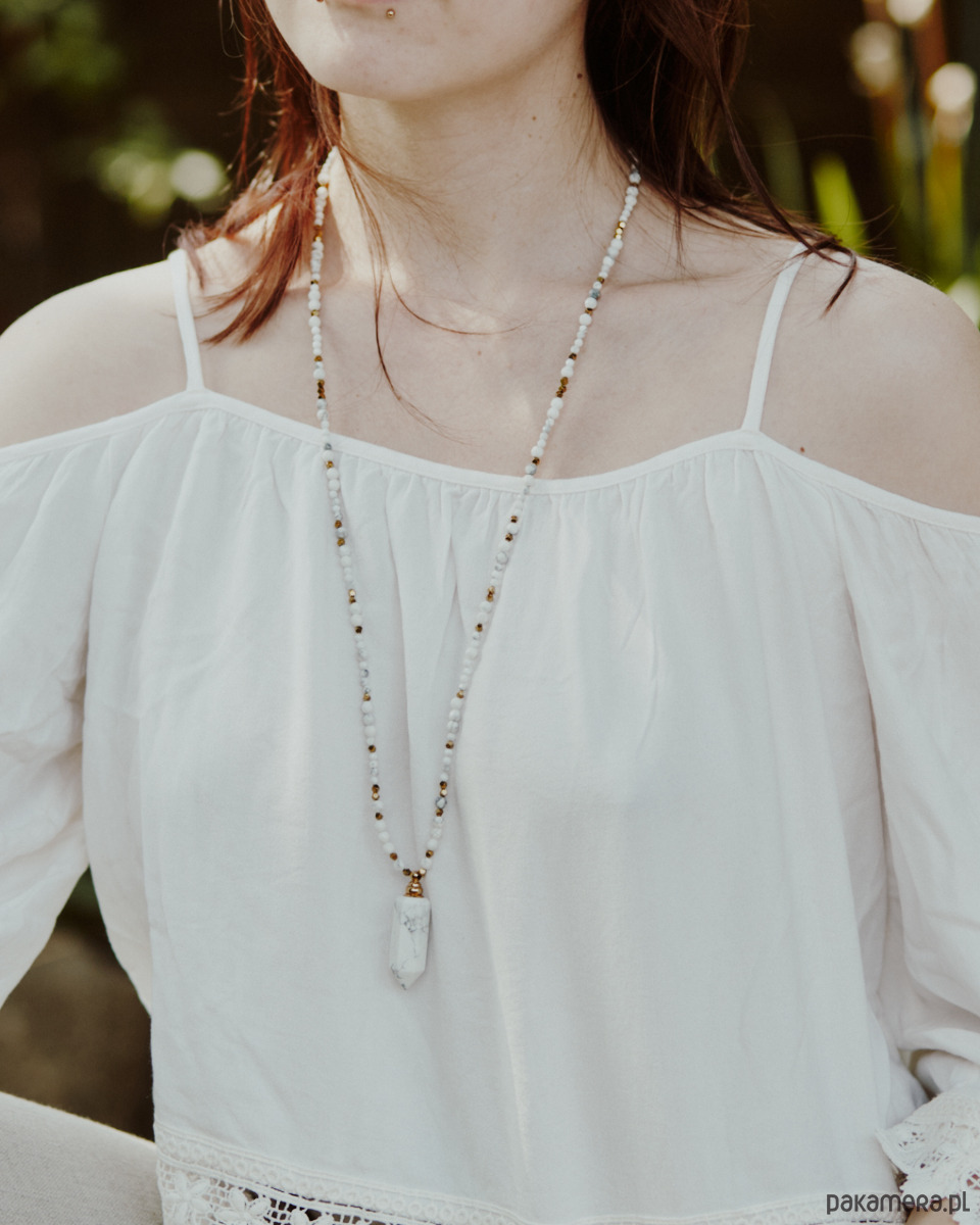 Naszyjnik jest wykonany w stylu bohemian. Nada charakteru jasnym stylizacjom. Zwiewne sukienki, rozpięte koszule, frędzle i warstwowanie biżuterii to idealne warunki dla tego naszyjnika. Z nim wyrazisz swój styl, również dlatego, że jest stworzony z naturalnych kamieni - białego howlitu i złotego hematytu, wykonany jest ręcznie w Polskiej pracowni, a wysyłany jest bez użycia plastiku dbając o naszą planetę.