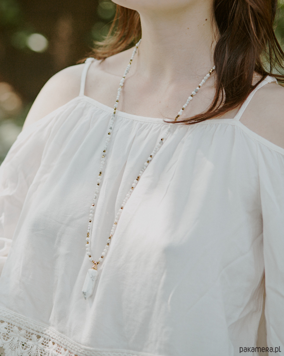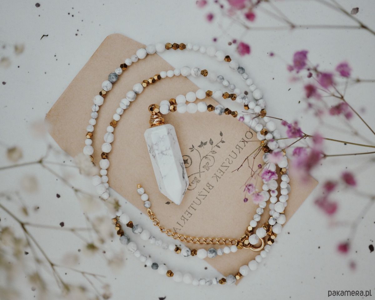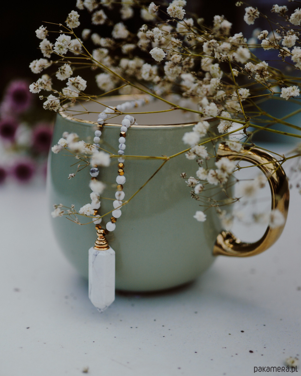 Naszyjnik jest wykonany w stylu bohemian. Nada charakteru jasnym stylizacjom. Zwiewne sukienki, rozpięte koszule, frędzle i warstwowanie biżuterii to idealne warunki dla tego naszyjnika. Z nim wyrazisz swój styl, również dlatego, że jest stworzony z naturalnych kamieni - białego howlitu i złotego hematytu, wykonany jest ręcznie w Polskiej pracowni, a wysyłany jest bez użycia plastiku dbając o naszą planetę.