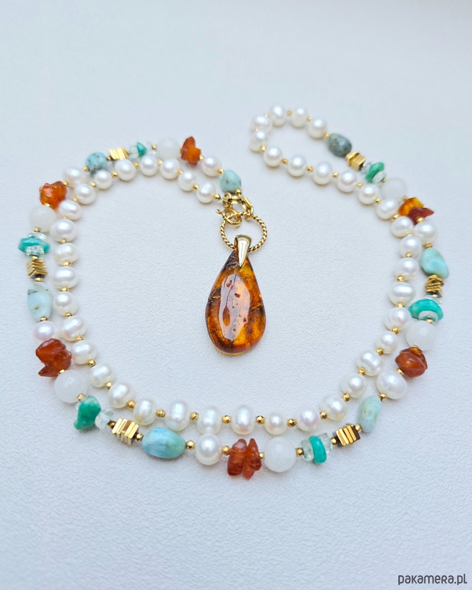 Wykorzystane kamienie: perły naturalne, bursztyn, larimar, zielony ametyst, amazonit, jadeit.