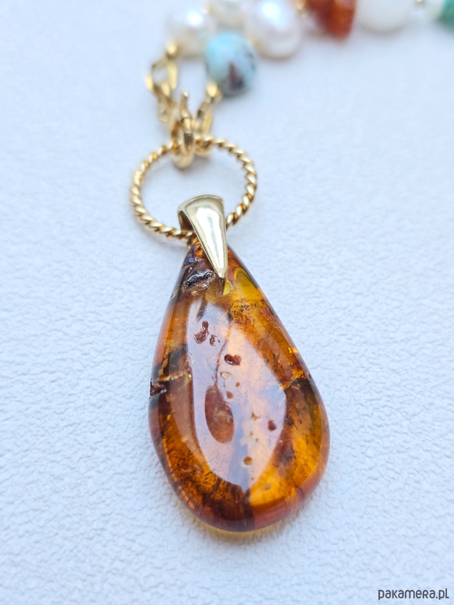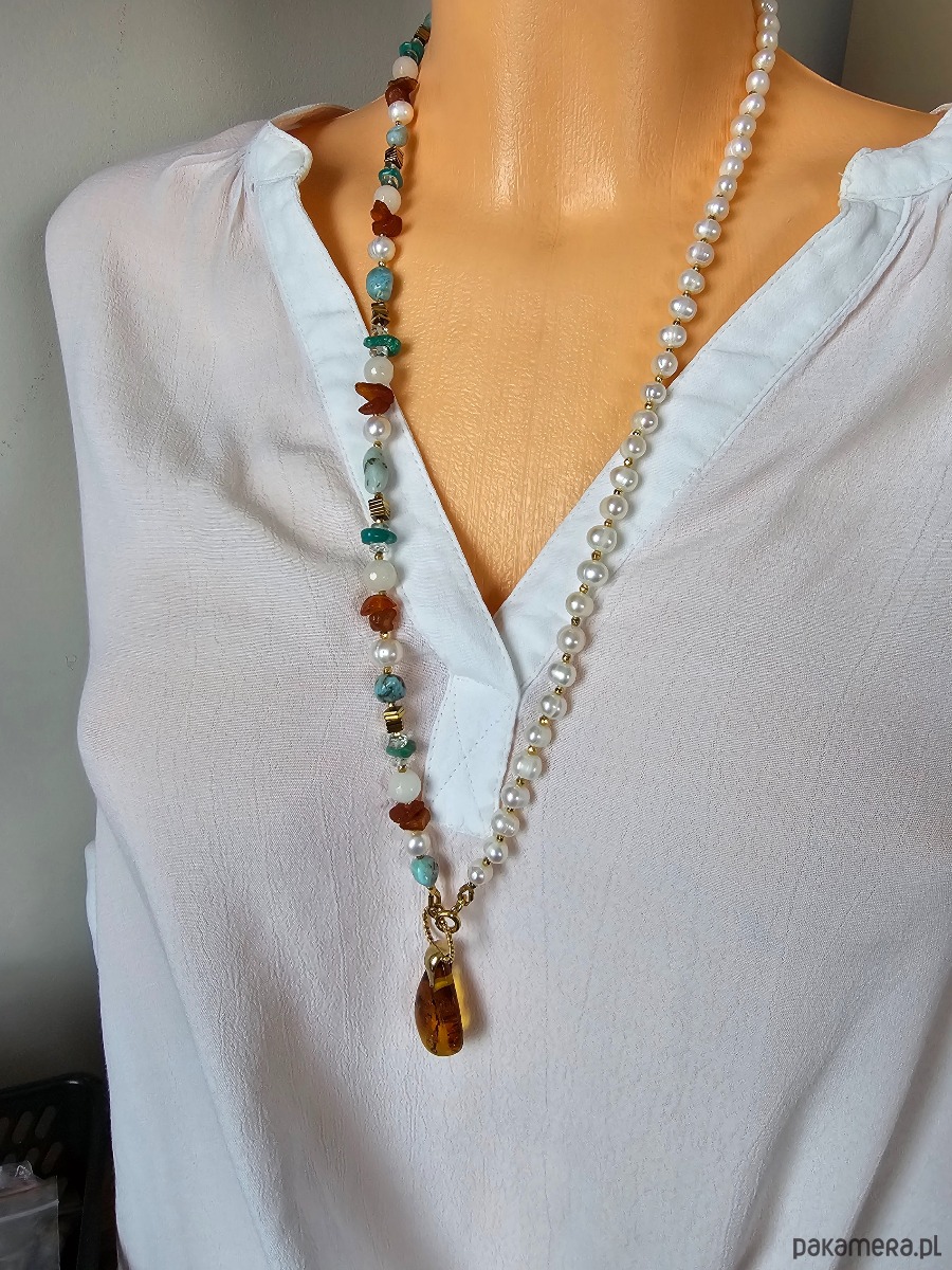 - Materiał: perły naturalne, bursztyn, jadeit