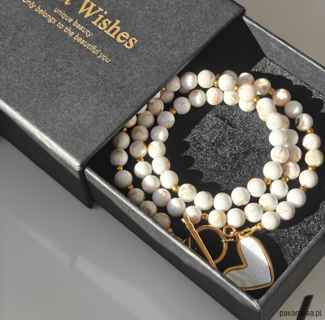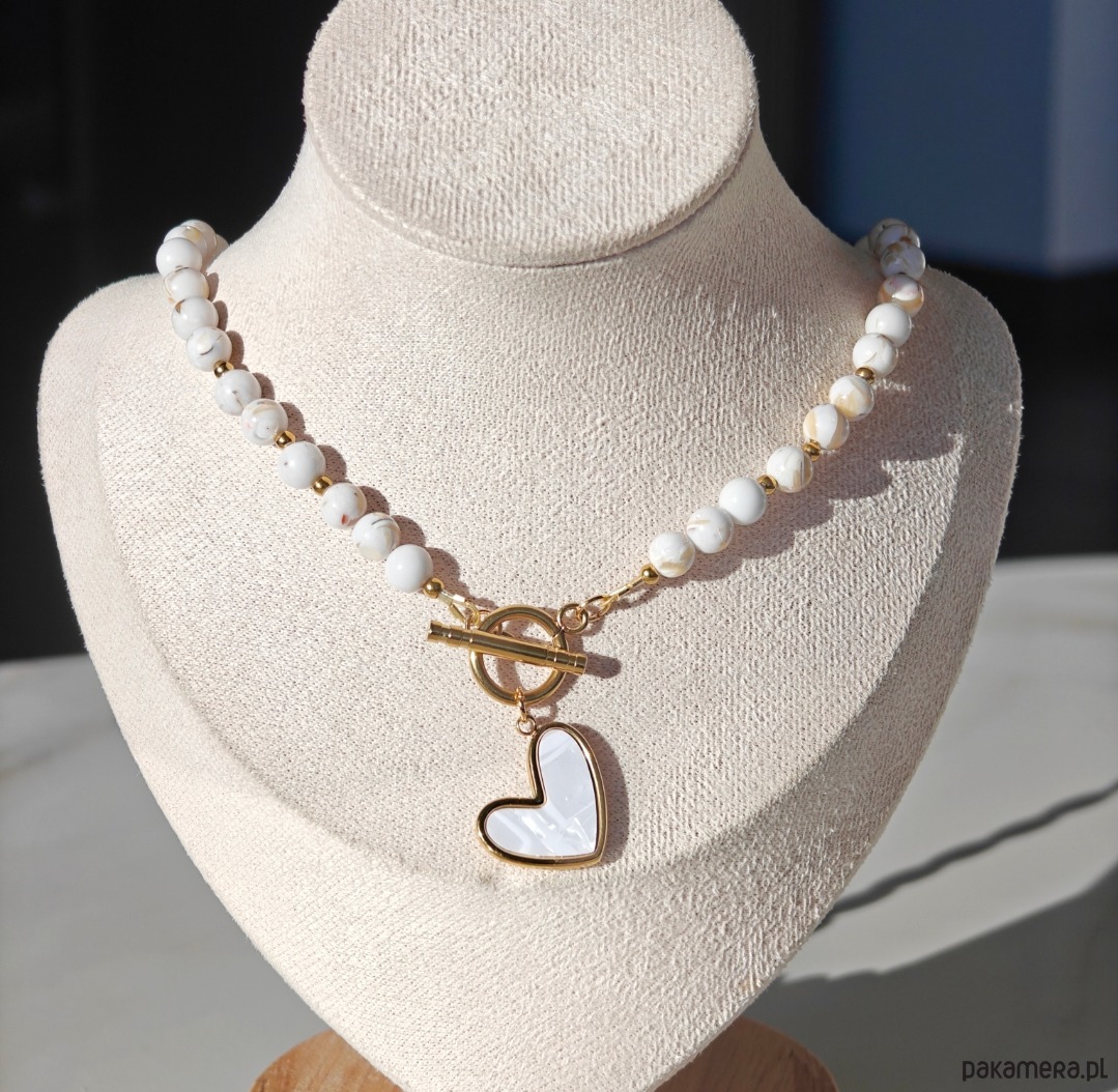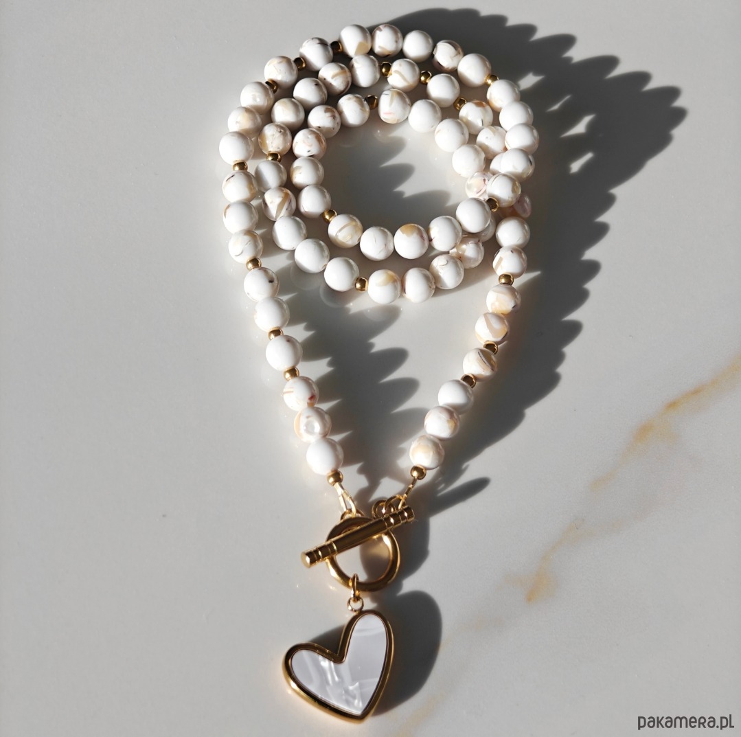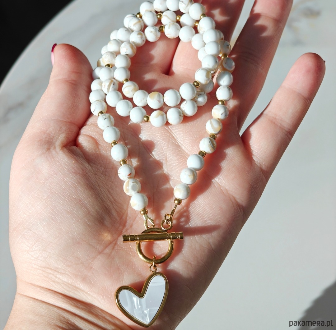 Naszyjnik wykonany z howlitu w delikatnych, jasnych odcieniach, które nadają mu spokojny i elegancki charakter. Długość naszyjnika to 50 cm, a całość zdobi zawieszka w kształcie serca o wielkości 2 cm — subtelny akcent, który pięknie dopełnia kompozycję.