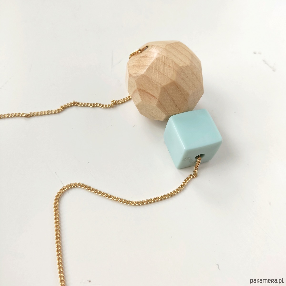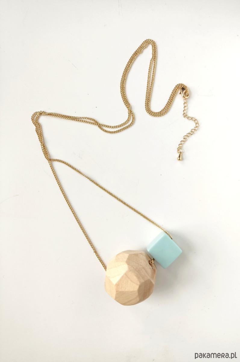 Długi łańcuszek w kolorze złotym, wykończony zawieszką z drewnianej, ręcznie fasetowanej kulki (śr. 3 cm) i akrylowego sześcianu.