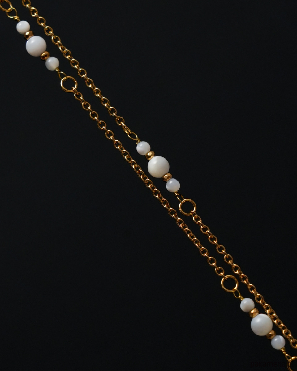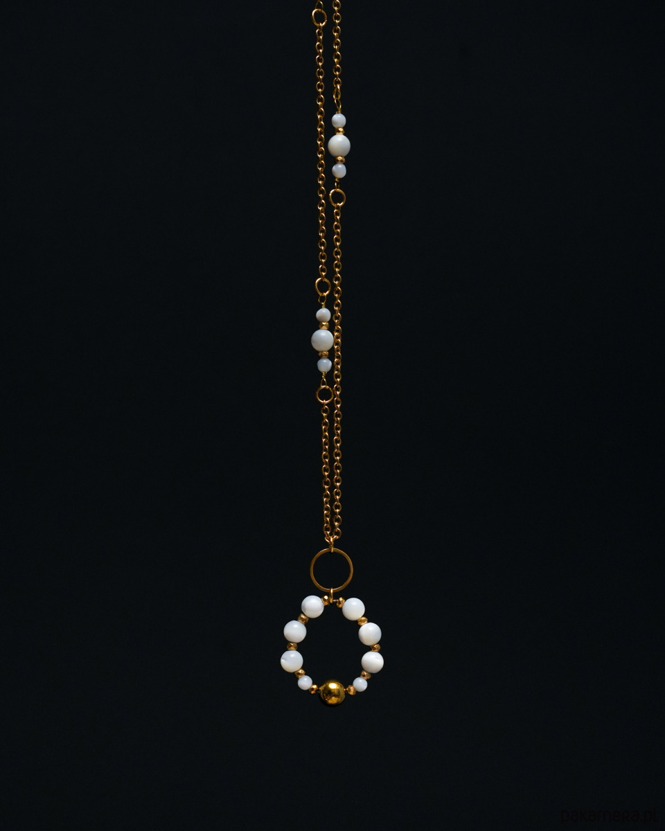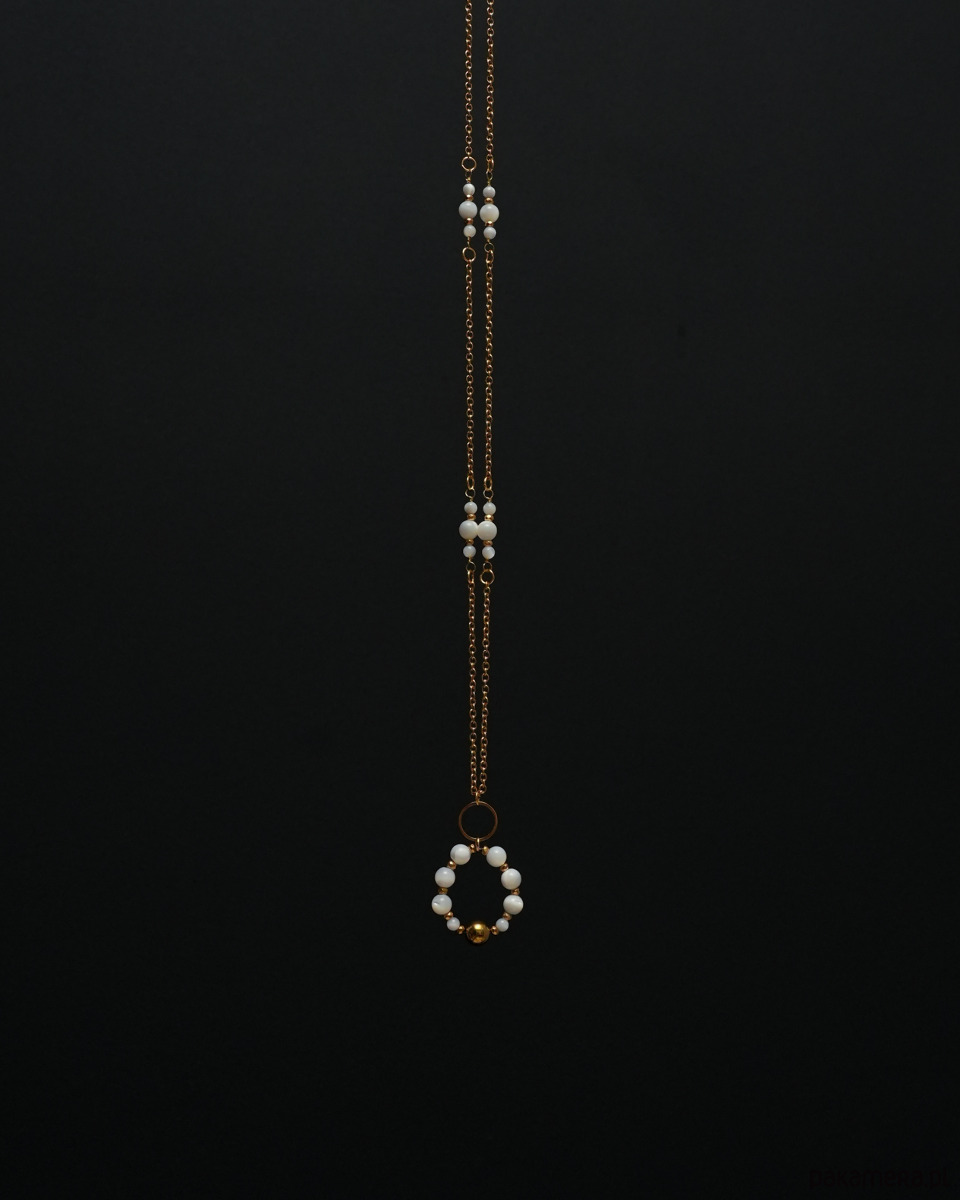 Długi, elegancki naszyjnik (wisior) wykonany ze złotej STALI SZLACHETNEJ, białej, lekko opalizującej MASY PERŁOWEJ (muszli) oraz złotego HEMATYTU. Świetny dodatek zarówno na co dzień, jak i na specjalne okazje i eleganckie wyjścia.