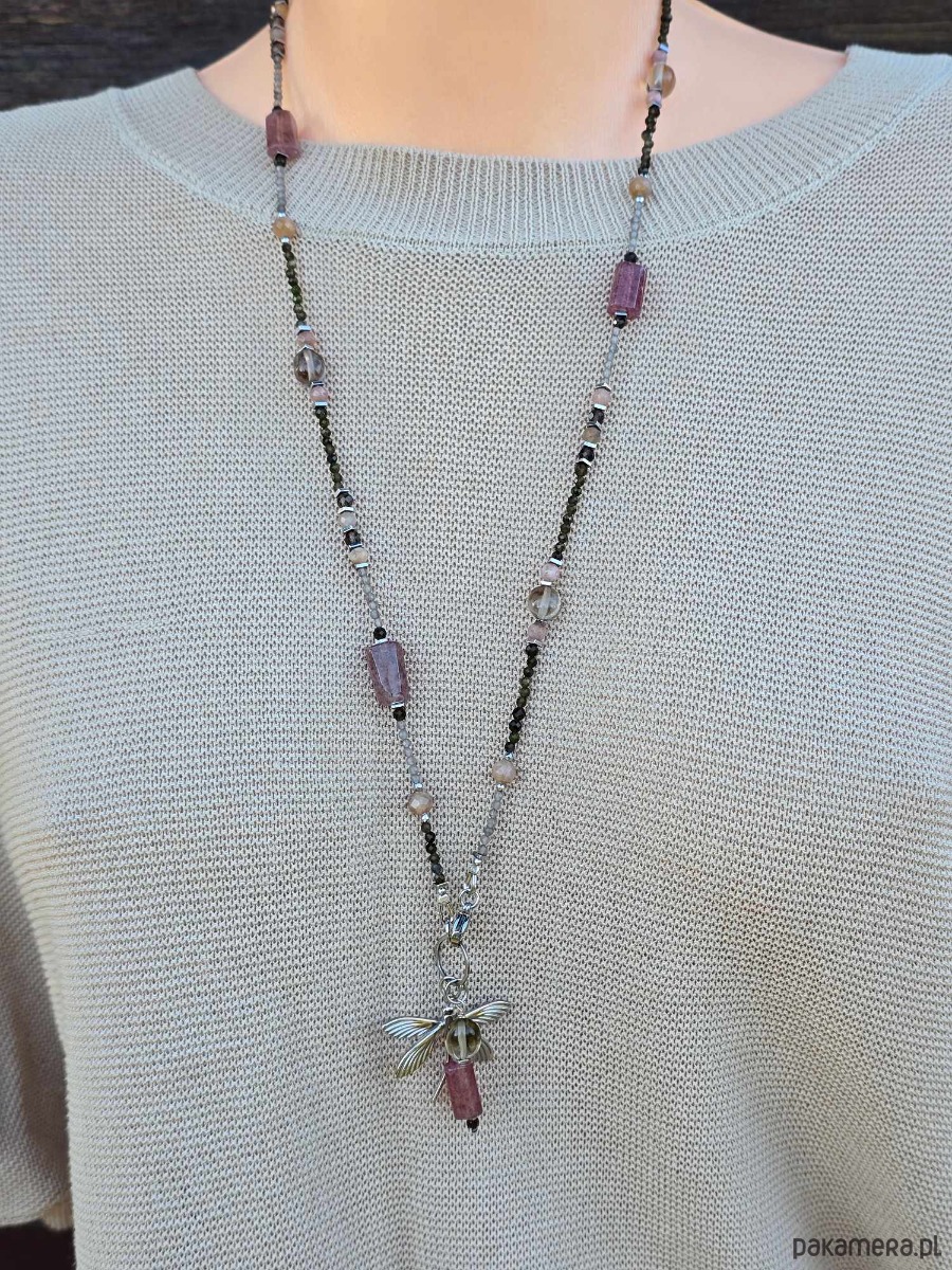 Długi naszyjnik z kamieni naturalnych. Zapinany z przodu, z dwiema zawieszkami