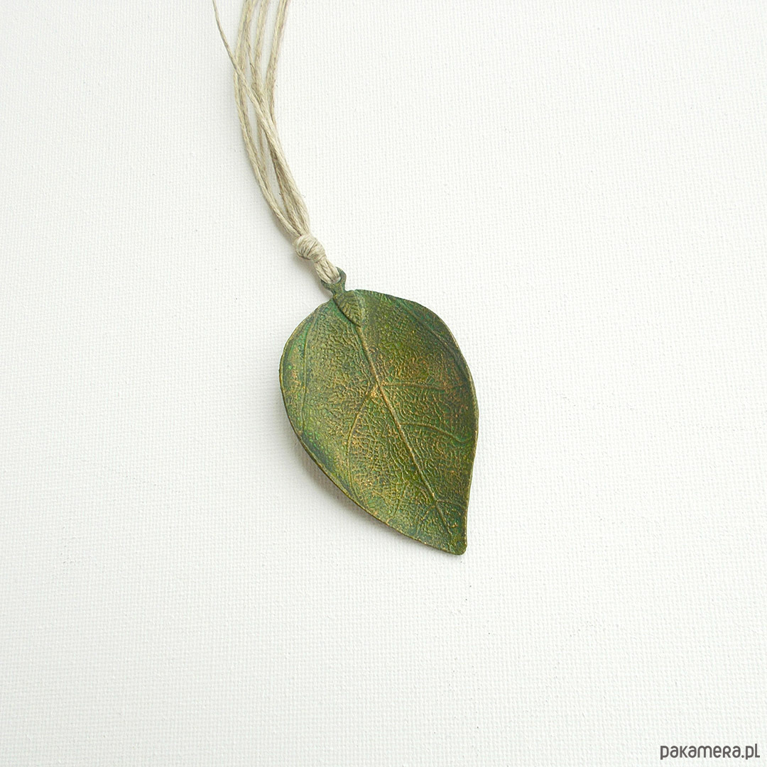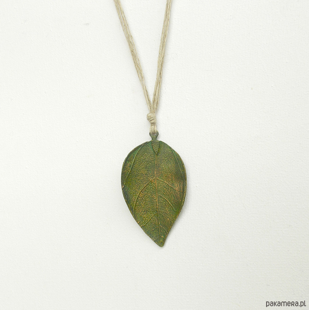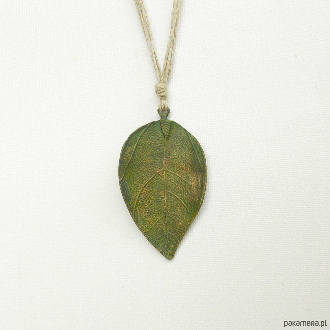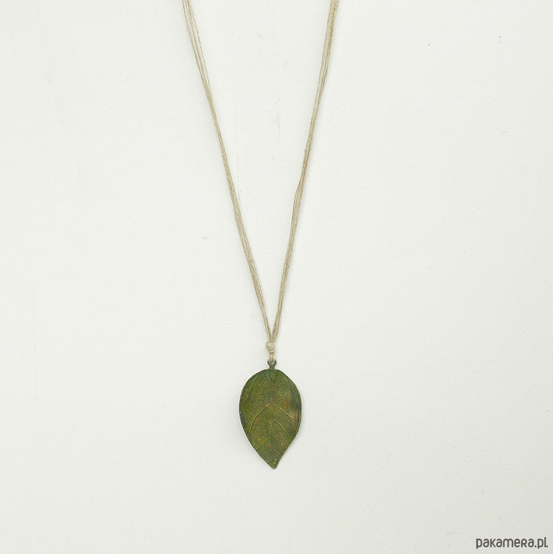 Długi, lniany naszyjnik z metalową zawieszką w kształcie liścia