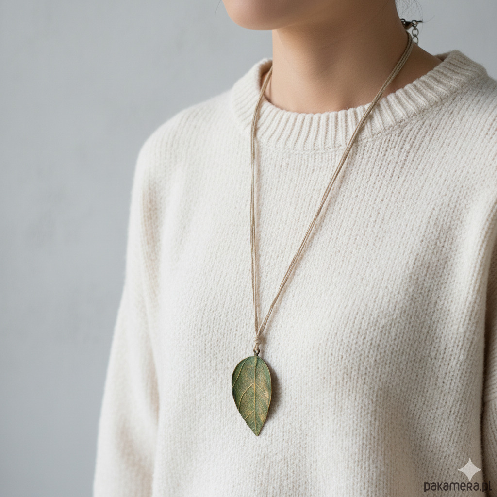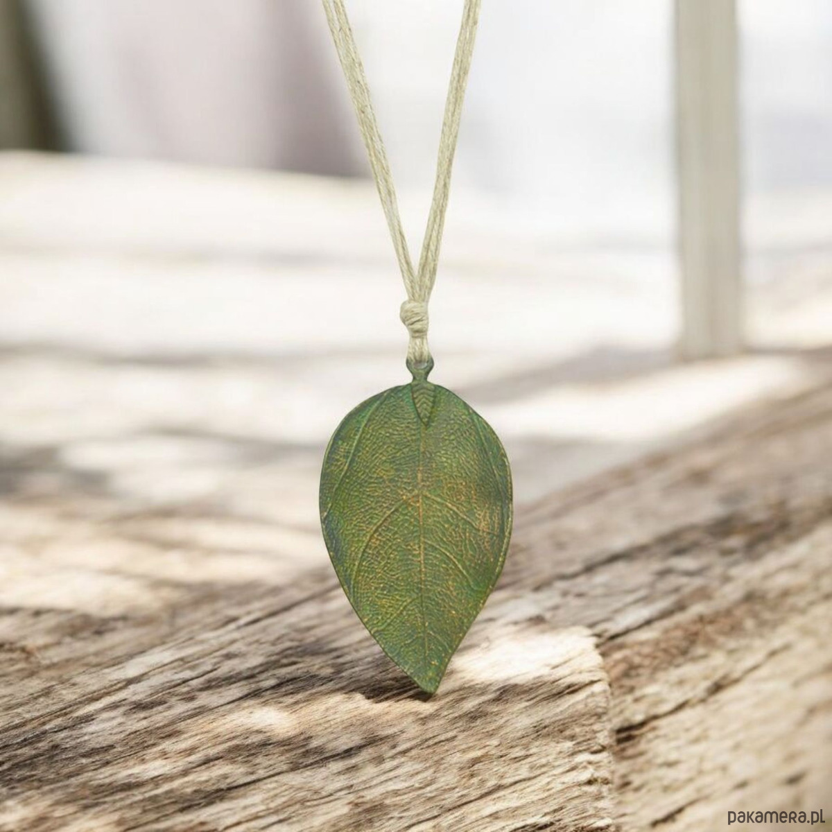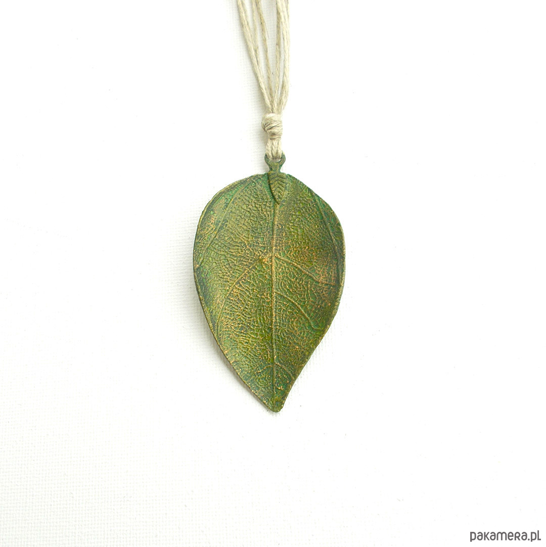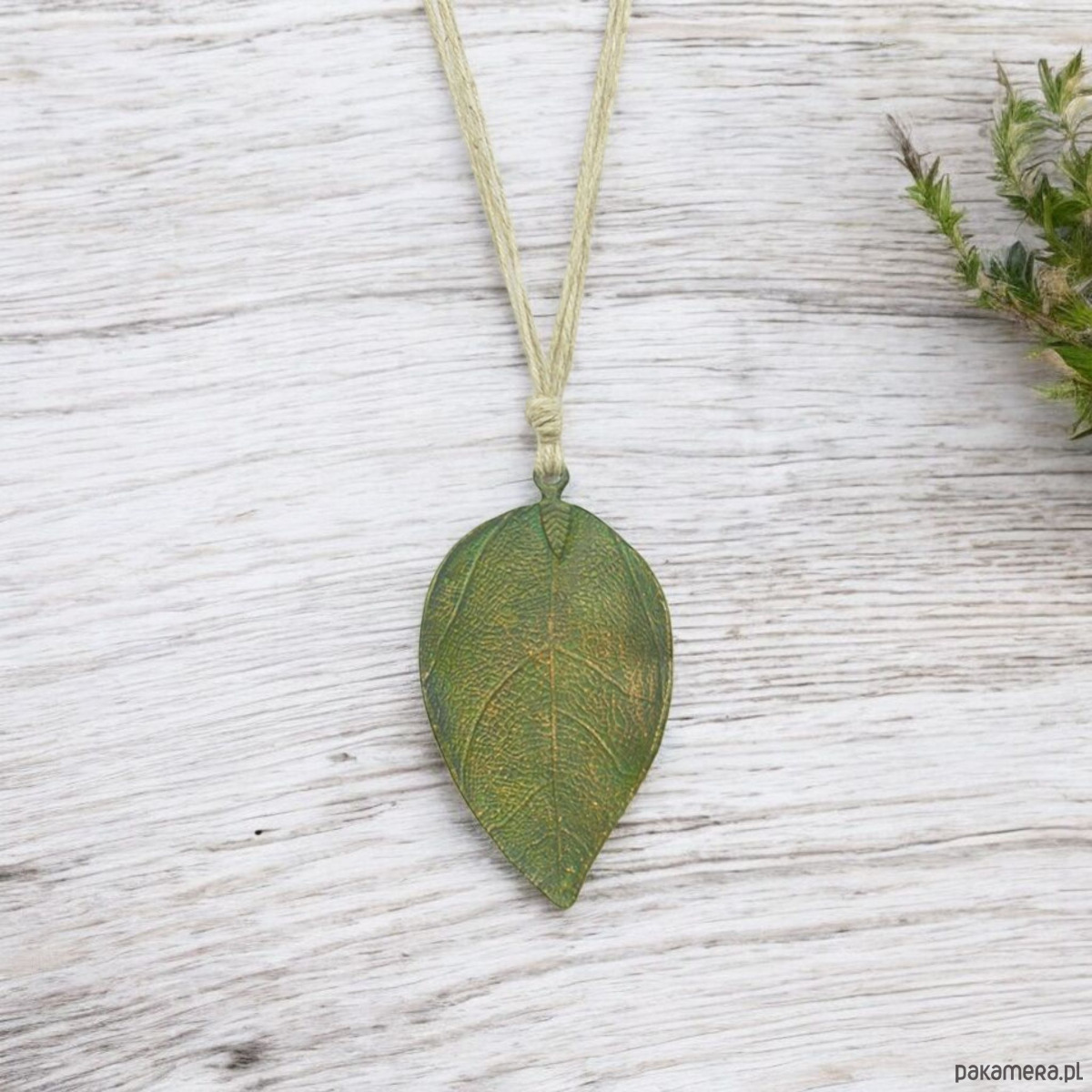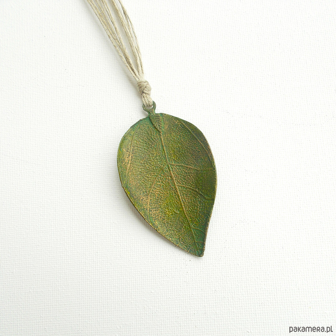 Długi, lniany naszyjnik z metalową zawieszką w kształcie liścia