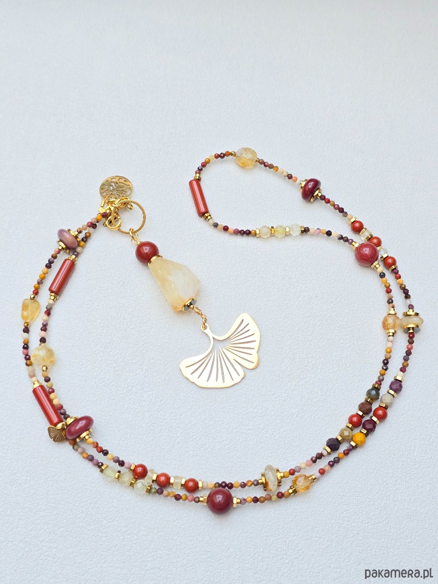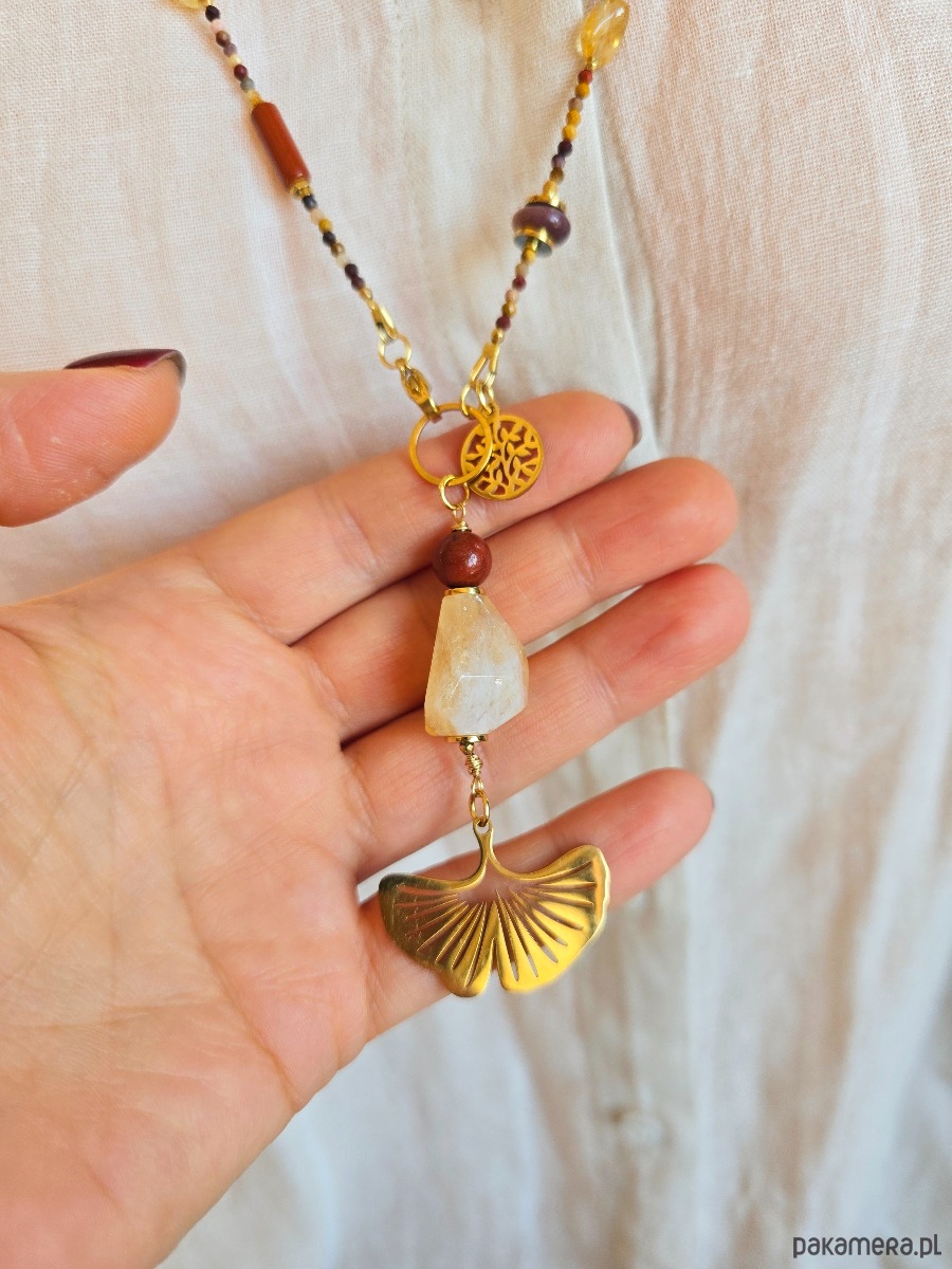 Długi naszyjnik z kamieni naturalnych. Zapinany z przodu z piękną zawieszką z bryłki cytrynu i liścia miłorzębu