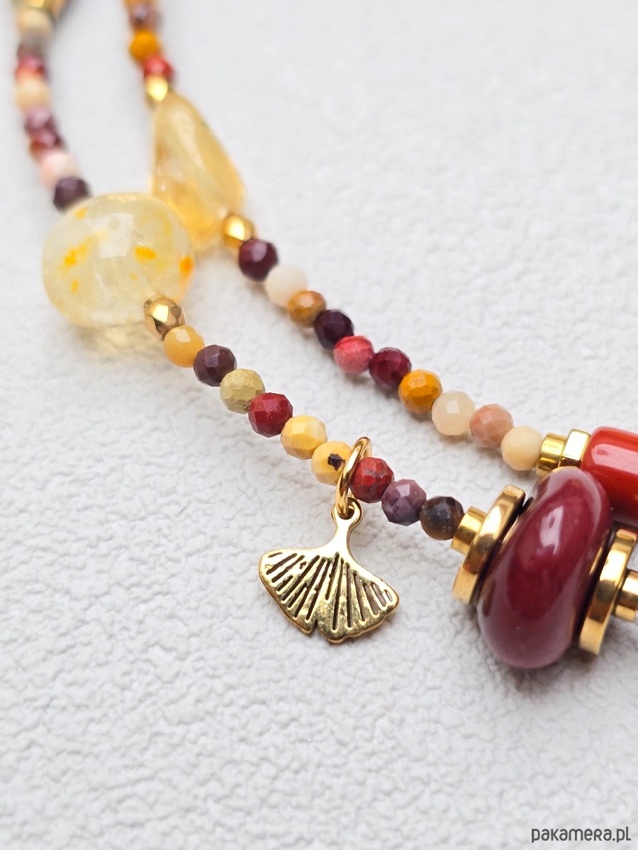 Wykorzystane kamienie: mokait, cytryn, jaspis ceglasty, złocony hematyt.