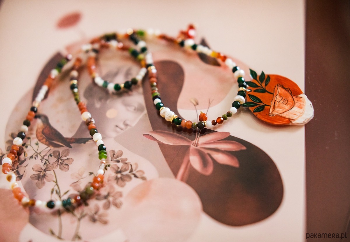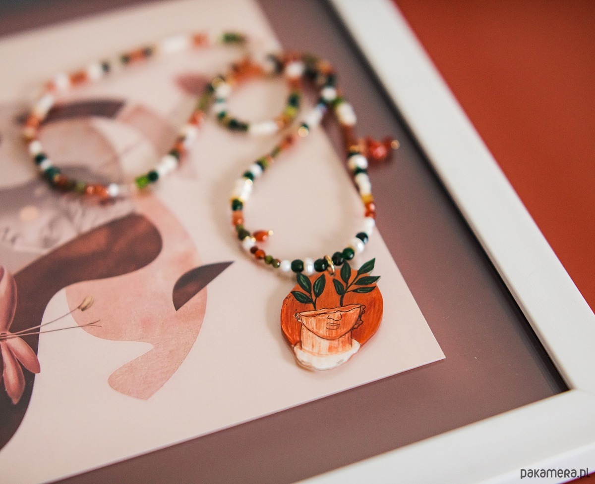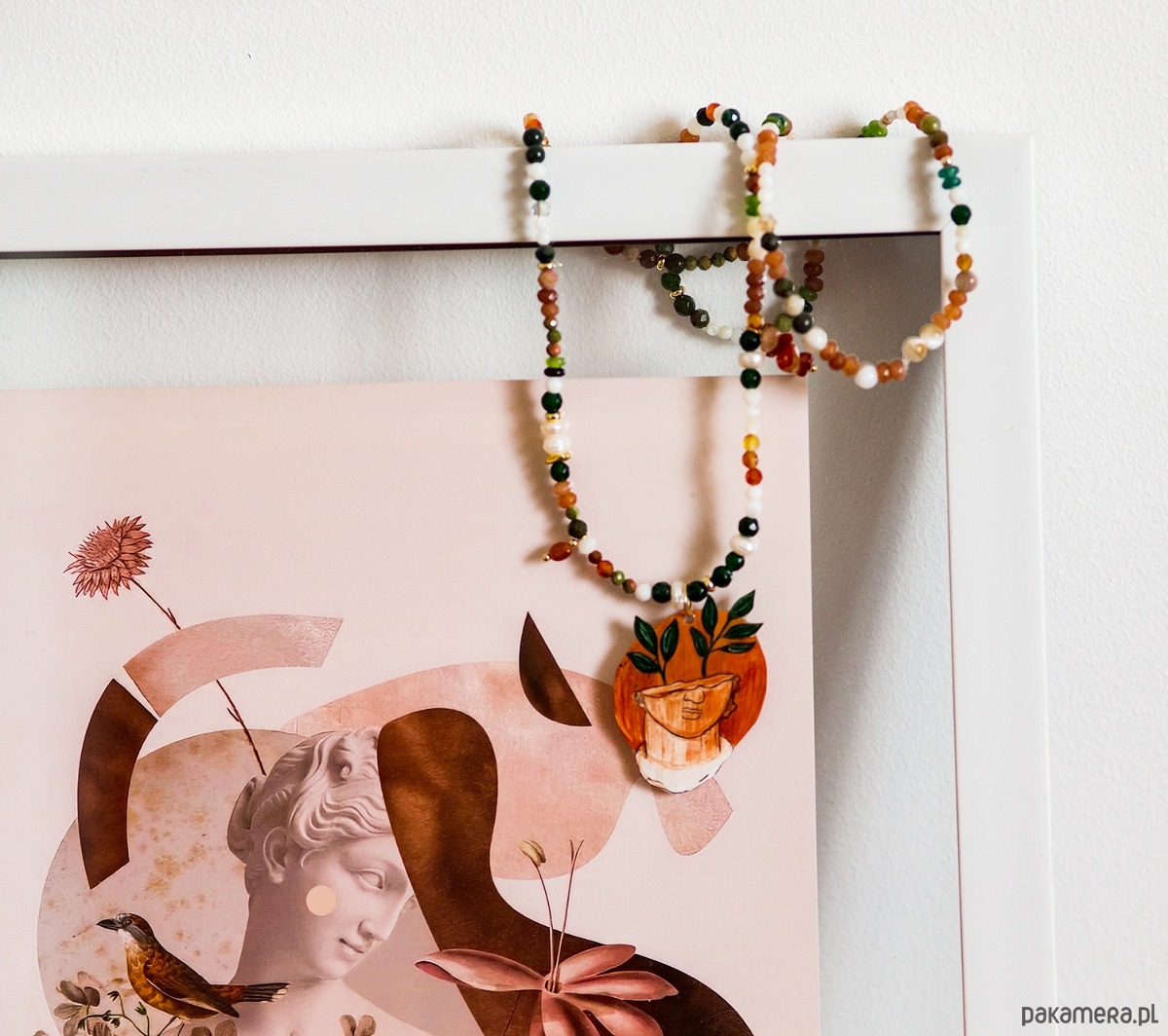 Wyjątkowość naszyjnika tkwi w "medalionie" z ręcznie narysowaną antyczną twarzą. Jedny w swoim rodzju naszyjnik z naturalnych kamieni i pozłacanych dodatków.