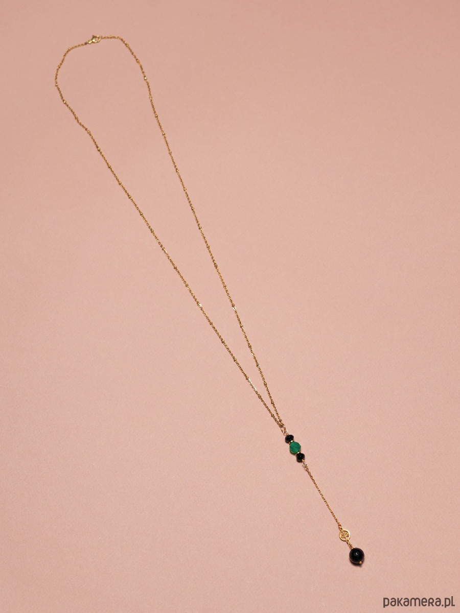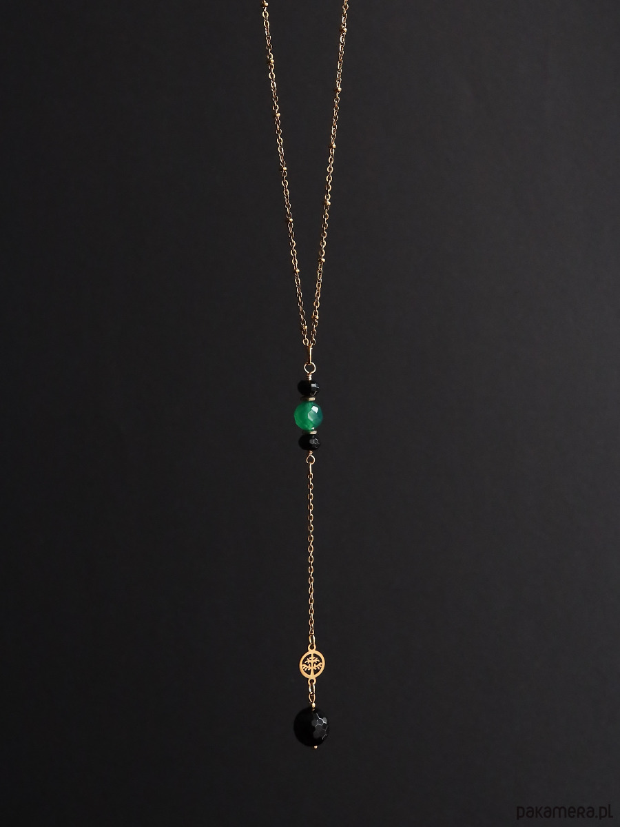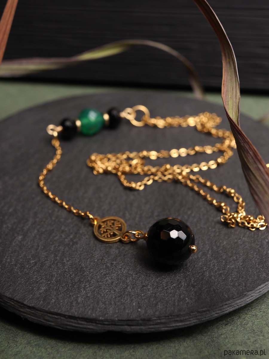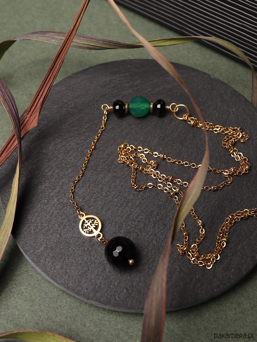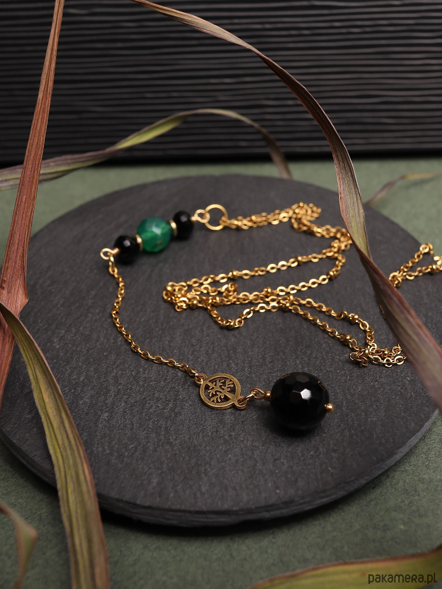 Długi naszyjnik z czarnym onyksem, zielonym agatem i złotym hematytem. Łańcuszek i łącznik z drzewem życia są wykonane z pozłacanej stali szlachetnej.