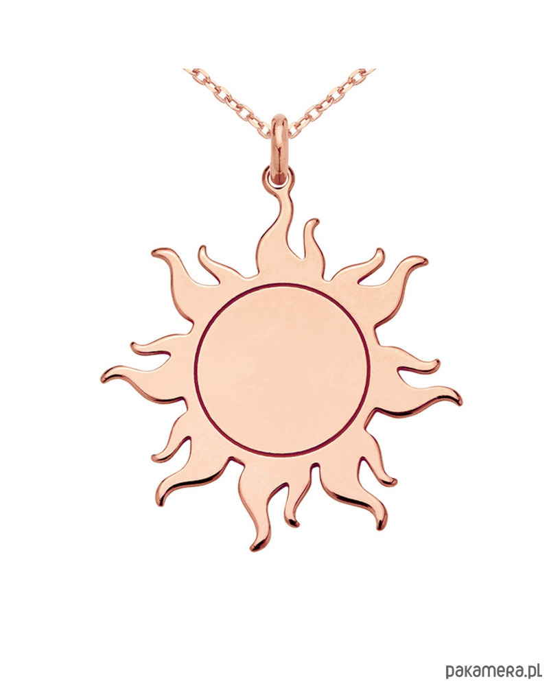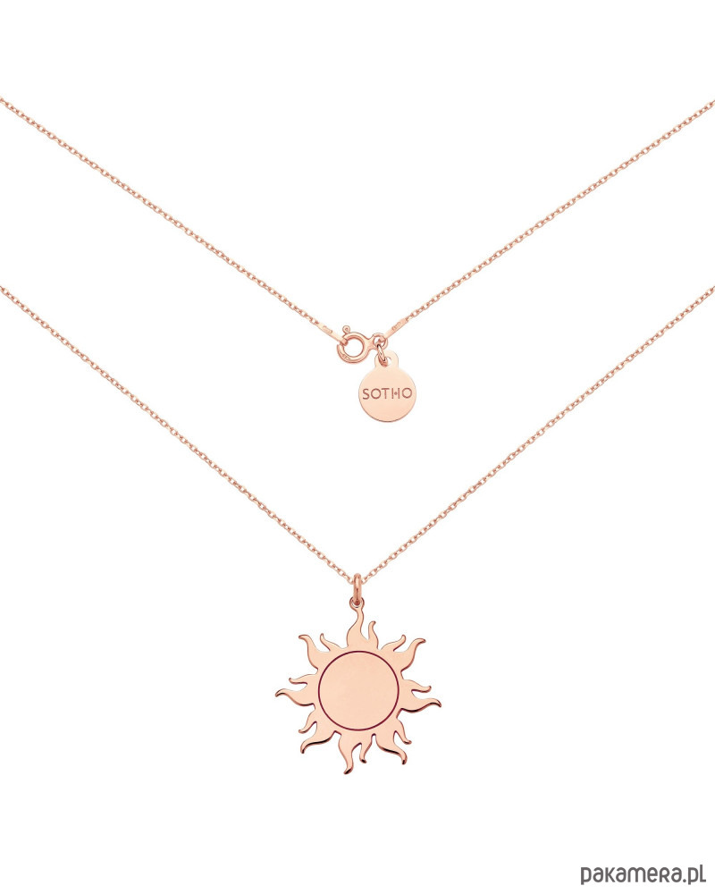 Złoty naszyjnik łańcuszkowy zdobiony słońcem i zawieszką z logo marki. Całość wykonana ze srebra 925 powlekanego 24 karatowym różowym złotem.