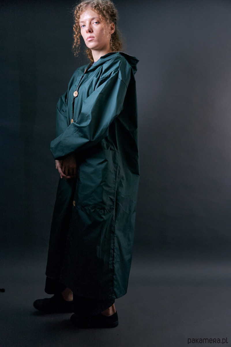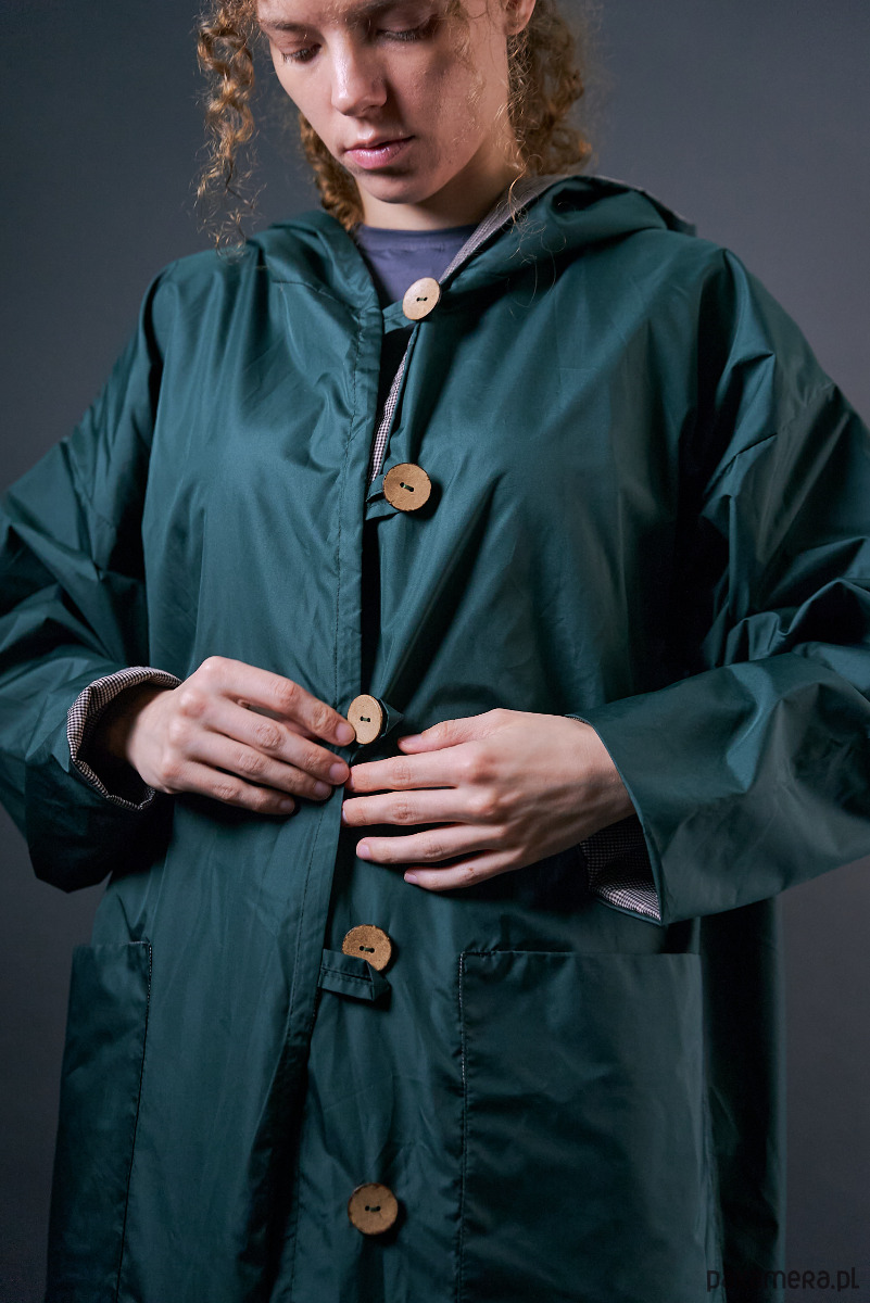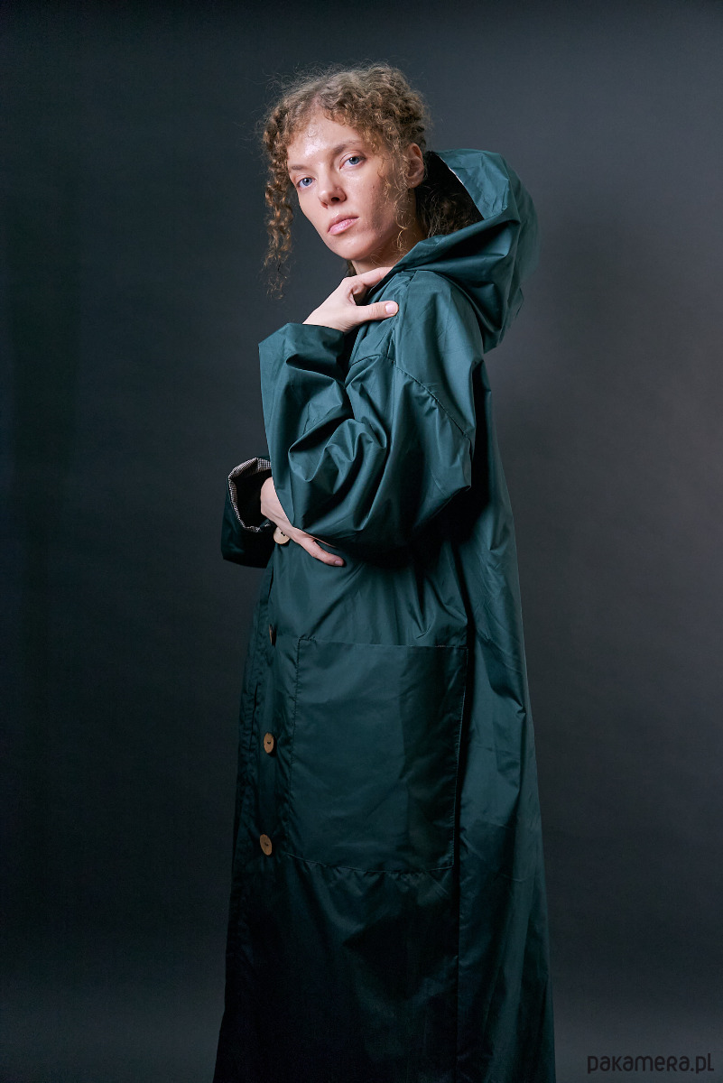 Długi zielony płaszcz impregnowany na podszewce z kapturem