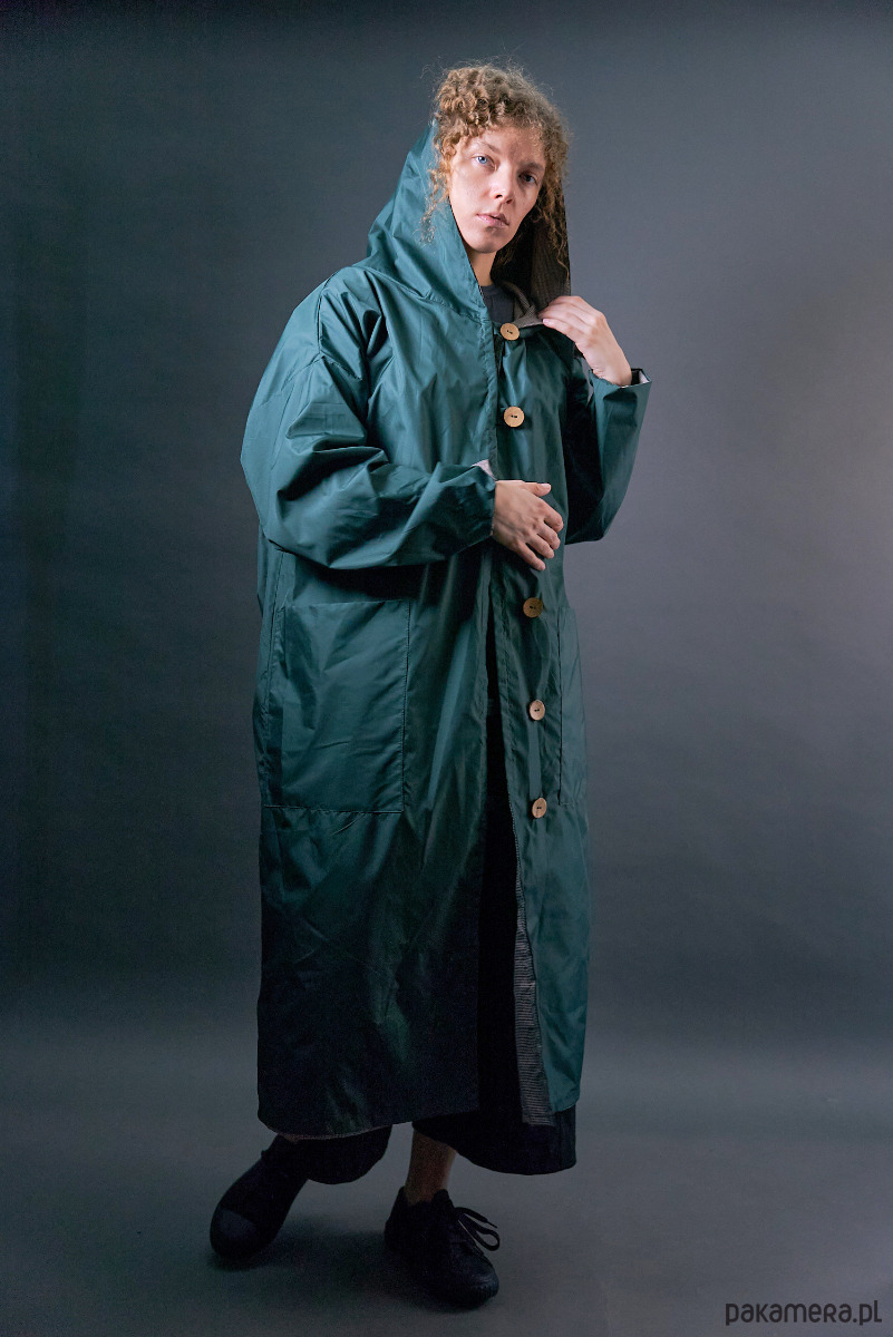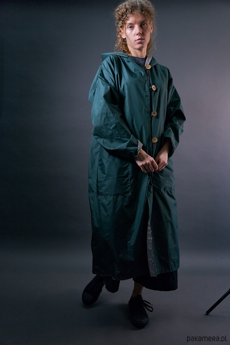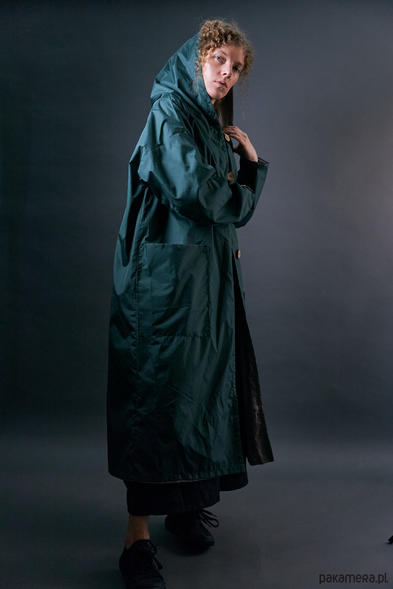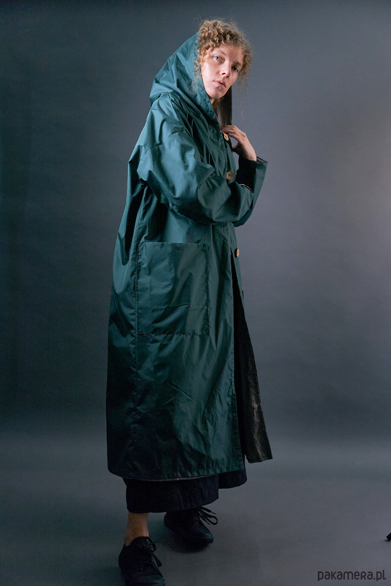 Długi zielony płaszcz impregnowany na podszewce z kapturem