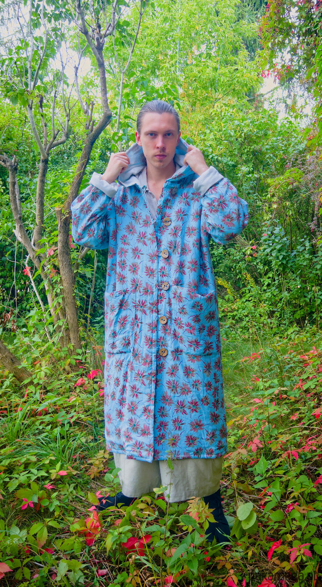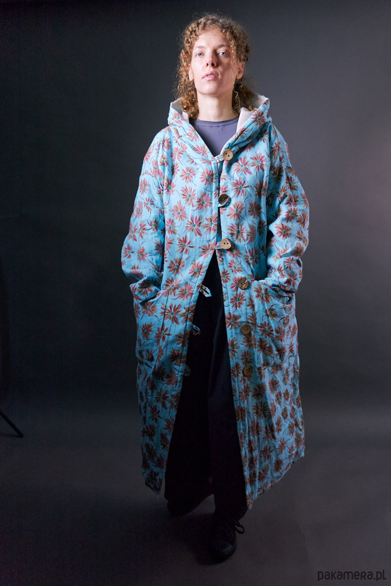Długi płaszcz lniany z kapturem lekko ocieplany błękitny w kwiaty