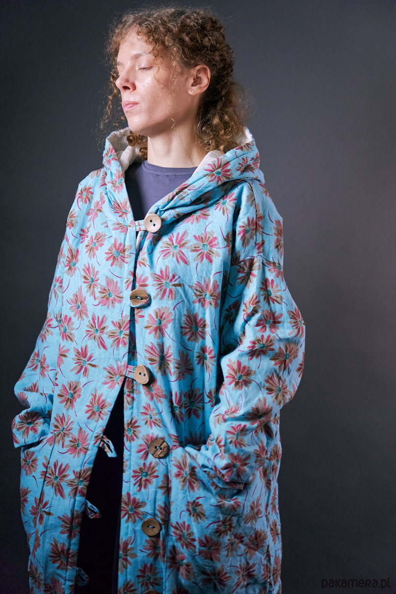 Długi płaszcz lniany ocieplany z kapturem w kwiaty