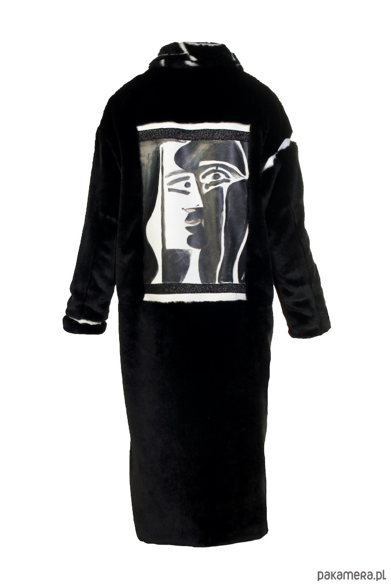 Wykonany z najwyższej jakości sztucznego futra. Posiada wbudowane kieszenie oraz elegancką podszewkę. Elementy obrazów Pabla Picassa są malowane ręcznie.