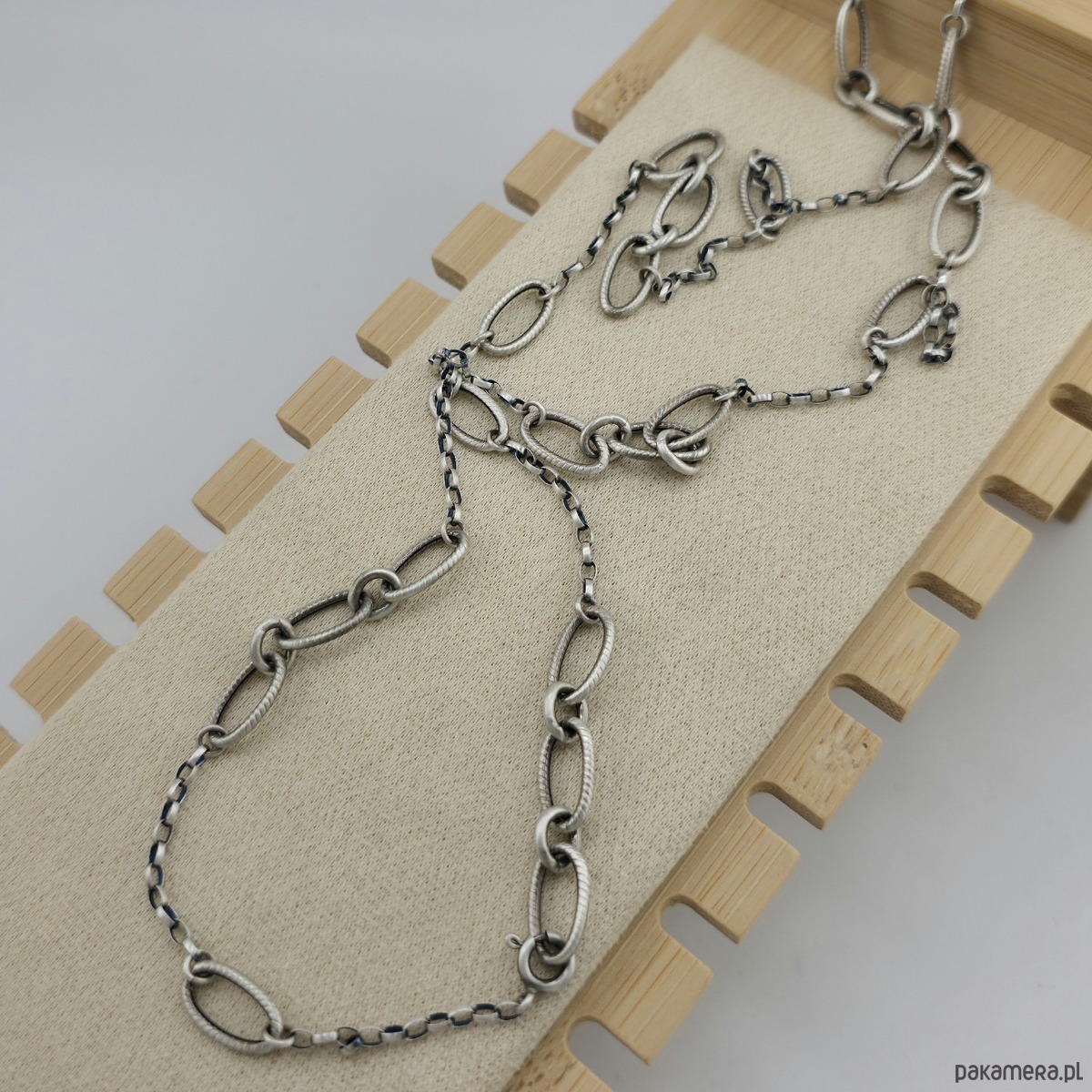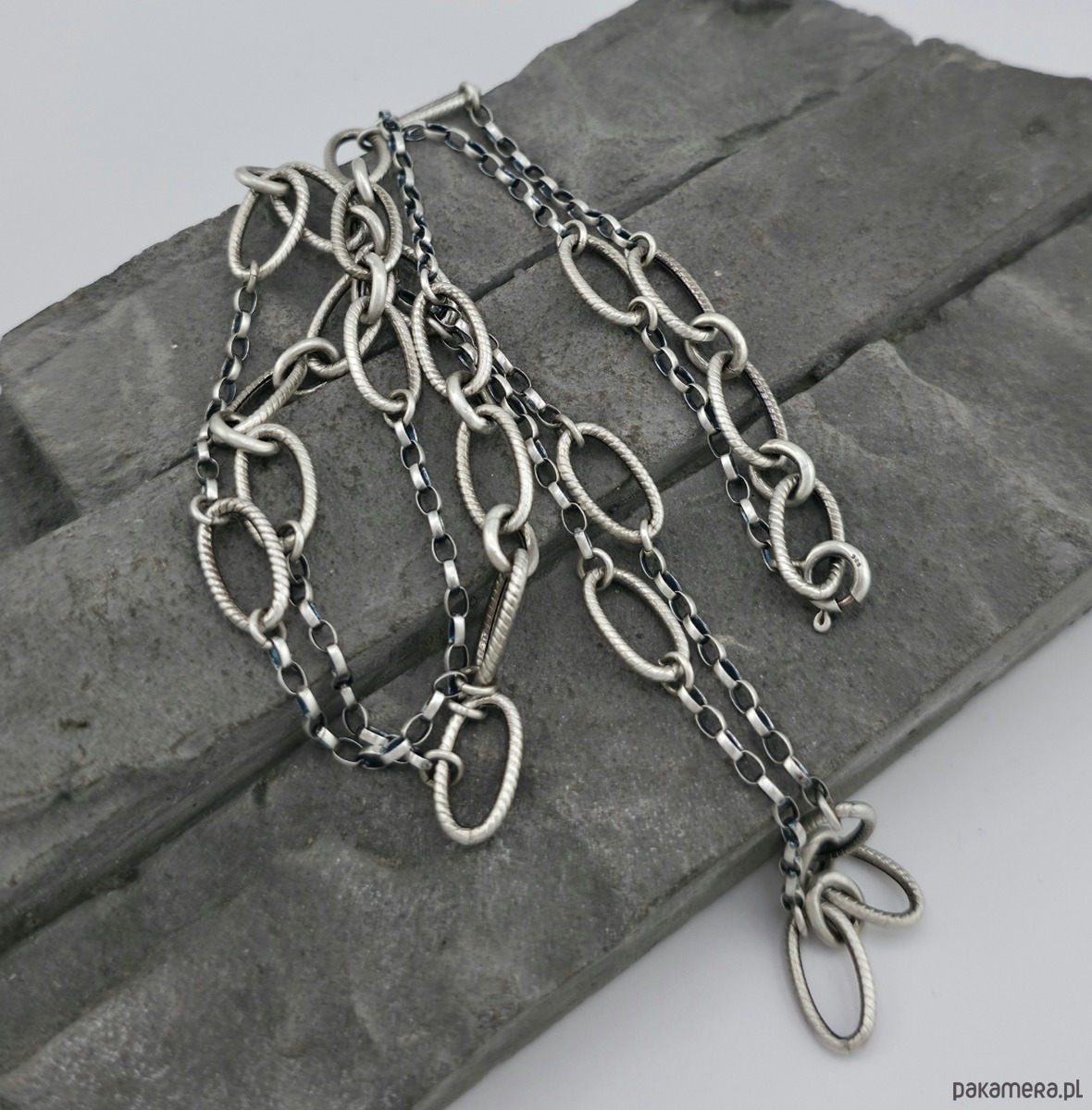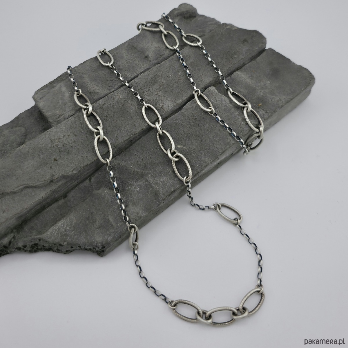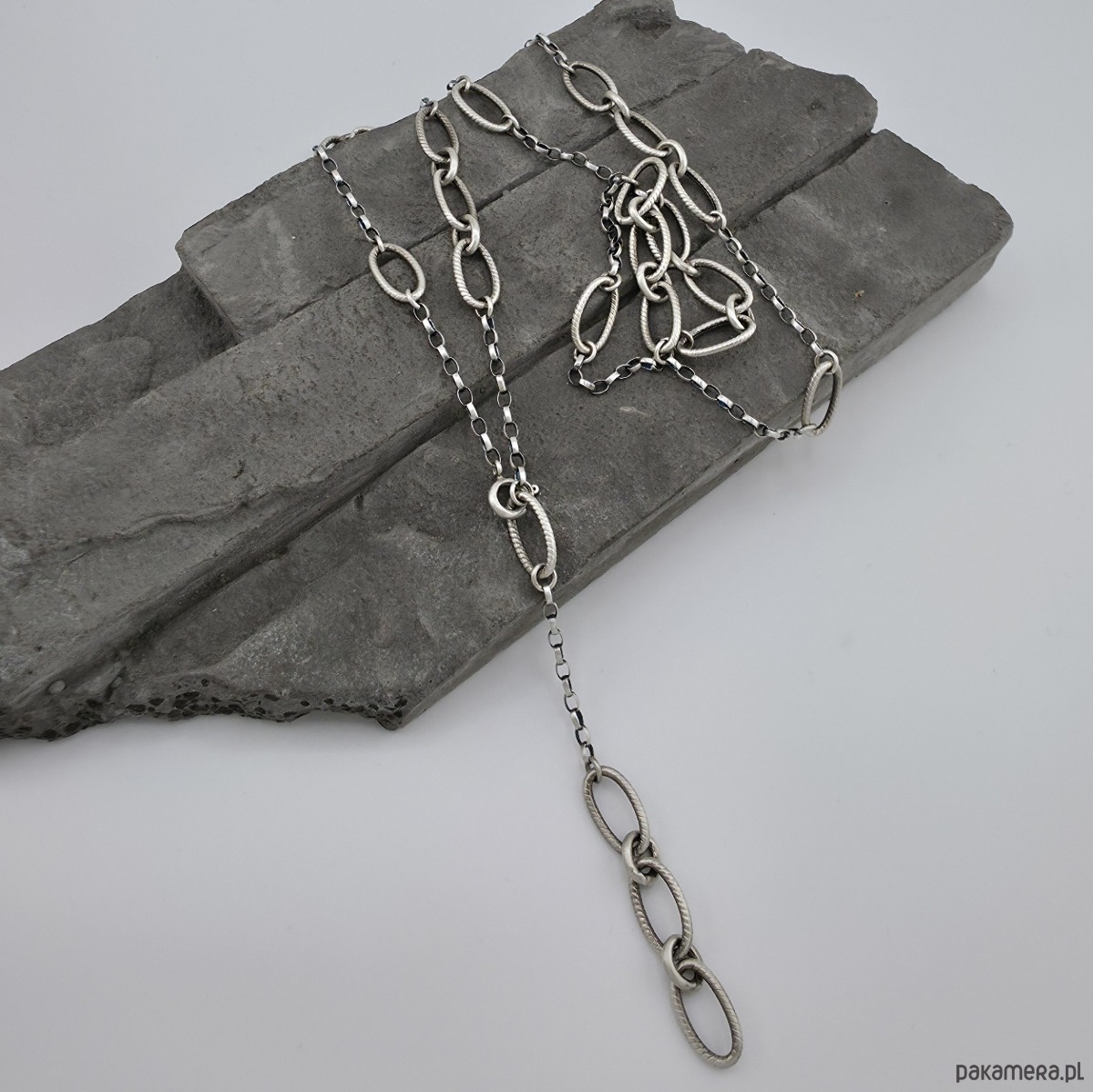 Minimalistyczny, modny, dłuższy naszyjnik na co dzień i nie tylko. Wykonany w całości z oksydowanego srebra próby 925. Wielkość dużych ogniw łańcucha to 14,5x8 mm. Można go nosic na dwa sposoby. Naszyjnik można zapiąć na ostatnim ogniwie lub na wczesniejszym. Caĺkowity obwód naszyjnika to 77,5 cm. W mojej galerii bransoletka i kolczyki do kompletu. Ozdobnie zapakowany.