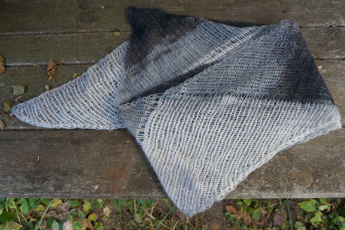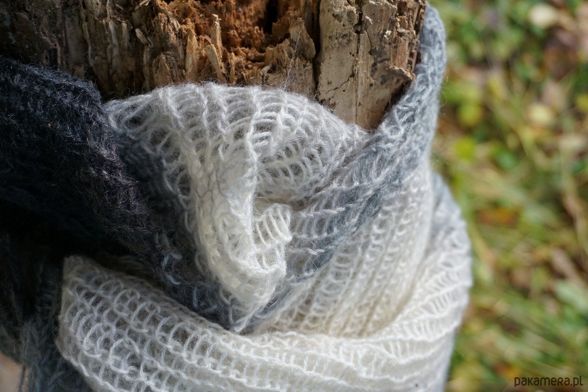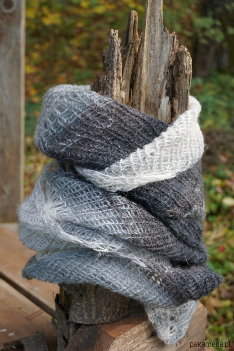Lekki, a jednocześnie ciepły szal wykonany ręcznie z mieszanki wełny i moheru. Ażurowy, luźny splot pięknie układa się na sylwetce, a odcienie szarości nadają mu elegancji i ponadczasowego charakteru. Szal jest długi i stylowy — idealny na chłodniejsze dni oraz jako subtelny dodatek do codziennych i bardziej wyjściowych stylizacji.