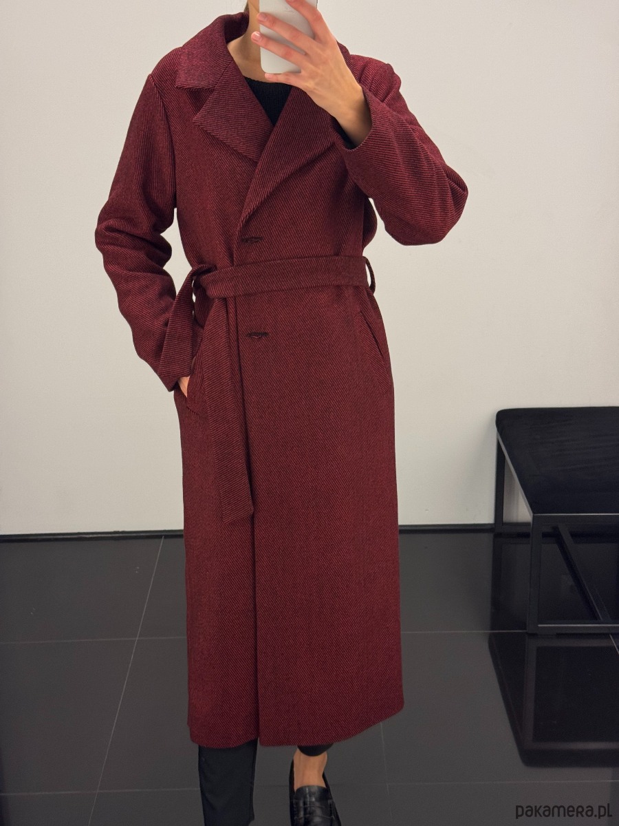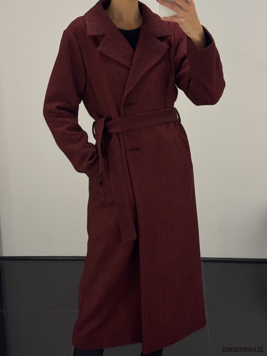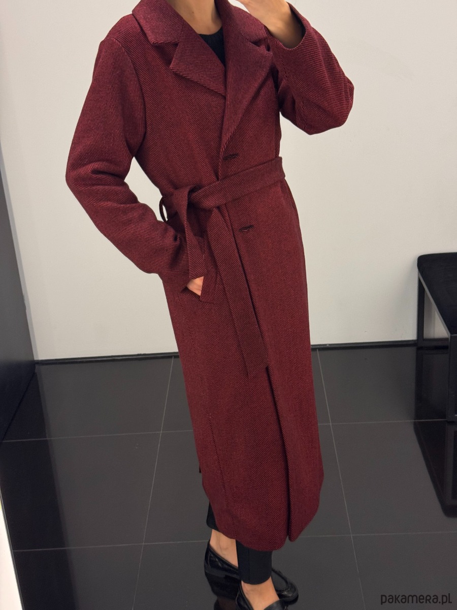 Premium płaszcz wełniany - miękki, w kolorze czerwonego wina wpadającym w bordo z czernią - diagonal (czyli delikatne paseczki czerni z przeważającą wiśnią, czerwienią w kolorze czerwonego wina).