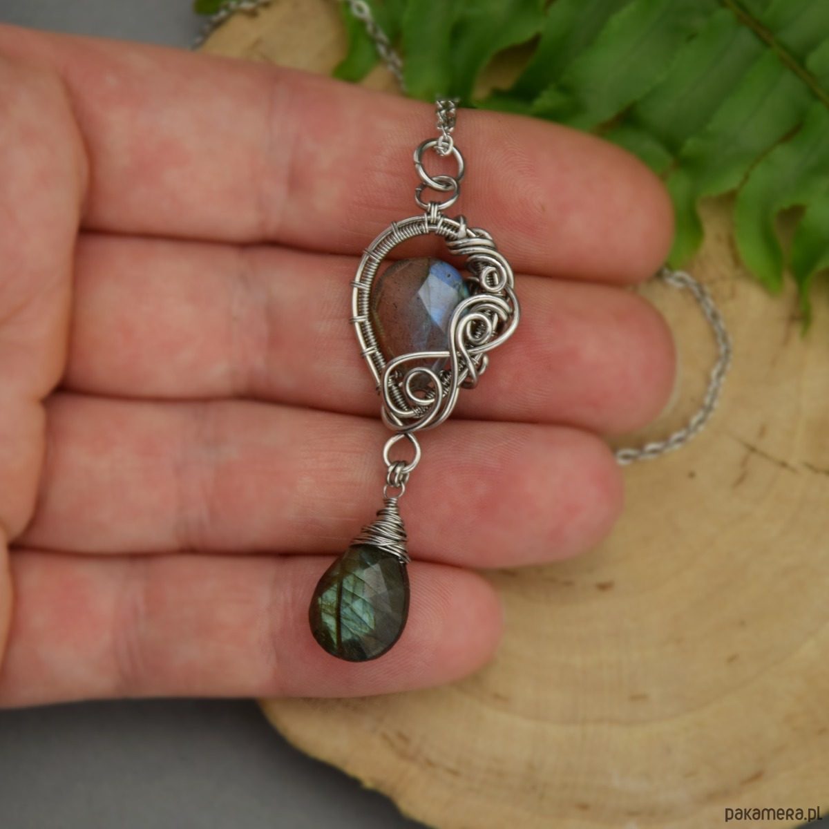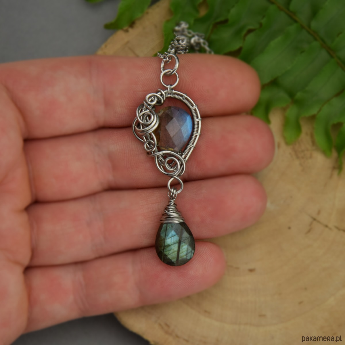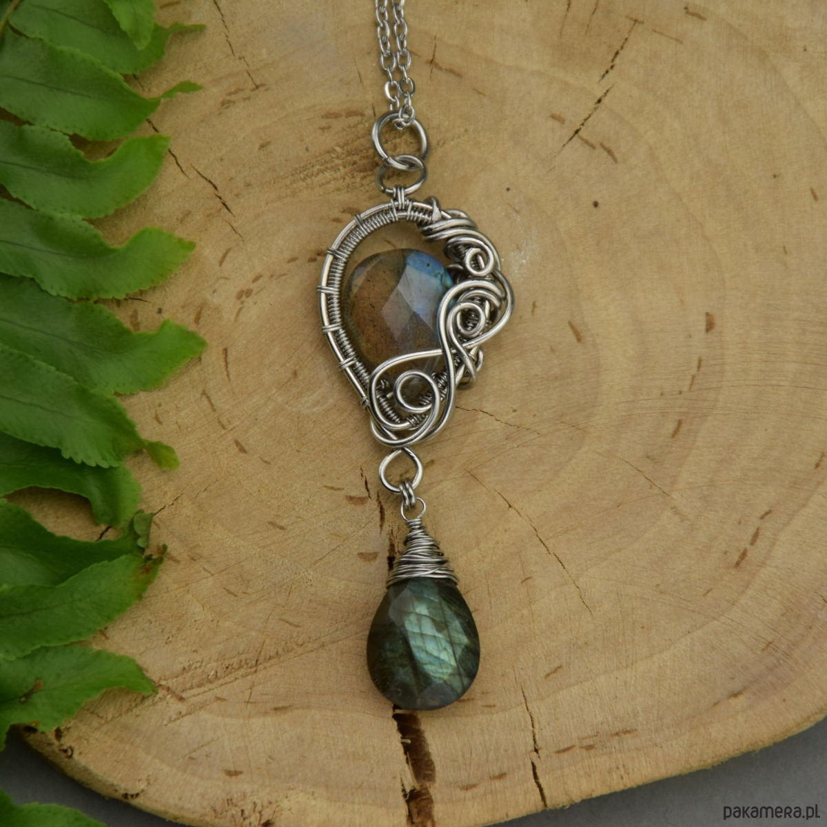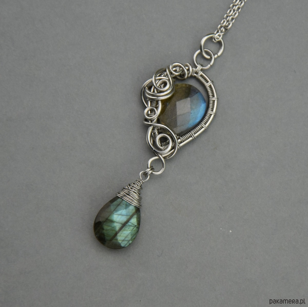 Wisiorek z dwoma labradorytami, wykonany ręcznie techniką wire wrapping z drutów ze stali chirurgicznej. Wisiorek jest obustronny.