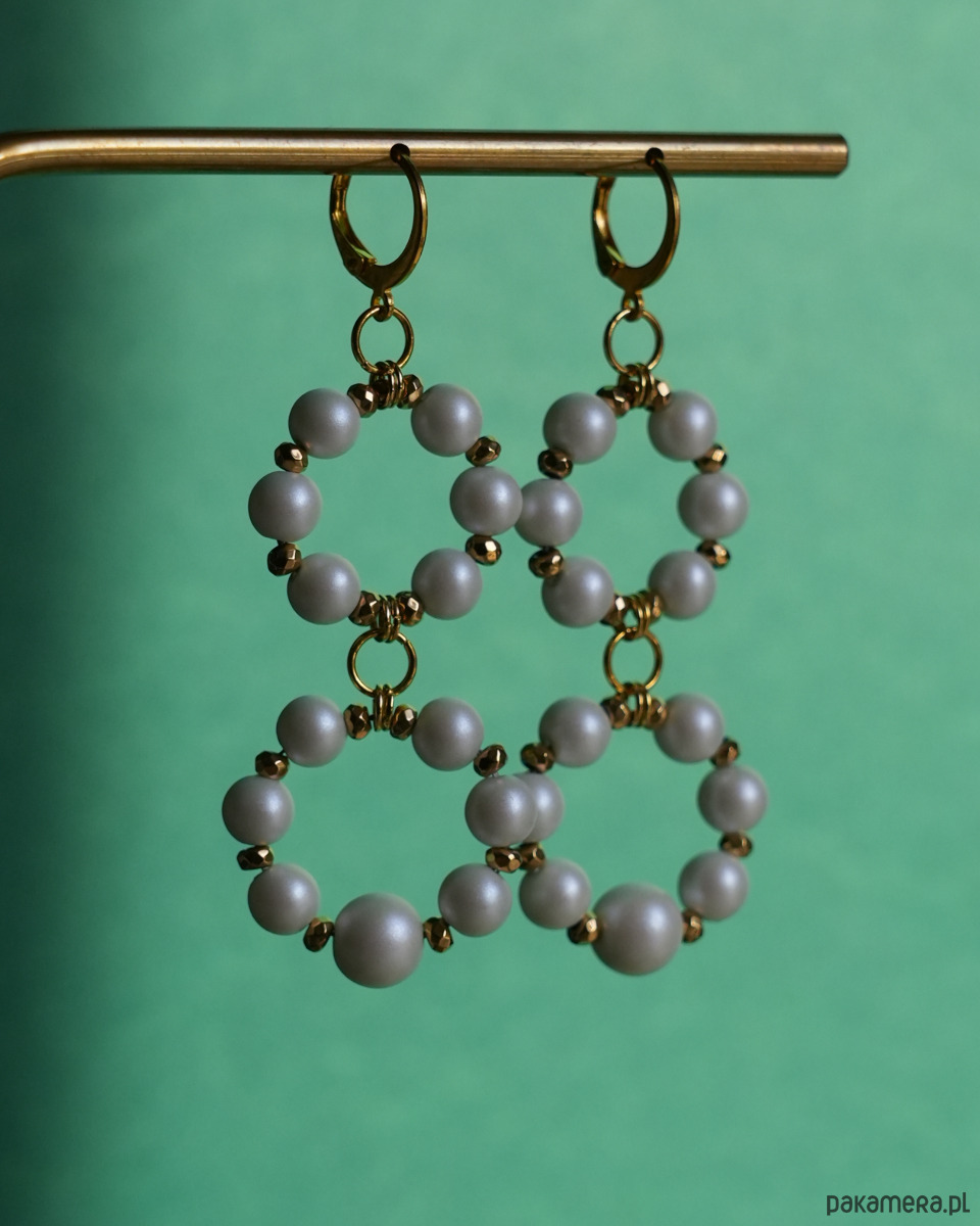 Delikatne kolczyki z 2 kółkami wykonanymi z białych, CERAMICZNYCH PEREŁ o pięknym, satynowym wykończeniu oraz złotego HEMATYTU. Okrągłe, zamykane bigle i kółka montażowe to STAL SZLACHETNA w kolorze złotym.
