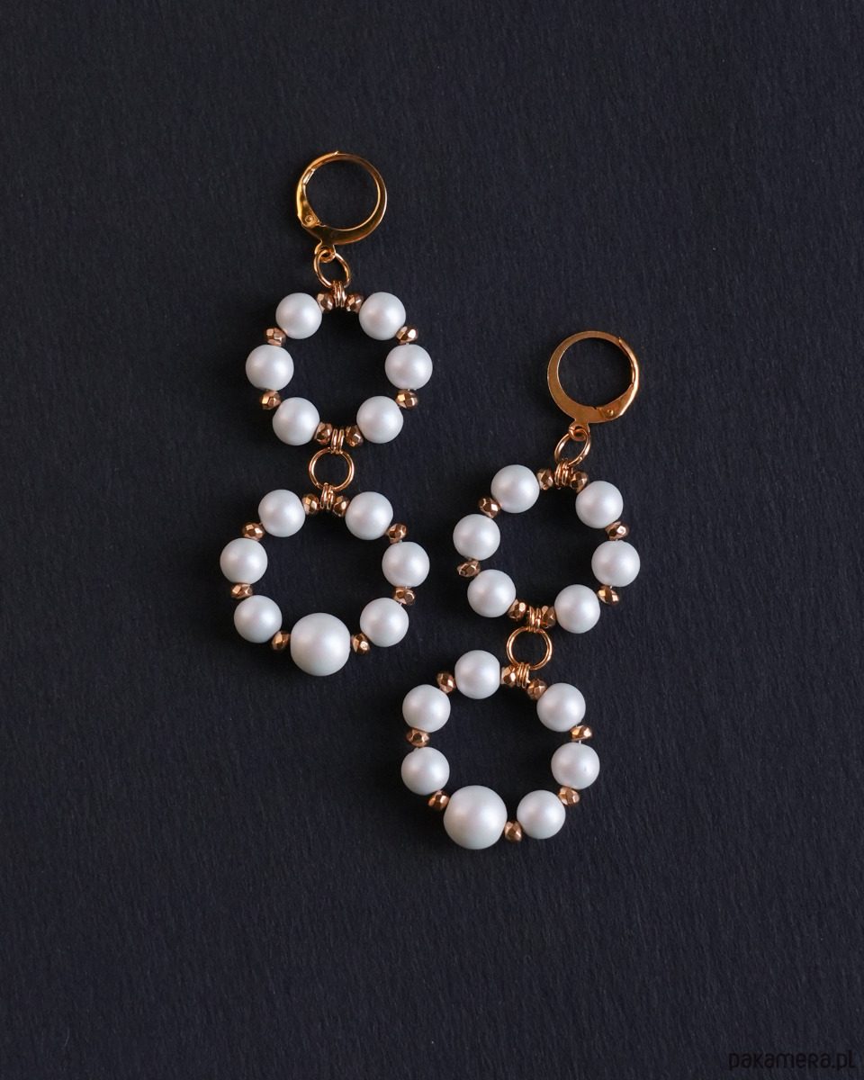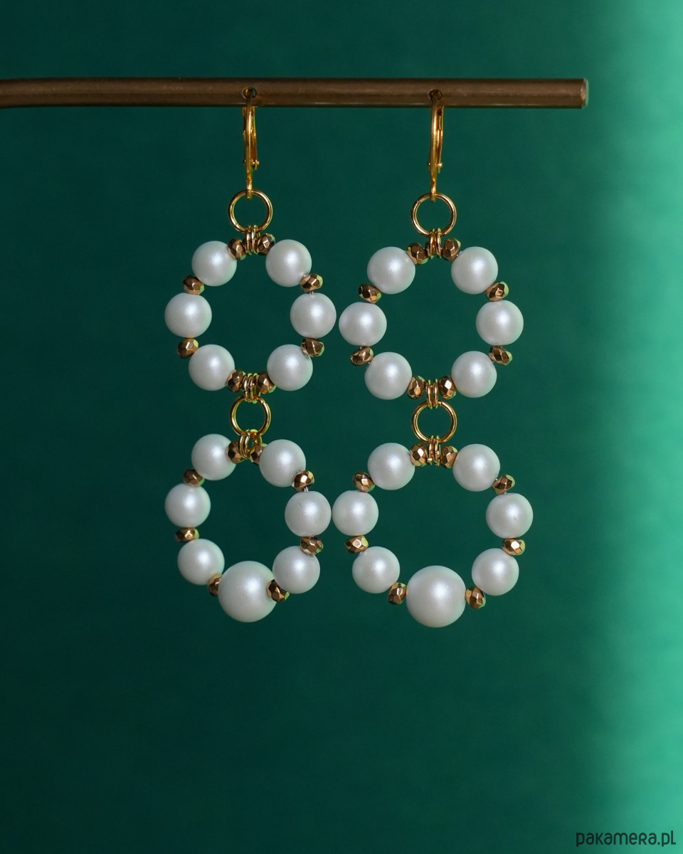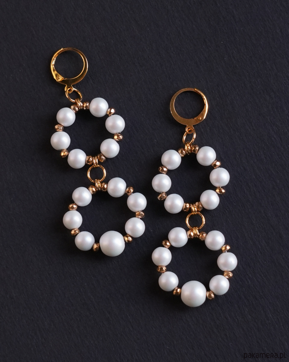 Eleganckie kolczyki z klasą, wykonane z białych, CERAMICZNYCH PEREŁ o pięknym, satynowym wykończeniu oraz złotego HEMATYTU. Okrągłe, zamykane bigle i kółka montażowe to STAL SZLACHETNA w kolorze złotym.