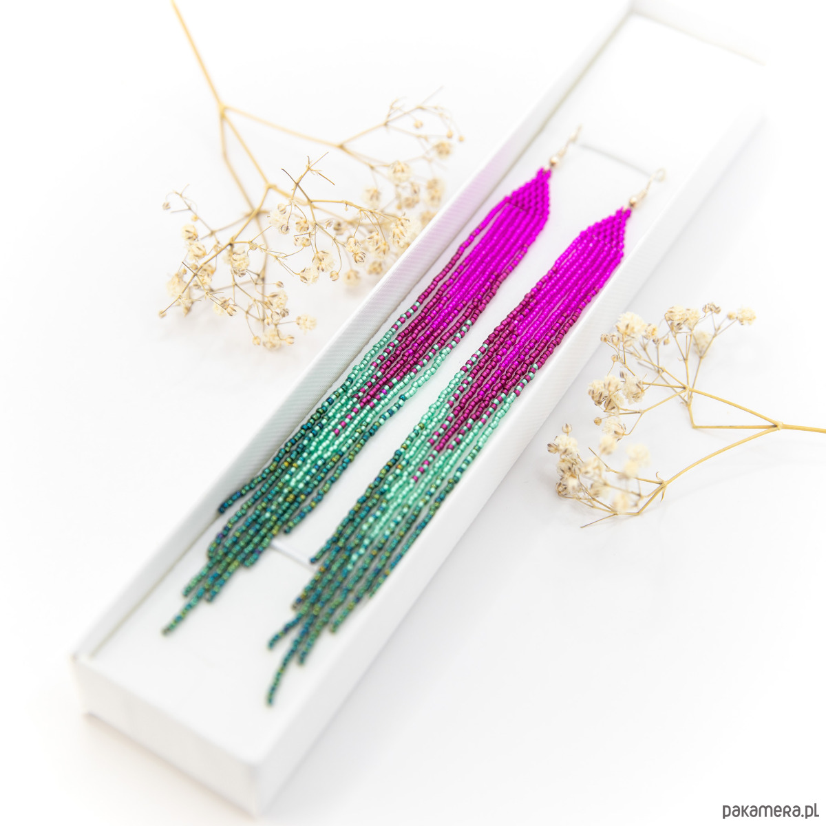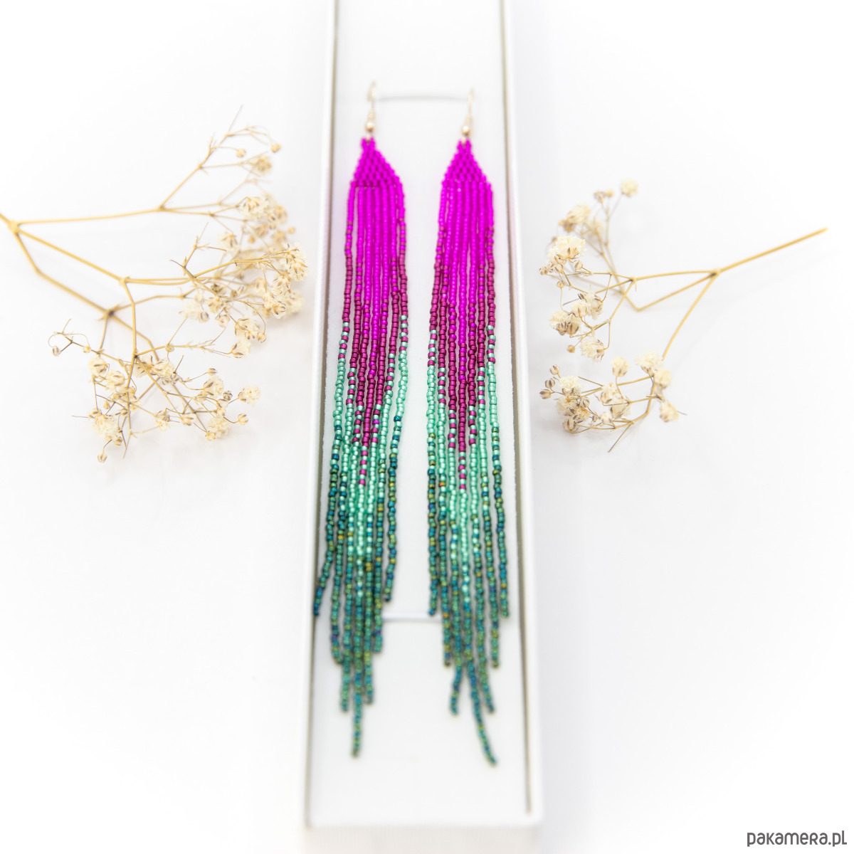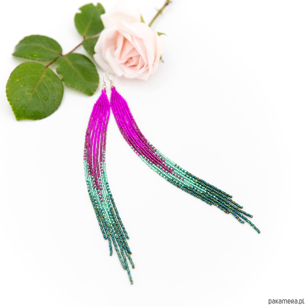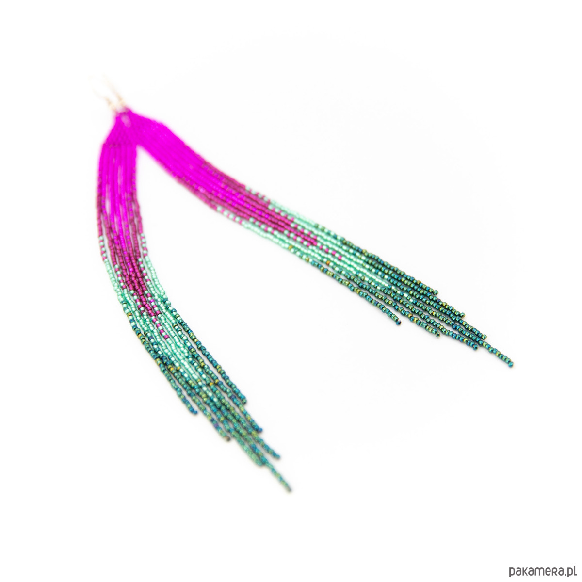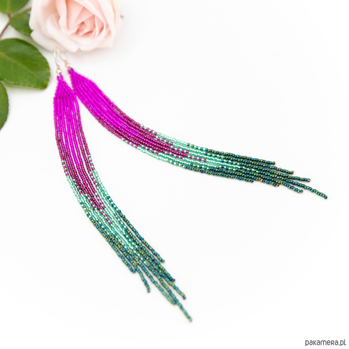 Długie, wąskie kolczyki, wykonane ze szklanych koralików okrągłych. Kolory: różowy, magenta, dwa odcienie zielonego.