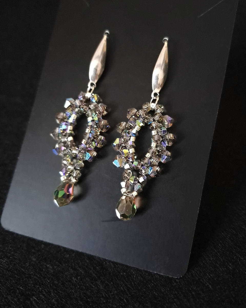 Ręcznie wykonane z kryształków Preciosa Bicone w kolorze Black Diamond AB (3 i 4 mm), które odbijają światło subtelną mgiełką chłodnych barw - od grafitu, przez lawendę, aż po zgaszone srebro.