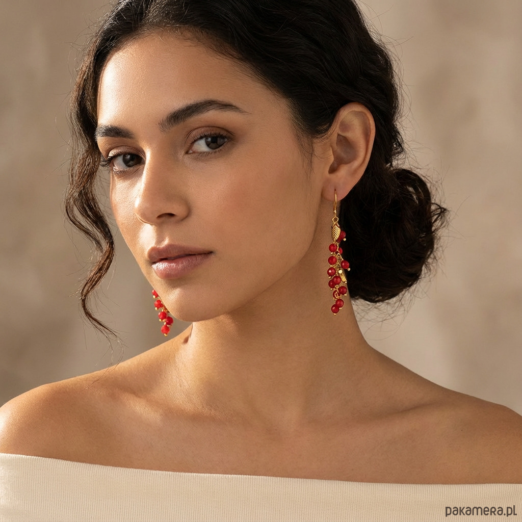 Długie kolczyki gronka z czerwonym koralem, pozłacane srebro 925