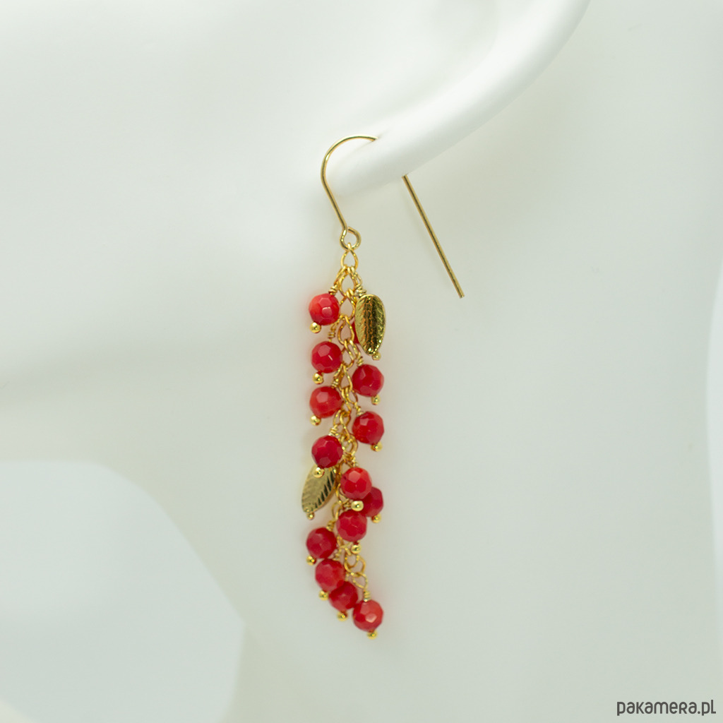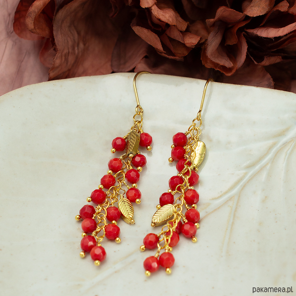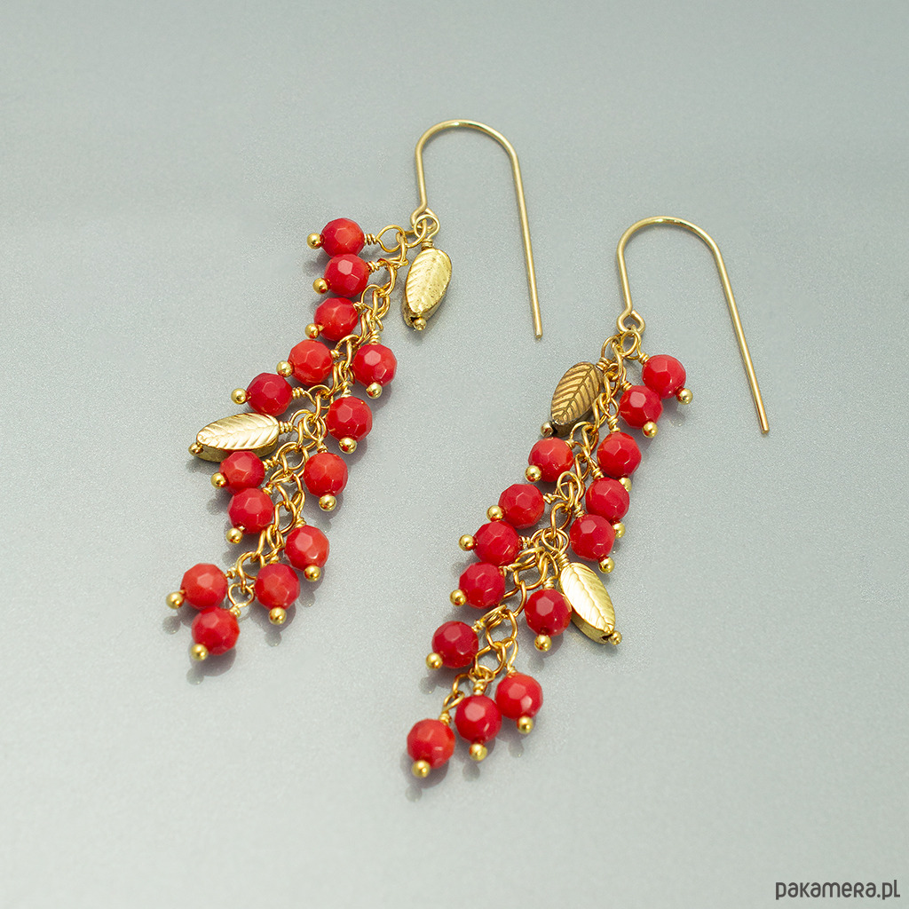 Długie, efektowne kolczyki gronka z naturalnym koralem w kolorze czerwonym i listkami ze złoconego hematytu. Na wygodnych biglach haczykach, dobrze trzymają się na uszach.