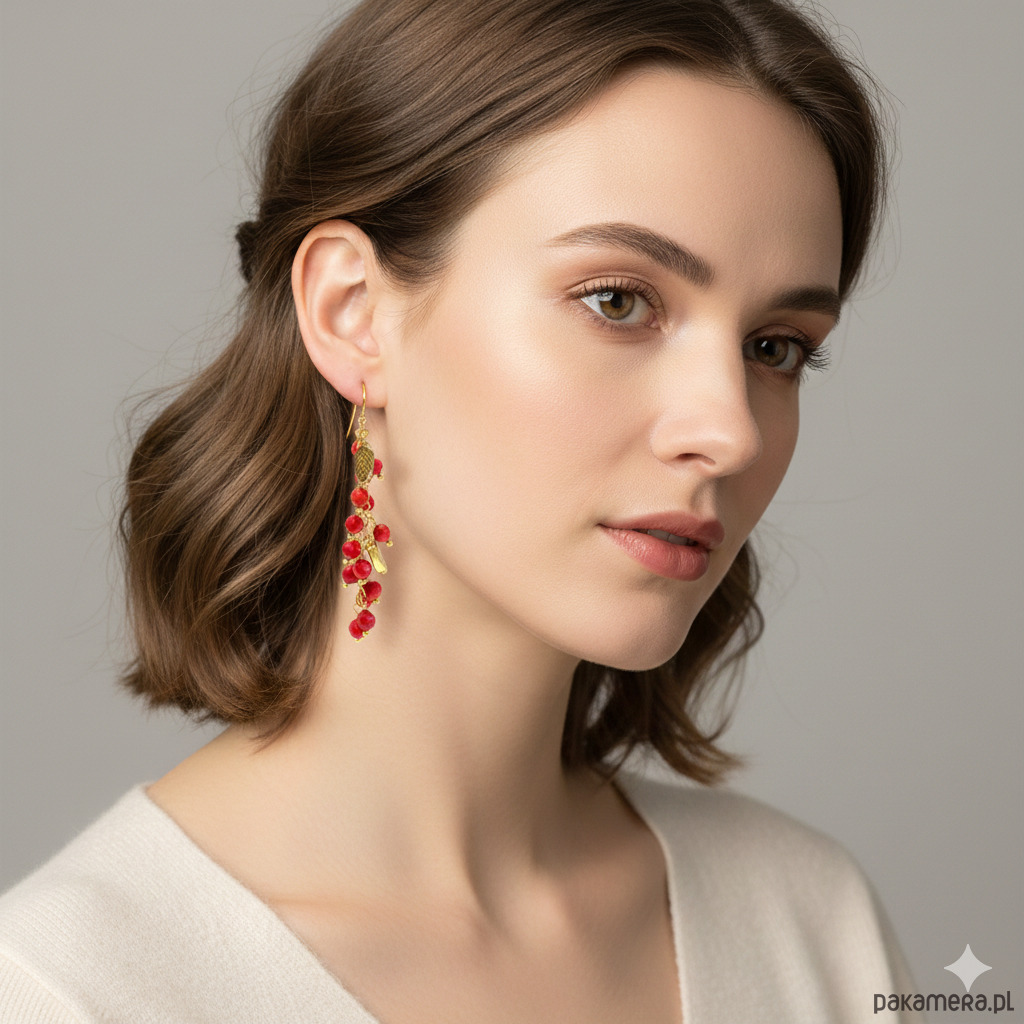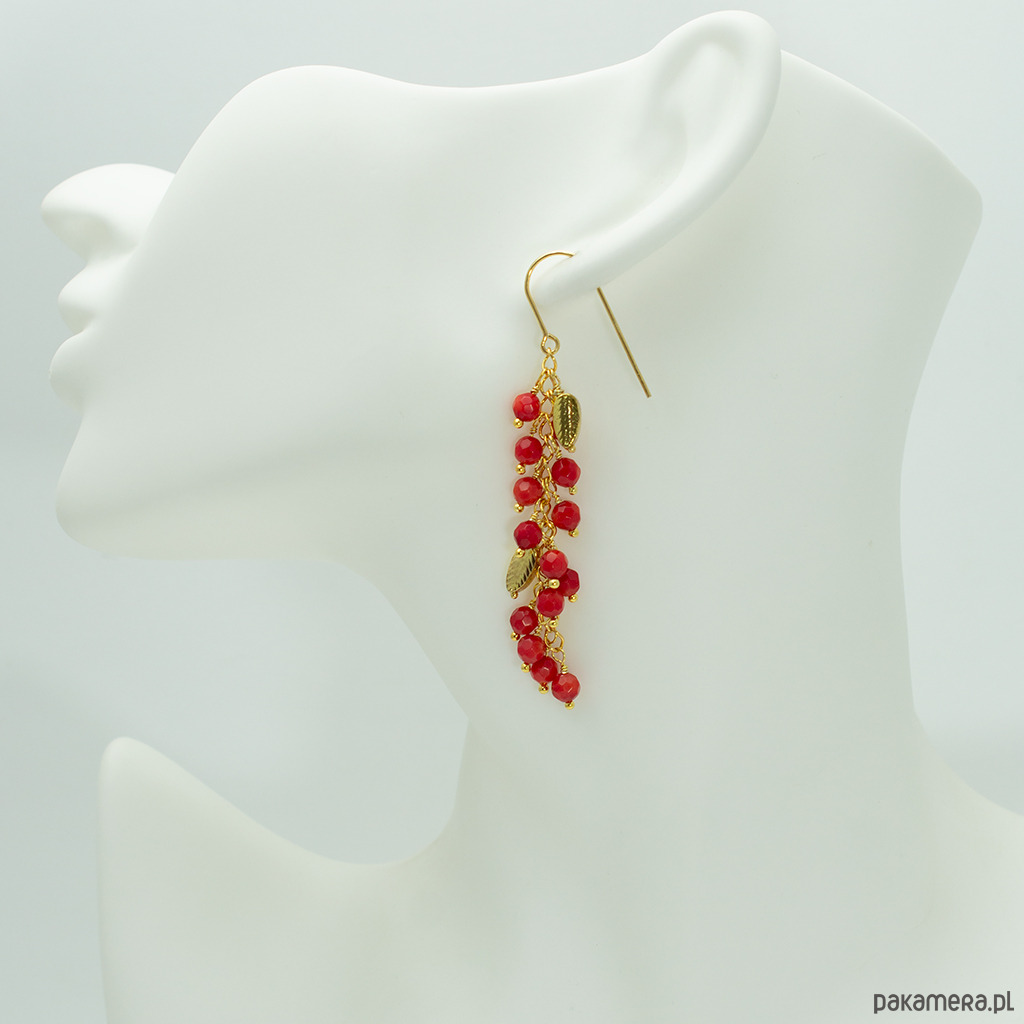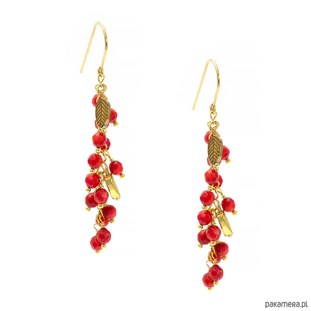Długie, efektowne kolczyki gronka z naturalnym koralem w kolorze czerwonym i listkami ze złoconego hematytu. Na wygodnych biglach haczykach, dobrze trzymają się na uszach.