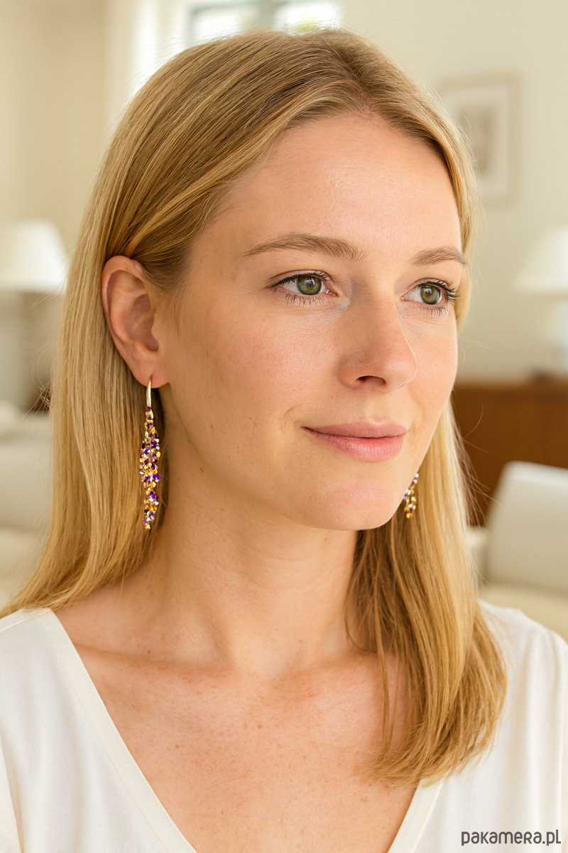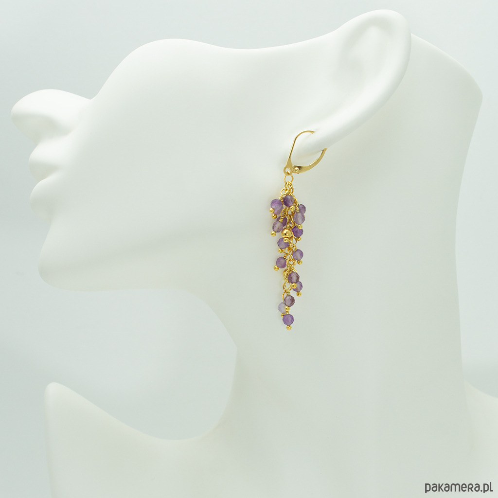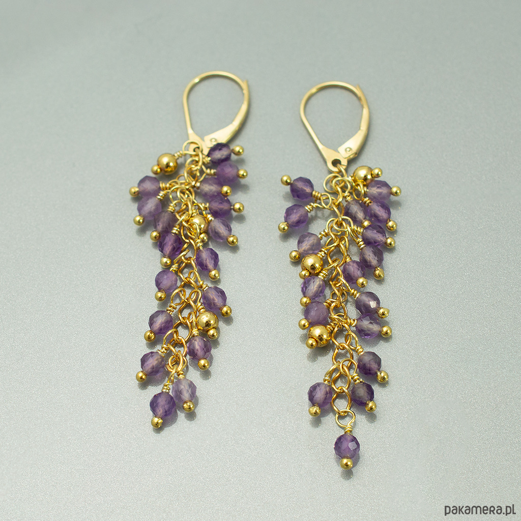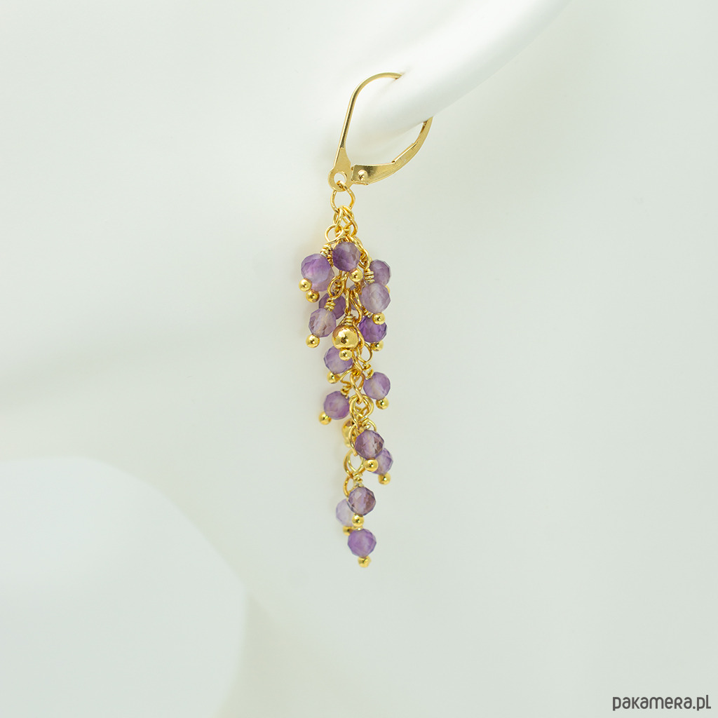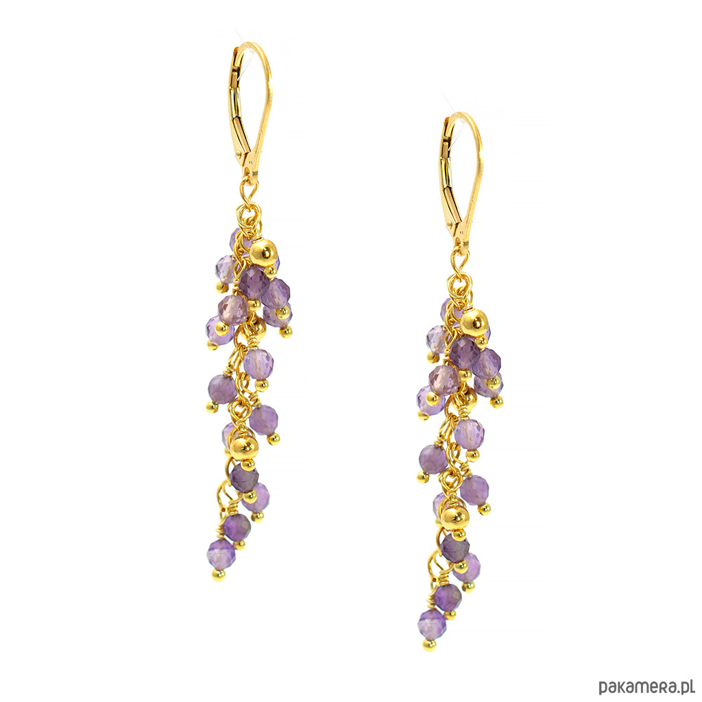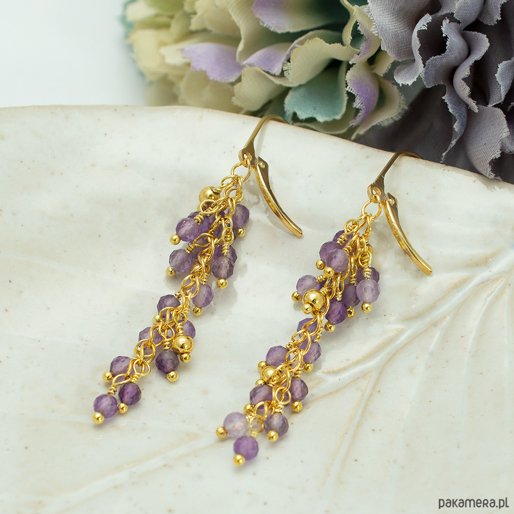 Długie kolczyki gronka z fioletowym ametystem, pozłacane srebro 925