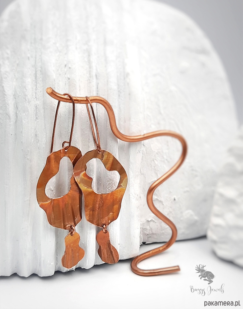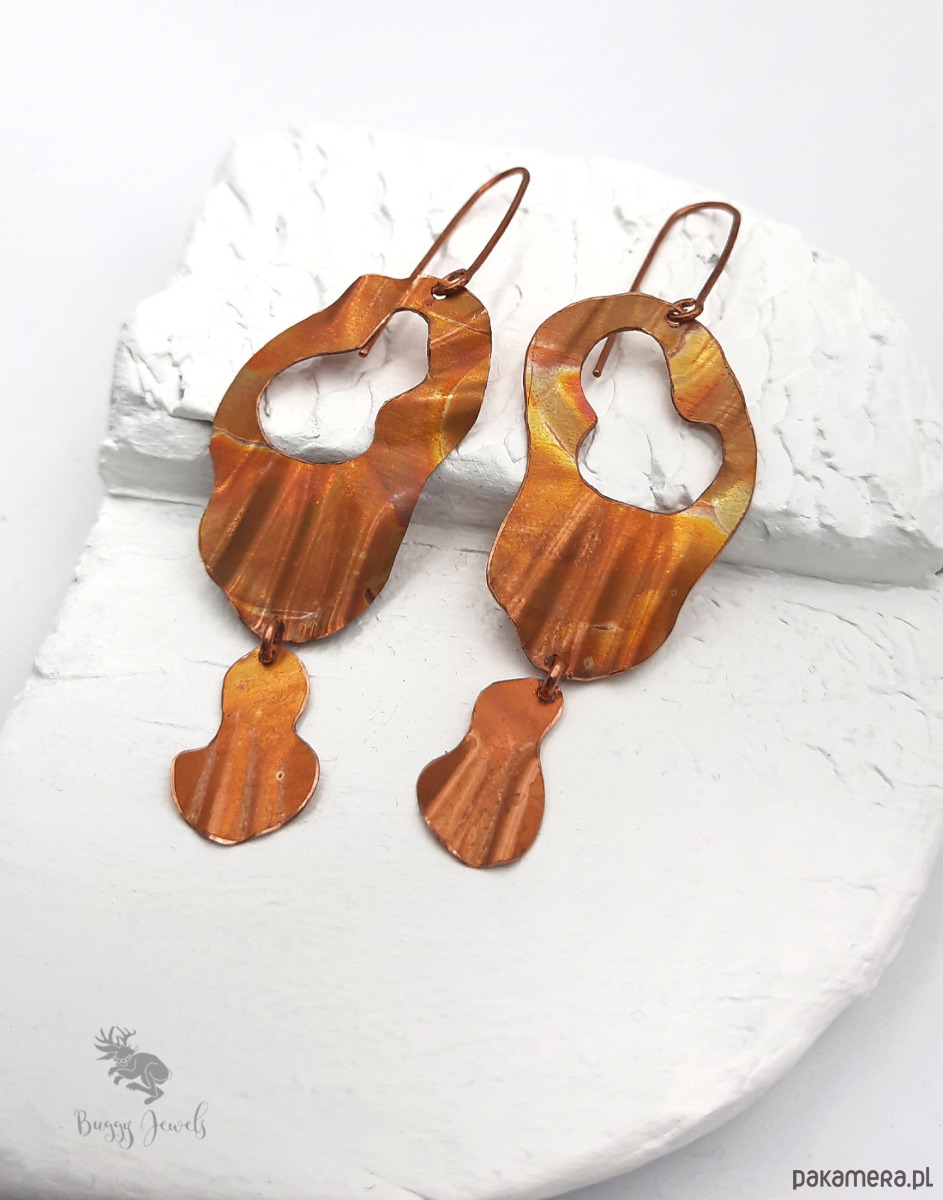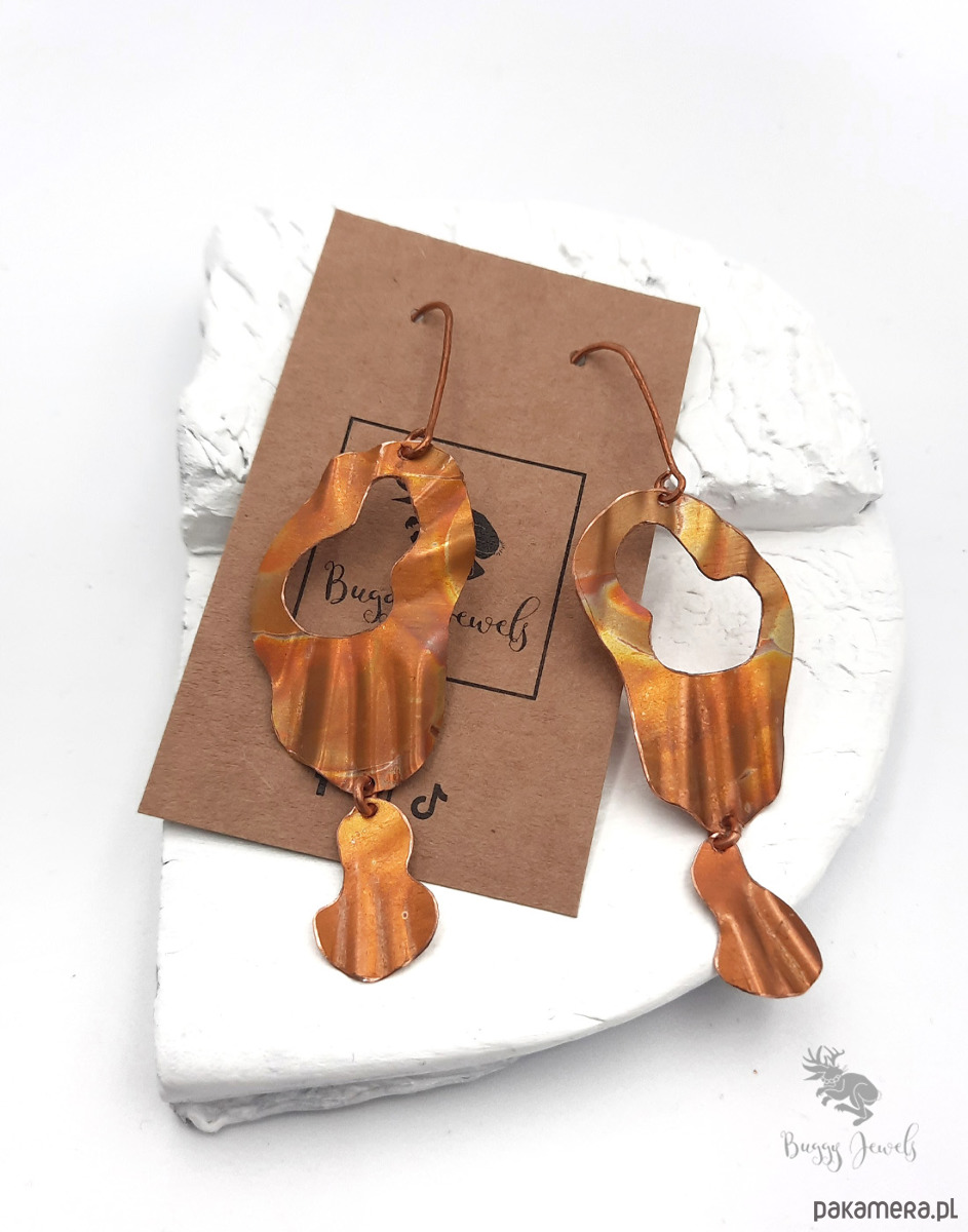 Kolczyki handmade wykonane w całości z miedzi, która została poddana barwieniu za pomocą ognia.
