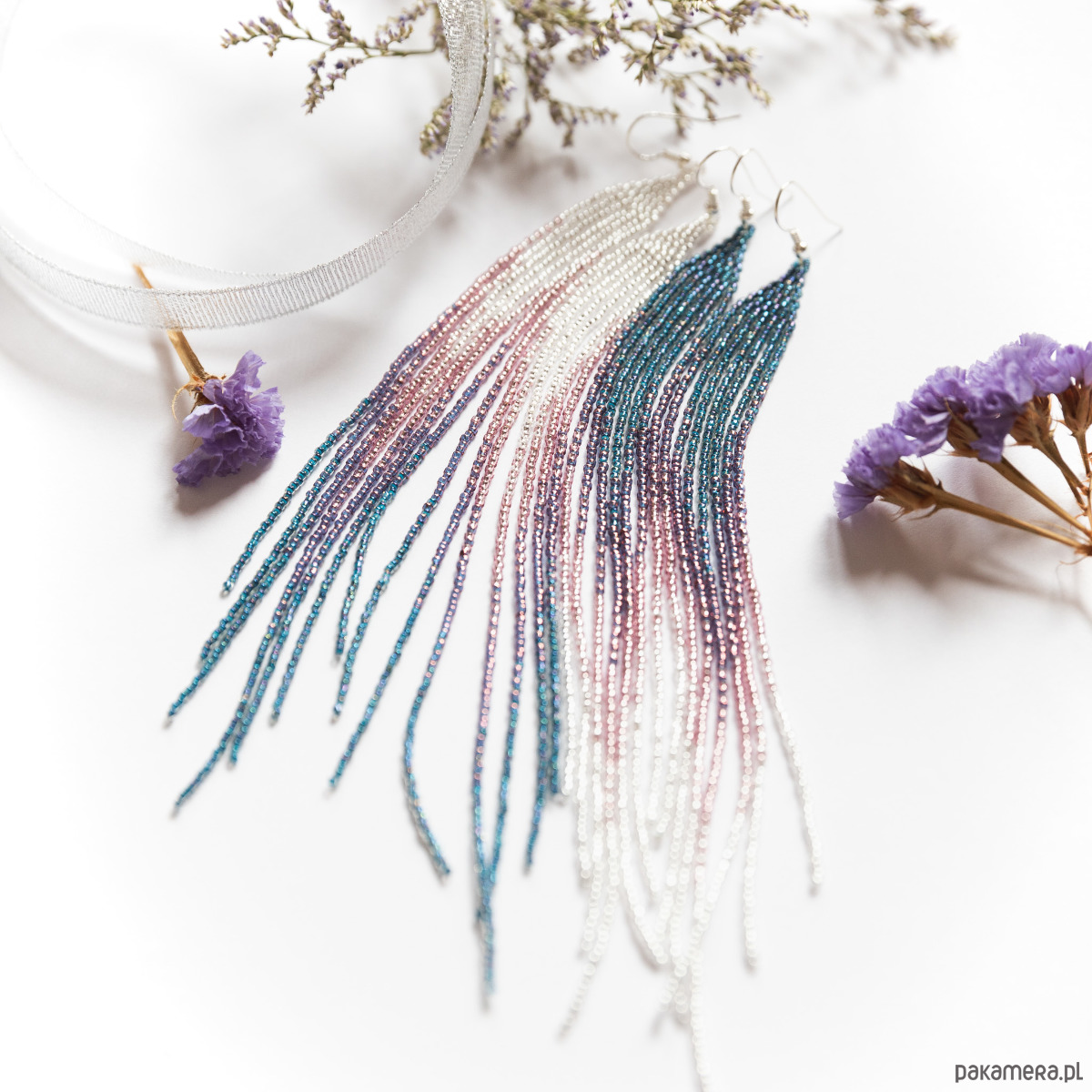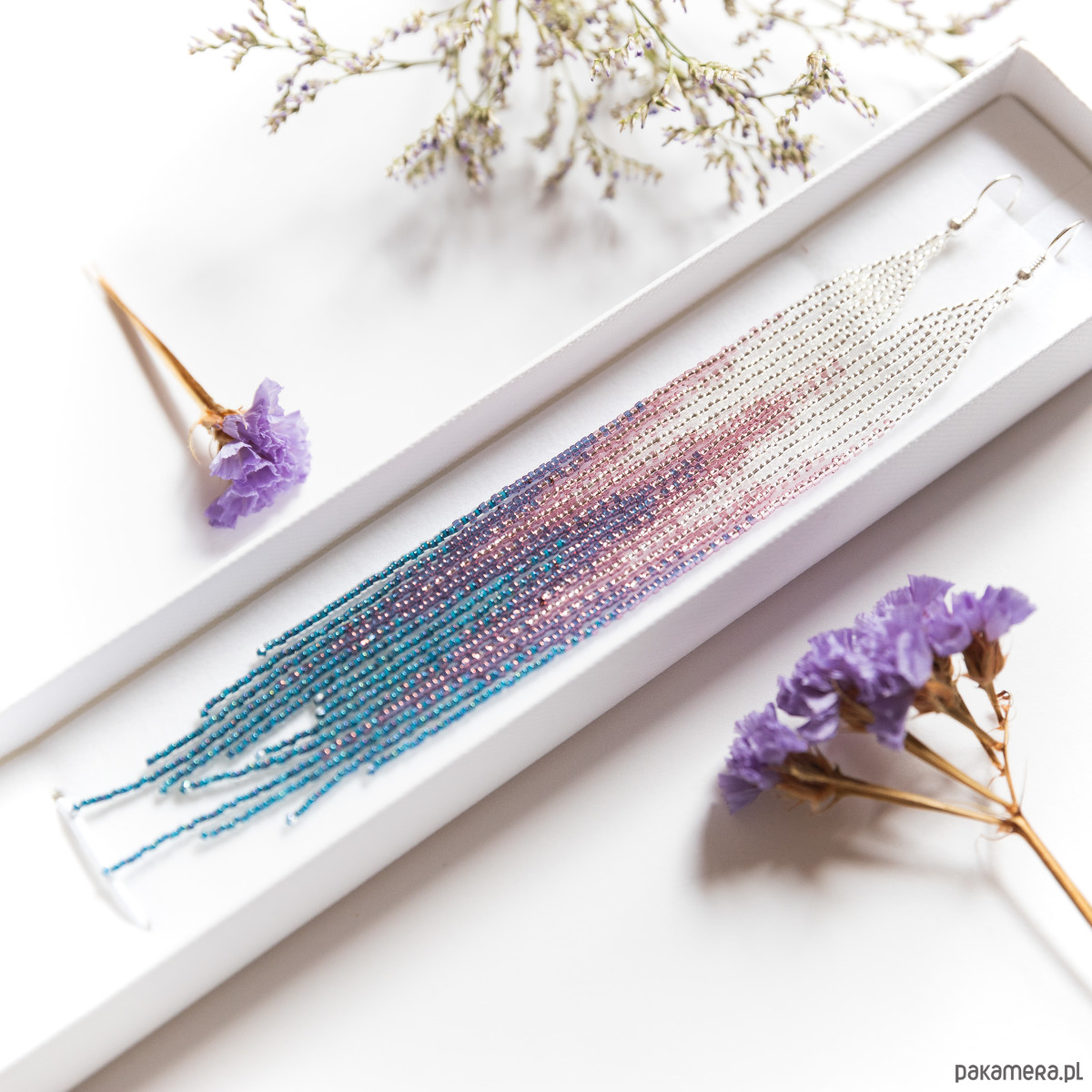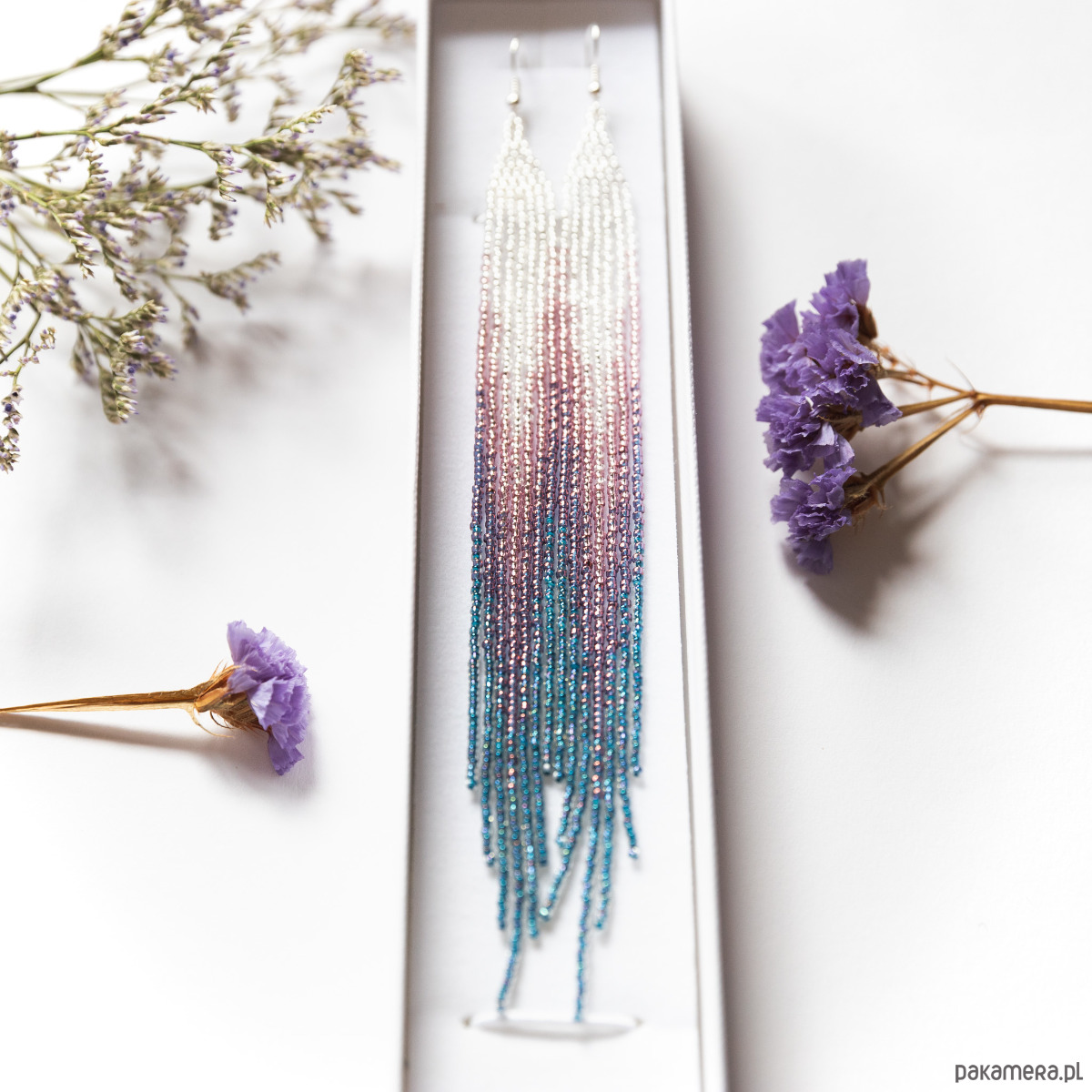 Długie, wąskie kolczyki, wykonane ze szklanych, okrągłych koralików w kolorach niebieskim, szaroróżowym i białym. Wymiary: 17,0cm (z biglem) x 1,2cm. Bigle srebrne.