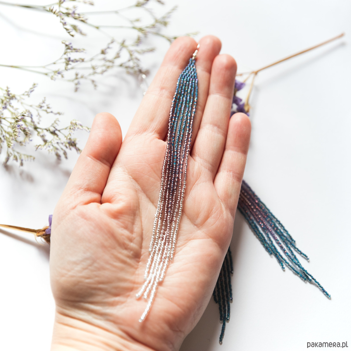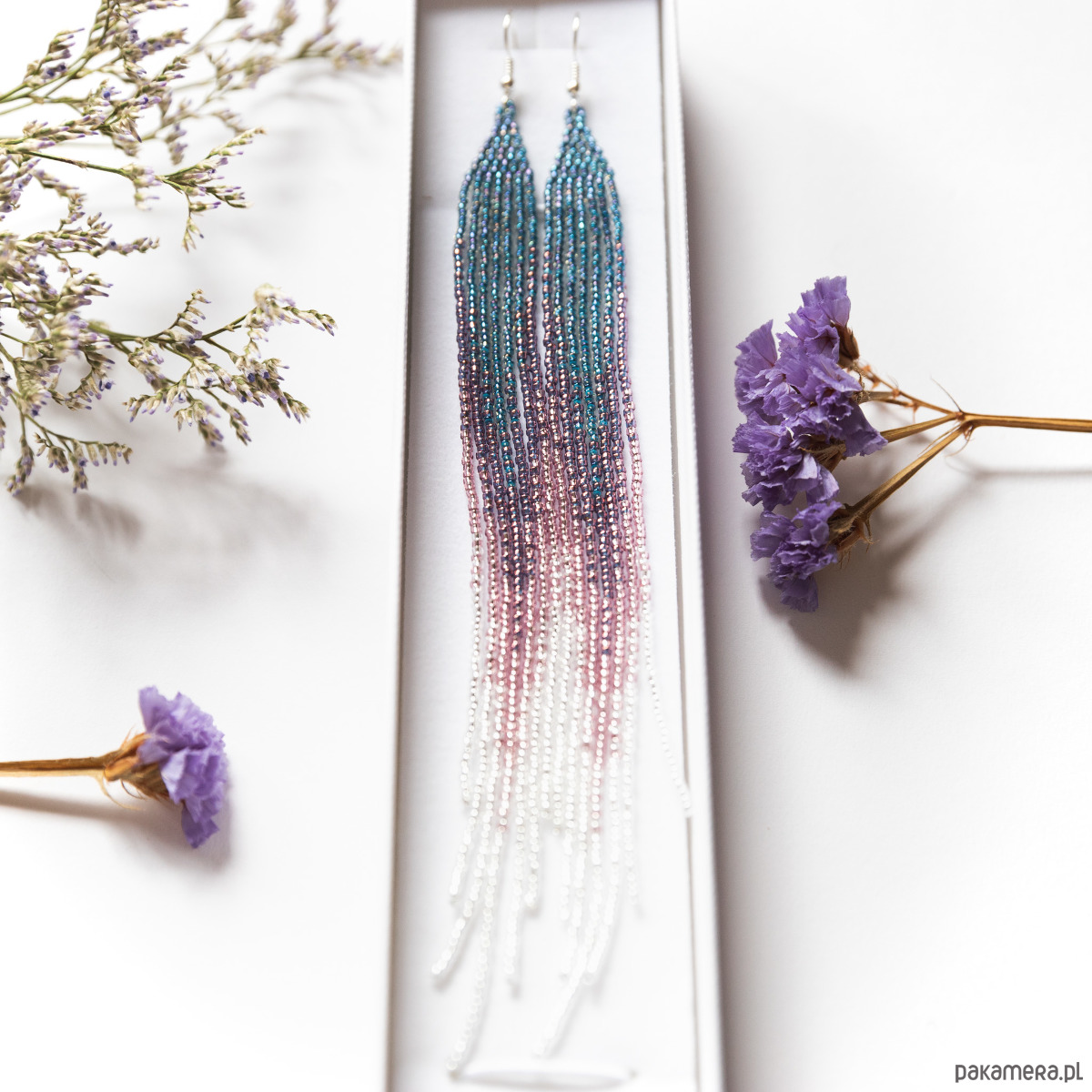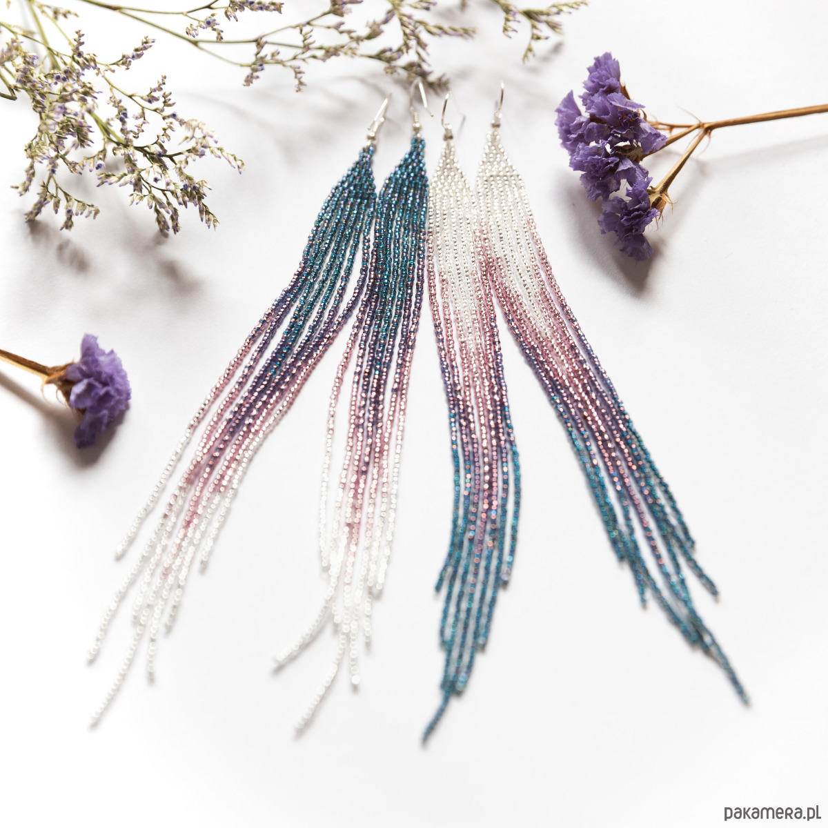 Długie, wąskie kolczyki, wykonane ze szklanych, okrągłych koralików w kolorach niebieskim, szaroróżowym i białym. Wymiary: 17,0cm (z biglem) x 1,2cm. Bigle srebrne.