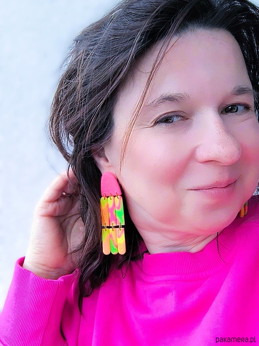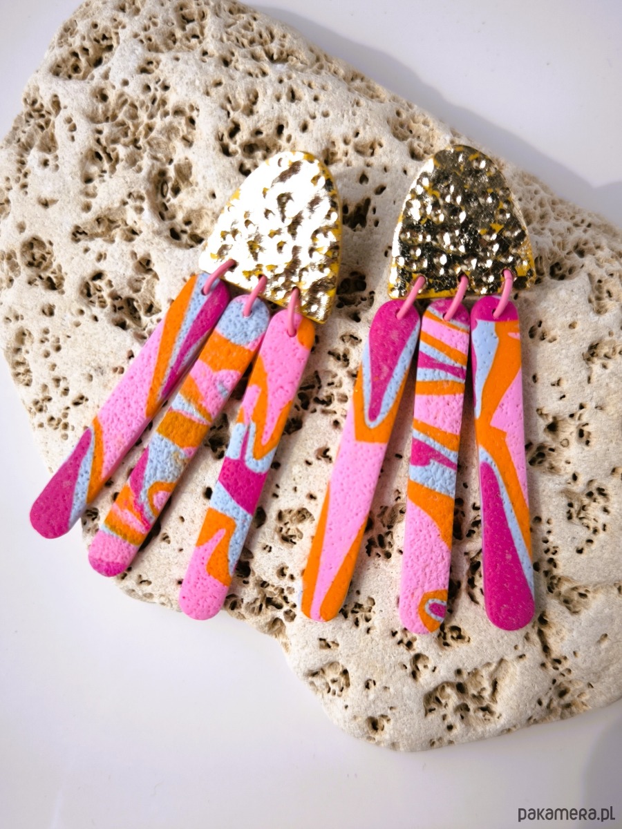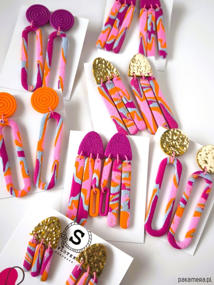 Dzięki glince polimerowej te kolczyki są wyjątkowo lekkie i wygodne – możesz nosić je przez cały dzień, nie czując ich na uszach. Połączone elementy sprawiają, że kolczyki swobodnie się poruszają, dodając im lekkości i dynamiki.