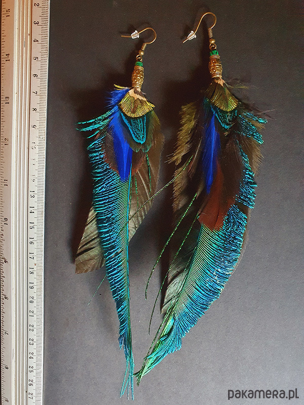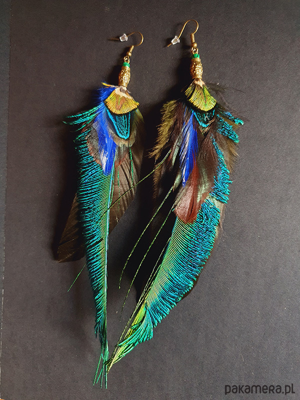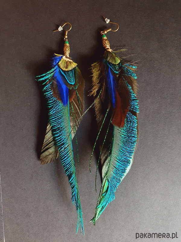 Piękne kolorowe kolczyki z różnych gatunków naturalnych piór /paw, bażant, kogut/