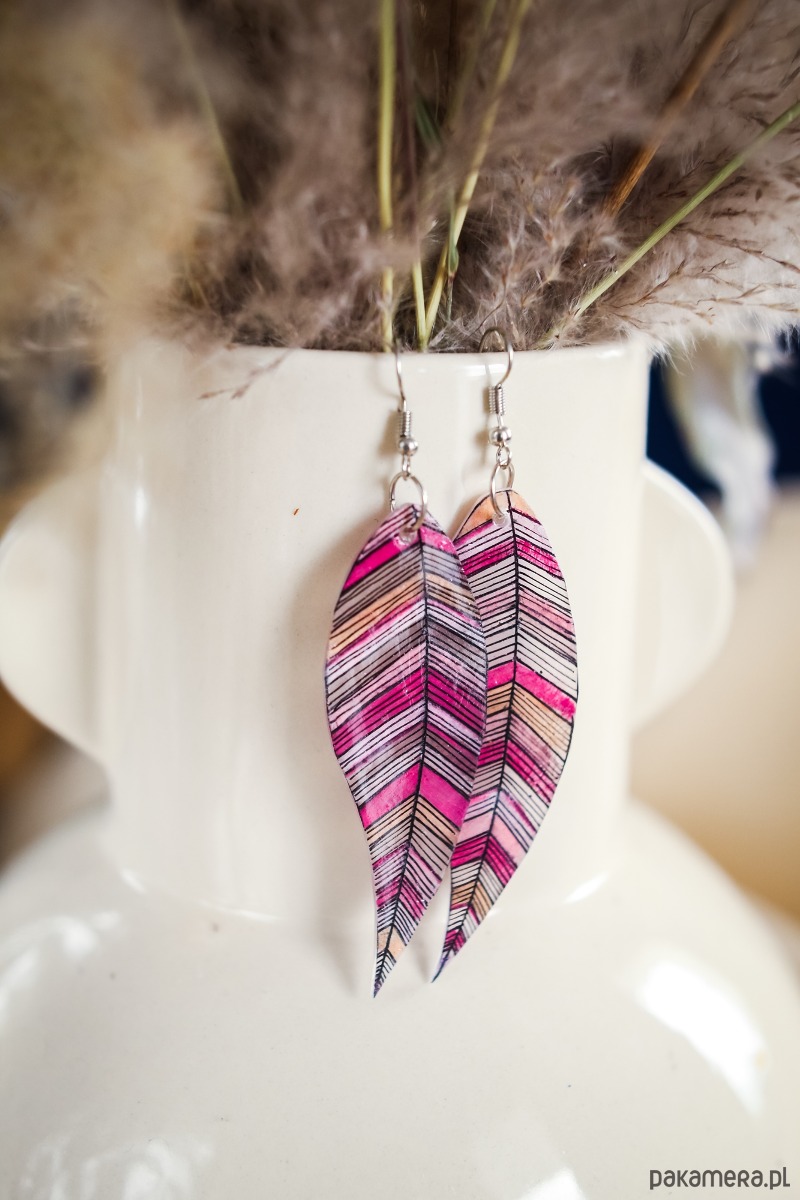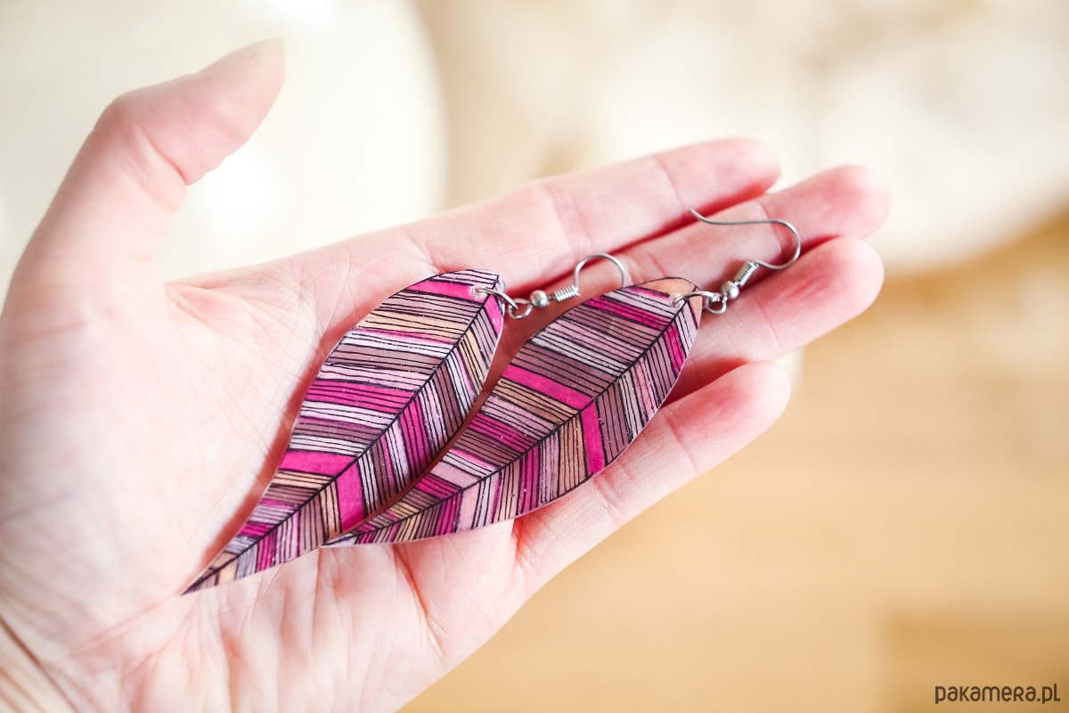 Powierzchnia listków została zabezpieczona kilkoma warstwami błyszczącego lakieru ekologicznego, dzięki czemu kolczyki ładnie mienią się w słońcu.