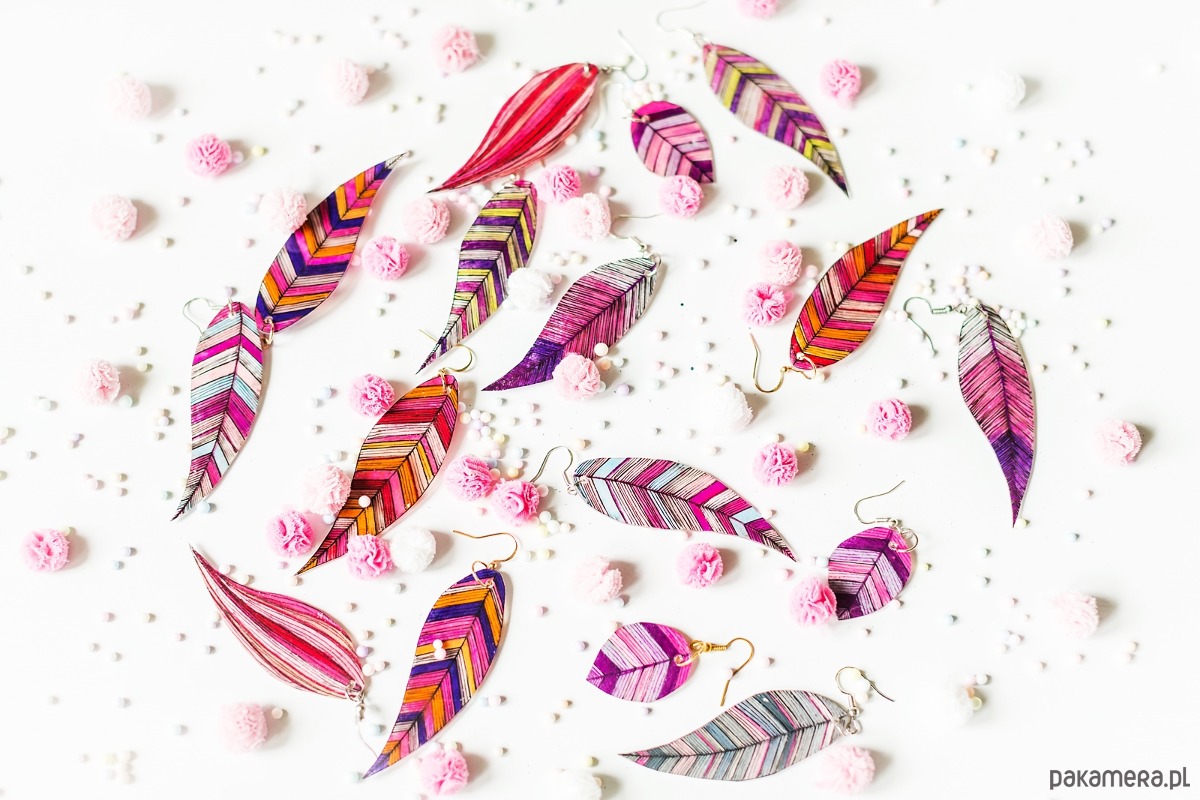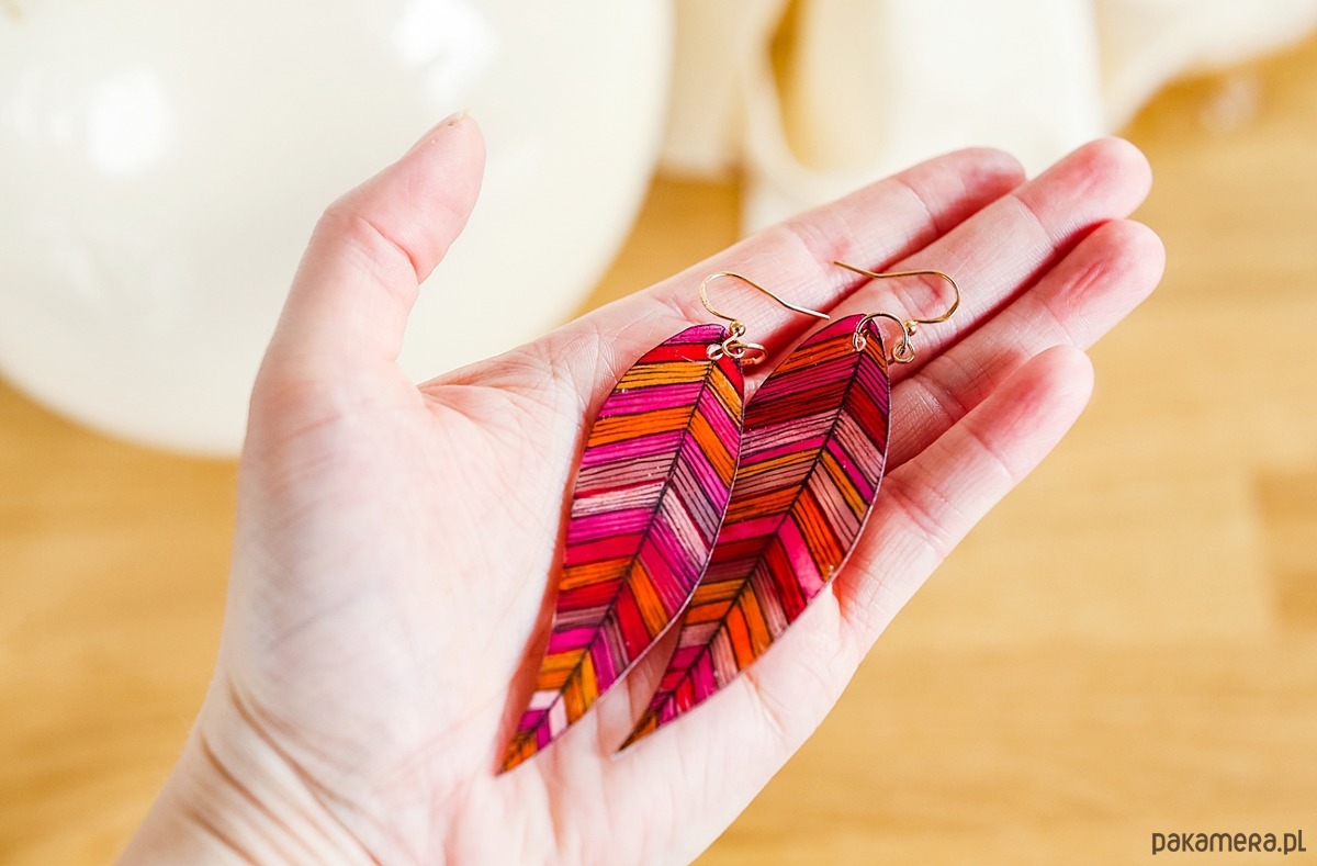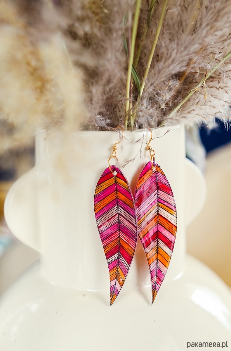Powierzchnia piórek została zabezpieczona kilkoma warstwami błyszczącego lakieru ekologicznego, dzięki czemu kolczyki ładnie mienią się w słońcu.